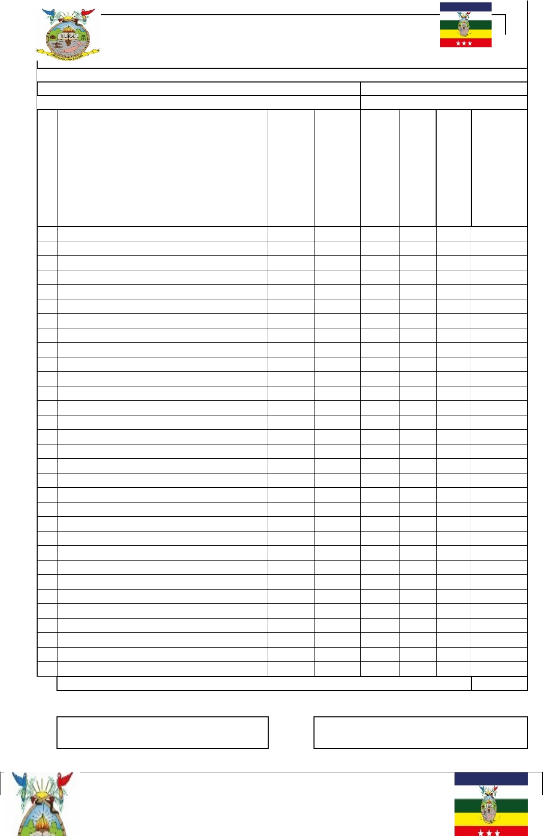 UNIDAD EDUCATIVA “CUYABENO” CÓDIGO AMIE 21H00751 PERIODO LECTIVO 2021 - 2022 REGISTRO DE CALIFICACIONES POR PARÁMETROS - SEGUNDO PARCIAL QUIMESTRE 1 DOCENTE: LIC. JOHANNA BASTIDAS PERIODO LECTIVO: 2021-2022 CURSO: 2DO. BT INFORMÁTICA "B" QUÍMICA N° PARÁMETROS DEBERES: Presentación y materia. RXS QUÍMICAS TAREA INDIVIDUAL: Átomos. LECCIÓN ESCRITA: Moles TAREA GRUAPAL: Proyecto # 03 SUMA TOTAL PROMEDIO DEFINITIVO. 100% 1 AREVALO SISA YOSER JAVIER 7,00 10,00 0,00 8,00 25,00 6,25 2 CAMPOVERDE VELEZ FRANCISCO BARTOLO 7,00 10,00 10,00 8,00 35,00 8,75 3 CEDEÑO ANDI TATIANA MARICELA 0,00 0,00 4 CEDEÑO BELECELA YOMAYRA ALEJANDRA 9,00 10,00 10,00 7,00 36,00 9,00 5 CEDEÑO BONETE MARCO ANTONIO 7,00 10,00 10,00 9,75 36,75 9,19 6 ESPIN ESPIN BRISNEY KASANDRA 10,00 7,00 10,00 9,75 36,75 9,19 7 GOMEZ CHUNCHO ANA GABRIELA 10,00 10,00 10,00 5,00 35,00 8,75 8 GONZALEZ NINABANDA JHON NIXON 9,00 10,00 10,00 5,00 34,00 8,50 9 JARAMILLO BAUTISTA ALEXANDRA ESTEF 0,00 0,00 10 LAPO TACURE NELLY RAQUEL 7,00 10,00 10,00 0,00 27,00 6,75 11 LEMA CHUNCHO ANDERSON SMITH 10,00 8,00 10,00 9,00 37,00 9,25 12 LOPEZ IMBACHI KAREN KATHERINE 10,00 10,00 10,00 8,00 38,00 9,50 13 MACIAS GUERRERO JEFFERSON DAVID 7,00 10,00 10,00 7,00 34,00 8,50 14 MERINO MUÑOZ ENDI TATIANA 10,00 10,00 10,00 9,00 39,00 9,75 15 MORA RUIZ MAYERLIN MISHELL 10,00 10,00 10,00 9,75 39,75 9,94 16 MORETA NARANJO MILENA NAYELI 7,00 10,00 10,00 0,00 27,00 6,75 17 ORDOÑEZ SANCHEZ MILENA ISABEL 7,00 10,00 0,00 7,00 24,00 6,00 18 PALADINES QUIJIJE ALEXIS ALEJANDRO 10,00 10,00 10,00 9,50 39,50 9,88 19 PORTILLA PENAGOS DAYRA EMILY 9,00 9,00 10,00 9,00 37,00 9,25 20 QUIÑONEZ SUAREZ MARYURI JESGENY 0,00 0,00 21 REA CAMPOVERDE ANAHI MAYTE 10,00 10,00 10,00 9,50 39,50 9,88 22 RIVADENEIRA LLORI JHON ALEXANDER 10,00 10,00 10,00 8,00 38,00 9,50 23 RUIZ ANDI JESSICA NOEMI 9,00 10,00 10,00 9,75 38,75 9,69 24 SUANGO QUINCHOA JESENIA ABIGAIL 10,00 10,00 10,00 9,00 39,00 9,75 25 TAPIA GOMEZ DIEGO JHAIR 10,00 10,00 10,00 9,75 39,75 9,94 26 TROYA ORTIZ DAYANA NAYERLY 10,00 10,00 10,00 9,75 39,75 9,94 27 VERDESOTO MORA YOSELYN LIZBETH 10,00 10,00 10,00 9,75 39,75 9,94 28 WILCHES URBANO NIRIS YADIRA 0,00 0,00 0,00 0,00 0,00 0,00 29 YAGUACHI YAGUACHI STIVEN JOEL 7,00 10,00 0,00 8,00 25,00 6,25 30 ZAMBRANO MANZABA JULIANA ANABEL 0,00 0,00 31 ZUMBA HIDALGO HEIDY LIZBETH 10,00 10,00 10,00 9,50 39,50 9,88 PROMEDIO DEL CURSO 7,42 ELABORADO POR: LIC.JOHANNA BASTIDAS LIC.VINICIO ARELLANO DOCENTE DE QUÍMICA VICERRECTOR UNIDAD EDUCATIVA "CUYABENO" CÓDIGO AMIE. 21H00751 PERIODO LECTIVO 2020-2021 CUADRO DE NOTAS CORRESPONDIENTE AL PRIMER QUIMESTRE POR ASIGNATURA DOCENTE: Lic. Johanna Bastidas ASIGNATURA: QUÍMICA CURSO: 2DO B.T INFORMÁTICA "B" N° NÓMINA Primer parcial Segundo parcial Suma 2 parciales Promedio Promedio sobre 80% EXAMEN 1 ER QUIMESTRE Exámen sobre 20%. Nota Quimestral Nota Cualitativa 1 AREVALO SISA YOSER JAVIER 8,29 6,25 14,54 7,27 5,82 9,00 1,80 7,62 A.A.R 2 CAMPOVERDE VELEZ FRANCISCO BAR 8,39 8,75 17,14 8,57 6,86 2,00 0,40 7,26 A.A.R 3 CEDEÑO ANDI TATIANA MARICELA 7,51 0,00 7,51 3,76 3,00 0,00 0,00 3,00 N.A.A.R 4 CEDEÑO BELECELA YOMAYRA ALEJAN 9,44 9,00 18,44 9,22 7,38 7,00 1,40 8,78 A.A.R 5 CEDEÑO BONETE MARCO ANTONIO 9,21 9,19 18,40 9,20 7,36 0,00 0,00 7,36 A.A.R 6 ESPIN ESPIN BRISNEY KASANDRA 8,51 9,19 17,70 8,85 7,08 8,00 1,60 8,68 A.A.R 7 GOMEZ CHUNCHO ANA GABRIELA 8,67 8,75 17,42 8,71 6,97 6,00 1,20 8,17 A.A.R 8 GONZALEZ NINABANDA JHON NIXON 9,48 8,50 17,98 8,99 7,19 8,00 1,60 8,79 A.A.R 9 JARAMILLO BAUTISTA ALEXANDRA ES 8,88 0,00 8,88 4,44 3,55 0,00 0,00 3,55 N.A.A.R 10 LAPO TACURE NELLY RAQUEL 7,74 6,75 14,49 7,25 5,80 5,00 1,00 6,80 P.A.A.R 11 LEMA CHUNCHO ANDERSON SMITH 8,77 9,25 18,02 9,01 7,21 7,00 1,40 8,61 A.A.R 12 LOPEZ IMBACHI KAREN KATHERINE 9,01 9,50 18,51 9,26 7,40 1,00 0,20 7,60 A.A.R 13 MACIAS GUERRERO JEFFERSON DAVID 3,58 8,50 12,08 6,04 4,83 7,00 1,40 6,23 P.A.A.R 14 MERINO MUÑOZ ENDI TATIANA 8,38 9,75 18,13 9,07 7,25 7,00 1,40 8,65 A.A.R 15 MORA RUIZ MAYERLIN MISHELL 8,96 9,94 18,90 9,45 7,56 10,00 2,00 9,56 D.A.R 16 MORETA NARANJO MILENA NAYELI 6,66 6,75 13,41 6,71 5,36 0,00 0,00 5,36 P.A.A.R 17 ORDOÑEZ SANCHEZ MILENA ISABEL 7,55 6,00 13,55 6,78 5,42 2,00 0,40 5,82 P.A.A.R 18 PALADINES QUIJIJE ALEXIS ALEJANDRO 9,00 9,88 18,88 9,44 7,55 5,00 1,00 8,55 A.A.R 19 PORTILLA PENAGOS DAYRA EMILY 8,11 9,25 17,36 8,68 6,94 2,00 0,40 7,34 A.A.R 20 QUIÑONEZ SUAREZ MARYURI JESGENY 0,00 0,00 0,00 0,00 0,00 0,00 0,00 0,00 N.A.A.R 21 REA CAMPOVERDE ANAHI MAYTE 9,67 9,88 19,55 9,78 7,82 10,00 2,00 9,82 D.A.R 22 RIVADENEIRA LLORI JHON ALEXANDER 8,50 9,50 18,00 9,00 7,20 8,00 1,60 8,80 A.A.R 23 RUIZ ANDI JESSICA NOEMI 8,30 9,69 17,99 9,00 7,20 0,00 0,00 7,20 A.A.R 24 SUANGO QUINCHOA JESENIA ABIGAIL 8,86 9,75 18,61 9,31 7,44 7,00 1,40 8,84 A.A.R 25 TAPIA GOMEZ DIEGO JHAIR 9,44 9,94 19,38 9,69 7,75 10,00 2,00 9,75 D.A.R 26 TROYA ORTIZ DAYANA NAYERLY 7,17 9,94 17,11 8,56 6,84 0,00 0,00 6,84 P.A.A.R 27 VERDESOTO MORA YOSELYN LIZBETH 8,88 9,94 18,82 9,41 7,53 2,00 0,40 7,93 A.A.R 28 WILCHES URBANO NIRIS YADIRA 8,74 0,00 8,74 4,37 3,50 0,00 0,00 3,50 N.A.A.R 29 YAGUACHI YAGUACHI STIVEN JOEL 7,74 6,25 13,99 7,00 5,60 5,00 1,00 6,60 P.A.A.R 30 ZAMBRANO MANZABA JULIANA ANAB 7,34 0,00 7,34 3,67 2,94 0,00 0,00 2,94 N.A.A.R 31 ZUMBA HIDALGO HEIDY LIZBETH 9,04 9,88 18,92 9,46 7,57 10,00 2,00 9,57 D.A.R PROMEDIO 8,06 7,42 15,48 7,74 6,19 3,37 0,67 6,86 P.A.A.R ESCALA DE CALIFICACIÓN No. % LIC. JOHANNA BASTIDAS LIC.VINICIO ARELLANO D.A.R 9 -10 4 12,90 A.A.R 7 - 8,99 15 48,39 P.A.A.R 4,01 - 6,99 6 19,35 N.A.A.R 0,01 - 3,99 6 19,35 TOTAL 31 100,00 DOCENTE VICERECTOR UNIDAD EDUCATIVA “CUYABENO” CÓDIGO AMIE. 21H00751 PERIODO LECTIVO 2020-2021 CUADRO DE NOTAS CORRESPONDIENTE AL PRIMER QUIMESTRE POR ASIGNATURA DOCENTE: Lic. Johanna Bastidas ASIGNATURA: QUÍMICA CURSO: 1ERO BT VENTAS E INFORMACIÓN TURÍSTICA "B" N° NÓMINA Primer parcial Segundo parcial Suma 2 parciales Promedio Promedio sobre 80% EXAMEN 1 ER QUIMESTRE Exámen sobre 20%. Nota Quim