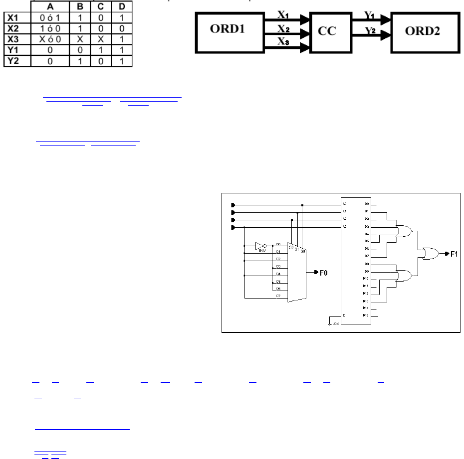 FUNDAMENTOS DE COMPUTADORES Ejercicios U2: Circuitos Combinacionales U2_1. Se desea transmitir las primeras cuatro letras del alfabeto de un ordenador ORD1 a otro ORD2. En el primero, las cuatro letras están codificadas en una palabra de tres bits (X1X2X3) y en el segundo tan sólo en dos, (Y1Y2), según la tabla adjunta. Se pide realizar y dibujar un circuito combinacional que, utilizando sólo puertas NAND, sirva para realizar la conversión de código tal y como muestra la figura. NOTAS: Con una “X” se indica en la tabla que la variable puede tomar cualquier valor entre los posibles. Notar que la letra “A” tiene dos posibles codificaciones, 01X o 100. Solución: Y1 = EEEEA A ( X1 . A X2 A) A. A (A X2 A. X3) AE Y2 =EEA A X1 . X2 A. A X1 . X3 AE U2_2. Dado el circuito de la figura, formado por un decodificador 4-16 y un multiplexor 8-1, se pide: a) Deducir la tabla de la verdad del sistema b) Simplificar las funciones lógicas F1 y F0 c) Obtener expresiones que utilicen sólo puertas XOR y algún inversor si es necesario para F0 y sólo puertas NAND para F1 Solución: a) F0 = Σ m (0,3,5,6,9,10,12,15); F1 = Σ m (1,3,5,7,8,9,12,13) b) F0= A B C D + A B C D + A B C D + A B C D + A B C D + A B C D + A B C D + A B C D F1 = AD + AC c) F0 = A (A ⊕ B ⊕ C ⊕ D)E A F1 = AC AD D C B A FUNDAMENTOS DE COMPUTADORES Ejercicios U2: Circuitos Combinacionales U2_3. Se aplican secuencialmente los números BCD al conversor BCD-Decimal de la siguiente figura (la activación de las salidas es a nivel BAJO): Dibujad un diagrama de tiempos que muestre cada salida en relación con el resto de las señales de salida y con las entradas (suponed A0 LSB y A3 MSB del BCD). Solución: FUNDAMENTOS DE COMPUTADORES Ejercicios U2: Circuitos Combinacionales A B C Z U2_4. Suponga que el codificador lógico decimal-BCD de la siguiente figura tiene las entradas 3 y 9 a nivel ALTO. ¿Cuál es el código de salida? ¿Es éste un código BCD válido? Solución: A3A2A1A0 = 1011. Código BCD no válido. U2_5. Suponga que tenemos un multiplexor como el de la figura siguiente, en el que sus entradas S0 y S1 se secuencian como se muestra al final de la misma figura en el diagrama de tiempos. Determine la onda de salida cuando las líneas contienen: D0 = D3 = 0, D1 = D2 = 1. Solución: U2_6. Escriba el circuito de la figura: a) Utilizando sólo puertas NAND. b) Utilizando sólo puertas NOR. Solución: a) Z = EEEA A AC AA AB AA BC AE A b) Z = EEEEEEEEEEA A A A A A+A C A AA A A A+A B A AA A B A+A C A A AE FUNDAMENTOS DE COMPUTADORES Ejercicios U2: Circuitos Combinacionales VCC a b c d e f g U2_7. Utilizando tablas de Karnaugh, calcular las 7 expresiones lógicas correspondientes a cada uno de los segmentos de un visualizador que utilice entradas BCD (siendo D3 el bit MSB y D0 el LSB) activas en alto y que active los elementos del visualizador en alto. Solución: U2_8. Utilizando un multiplexor 4-1, se pide realizar un circuito que cumpla la función: a) Z= AB + AC + A B C b) Z= A B + AD + CD + A D NOTA: Añadir alguna puerta si fuera necesario. Utilizar las variables A y B como control. Solución: BCD D3 D2 D1 D0 a b c d e f g a = D3 + D1 + D2D0 + D2 b = D1D0 + D2 + D1 D0 c = D1 + D2 + D0 d = D3 + D1 D0 + D2 D0 + D2 D1+D2 D1 D0 e =D1 D0 + D2 D0 f = D3 + D1 D0 + D2 D1 + D2 D0 g = D3 + D1 D0 + D2 D1 + D1 D0 0 0 0 0 0 1 1 1 1 1 1 0 1 0 0 0 1 0 1 1 0 0 0 0 2 0 0 1 0 1 1 0 1 1 0 1 3 0 0 1 1 1 1 1 1 0 0 1 4 0 1 0 0 0 1 1 0 0 1 1 5 0 1 0 1 1 0 1 1 0 1 1 6 0 1 1 0 1 0 1 1 1 1 1 7 0 1 1 1 1 1 1 0 0 0 0 8 1 0 0 0 1 1 1 1 1 1 1 9 1 0 0 1 1 1 1 1 0 1 1 10 1 0 1 0 X X X X X X X 11 1 0 1 1 X X X X X X X 12 1 1 0 0 X X X X X X X 13 1 1 0 1 X X X X X X X 14 1 1 1 0 X X X X X X X 15 1 1 1 1 X X X X X X X FUNDAMENTOS DE COMPUTADORES Ejercicios U2: Circuitos Combinacionales 7 6 5 4 3 2 1 0 S2 S1 S0 A B C S D GND Vcc U2_9. Obtenga la función S (A,B,C,D) = Σm(2,3,5,6,9,10,13,14,15) a) Utilizando un multiplexor de 16 entradas b) Utilizando un multiplexor de 8 entradas c) Utilizando un multiplexor de 4 entradas Añadir en cada caso el mínimo número de puertas lógicas necesarias, utilizando en cada caso las variables de más peso como control. b) c) Solución: a) FUNDAMENTOS DE COMPUTADORES Ejercicios U2: Circuitos Combinacionales U2_10. Dado el circuito de la figura, se pide realizar la misma función lógica utilizando un multiplexor 8-1 y el mínimo número de puertas lógicas necesarias, utilizando las variables A, B y C como control. U2_11. Un cierto circuito lógico con 4 variables de entrada A, B, C, y D sirve para resolver las funciones lógicas F y G. La función F vale '1' siempre que valgan '1' dos o más señales de la entrada, en otro caso F vale '0'. La función G vale '1' siempre que valga '1' un número par de señales de la entrada, en otro caso G es el complemento de F. Se pide: a) Diseñar un circuito para la función F que utilice un decodificador 4-16, con salidas activas a nivel bajo y el mínimo número de puertas lógicas necesarias b) Diseñar un circuito para las función G que utilice únicamente un multiplexor 8-1 y el mínimo número de puertas lógicas necesarias c) Diseñar un circuito para las funciones F y G que utilice el mínimo número de puertas utilizando sólo puertas NAND Utilizar las variables más representativas como control. G Solución: Solución: FUNDAMENTOS DE COMPUTADORES Ejercicios U2: Circuitos Combinacionales U2_12. Implemente la función F(A,B,C,D) = Σm(4,5,6,7,8,13,14,15), utilizando un multiplexor 4-1 y el mínimo número de puertas lógicas. Utilizad las variables de más peso como control. U2_13. Se desea realizar la misma función lógica de 5 variables que realiza el circuito de la figura, pero utilizando un multiplexor 8-1. Utilizad las variables C, D y E como líneas de control de mayor a menor peso respectivamente. Solución: Solución: FUNDAMENTOS DE COMPUTADORES Ejercicios U2: Circuitos Combinacionales U2_14. Dada la función de tres variables F = (A ⊕ B ) (C + B ), se pide