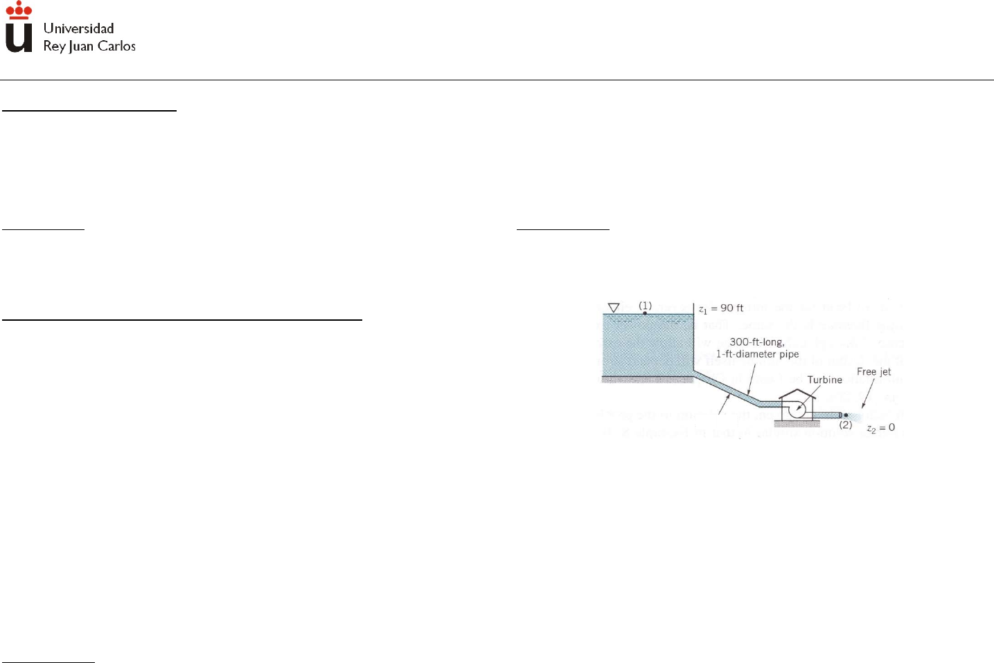 INGENIERÍA DE FLUIDOS (2019-20) 2º CURSO GRADO INGENIERÍA QUÍMICA 1 TEMA 3: FLUJO INTERNO PROBLEMA Nº1 ¿Qué diámetro de tubería será necesario utilizar para transportar 0,0222 m3/s de un fueloil pesado a 16ºC si la perdida de carga de que se dispone en 300 m de longitud de tubería horizontal es de 6,7 m? DATOS Y NOTAS: Viscosidad cinemática = 2,05 10-4 Densidad relativa = 0,912. Supóngase régimen de flujo laminar. TEMA 4: FLUJO INTERNO: FLUIDO INCOMPRESIBLE PROBLEMA Nº2 Un depósito de seguridad de 1000 m3 de agua debe estar preparado para abastecer, simplemente por gravedad, de agua de refrigeración, a una determinada instalación con riesgo explosivo en caso de fallo de la corriente eléctrica que alimenta las bombas. El depósito se encuentra a 100 m de distancia del punto de refrigeración al que debe alimentar con un caudal inicial de 100 L/s a una presión de 2 atm. El depósito se encuentra abierto a la atmósfera en su parte superior y el nivel de agua es de 3 m. El diámetro de la tubería de descarga es de 25 cm y su rugosidad de 2,5·10-3 cm. Calcular: a) La altura a la que debe estar la superficie del depósito considerando que su nivel se mantiene constante (téngase en cuenta que la tubería consiste en un tramo horizontal de 100 m de longitud, un codo de 90° de radio medio y el tramo de tubería vertical necesario, siendo la unión entre la tubería y el tramo de tubería vertical necesario). b) El diámetro de tubería necesario para proporcionar los 100 L/s si el depósito ya se encuentra instalado, con una altura total y constante en su superficie de 15 m. DATOS Y NOTAS: Longitud equivalente del codo de 90°: 37,5 diámetros Densidad del agua: 1000 kg/m3 Viscosidad del agua: 1 cp PROBLEMA Nº 3 (Propuesto) La turbina mostrada en la figura adjunta aprovecha 50 hp del agua que fluye a su través. Se supone que la tubería, de 1 ft de diámetro y 300 ft de longitud, tiene un factor de fricción de 0,005 y que las pérdidas menores son despreciables. Determine el caudal que fluye a través de la tubería y la turbina. DATOS Y NOTAS: Peso específico del agua (50°F) = 62,4 lb/ft3 PROBLEMA Nº4 Se desea alimentar un tanque agitado con un caudal de 3 m3/h de un concentrado de zumo de naranja procedente de un depósito elevado, tal y como se muestra en la figura. Ambos depósitos se encuentran a presión atmosférica y la tubería que los conecta es lisa con un diámetro interno de 4 cm. Determinar si es necesario el uso de una bomba para conseguir transportar el caudal de fluido necesario. En caso afirmativo, calcular la potencia teórica de la bomba. f=0.005 INGENIERÍA DE FLUIDOS (2019-20) 2º CURSO GRADO INGENIERÍA QUÍMICA 2 DATOS Y NOTAS: Propiedades del concentrado de naranja: =1.200 kg/m3; k=5,5 N/m2·sn; n=0,6 Pueden considerarse despreciables las pérdidas menores. PROBLEMA Nº5 (Propuesto) Se utiliza una conducción de 24 pulgadas de diámetro interno para el transporte de 300000 barriles/día de petróleo, desde Longview (Texas) hasta la costa del Este, a una distancia de 2250 km. El petróleo se transporta mediante bombas centrífugas situadas a intervalos iguales a lo largo de la conducción. Cada bomba se acciona por un motor eléctrico de 1500 C.V. Calcular: a) El número de grupos bomba-motor requeridos b) La distancia entre las bombas c) La presión de descarga de cada bomba d) El coste actual del transporte en pesetas/barril - Datos y notas: La caída de presión debido a pérdidas menores y a diferencias de elevación puede considerarse despreciable. Densidad del petróleo : 870 kg/m3: Viscosidad: 10 cP La conducción es de hierro colado Rendimiento de los motores: 95% Rendimiento de las bombas: 75% Presión de admisión en cada bomba: 1 atm. Coste de la energía eléctrica: 0.09 euros/kwh 1 barril = 160 L. PROBLEMA Nº6 Dos depósitos con agua (A y B) están conectados por el siguiente sistema de tuberías en serie: Una primera tubería (1), conectada al depósito A, con un diámetro de 50,8 cm y 2440 m de longitud. Además tiene una válvula de compuerta abierta y 5 codos de 90º de radio medio. Una segunda tubería (2) con un diámetro de 40,6 cm y 1830 m de longitud. Una tercera tubería (3) con una longitud de 610 m. Si el nivel del depósito A se encuentra situado 26 m por encima del depósito B calcule: a) ¿Cuál es el diámetro de la tercera tubería si se está trasvasando un caudal de agua de 197 L/s? b) Si el diámetro de la tercera tubería es de 35 cm, calcule el caudal de agua trasvasado si al cabo de un tiempo se instala una cuarta tubería en paralelo con las tuberías 2 y 3 (conectada al extremo de la primera tubería y al depósito B. Esta tubería tiene un diámetro de 30 cm y una longitud de 3000 m. Desprecie en este apartado las perdidas menores. DATOS Y NOTAS: Todas las tuberías son de acero comercial. PROBLEMA Nº7 Durante la reparación de una avería en la red de suministro de agua a la urbanización “Casas Viejas” los operarios del consorcio de aguas descubrieron que la red de suministro, que inicialmente se creía que consistía en una única tubería instalada cuando se construyó la urbanización a principios del siglo XX, consiste en un sistema de tres tuberías en paralelo, como indica el esquema adjunto. Tras indagar en los archivos antiguos del consorcio se ha descubierto que este sistema es el resultado de varias reparaciones efectuadas en los años 1927, 1955 y 1970, de aquí la variedad de dimensiones y materiales empleados en la construcción de las tuberías. Con el fin de documentar detalladamente el estado de la red de suministro, debe calcularse la caída de presión entre los puntos 1 y 2, y el caudal que circula por cada una de las tuberías, sabiendo que el caudal que indica el indicador de flujo instalado en las tuberías A y E es 1,15 m3/s (lo cual indica que el sistema es completamente estanco). 1 atm 1 atm D = 4 cm 10 m 10 m 50 m 30 m 1 atm 1 atm D = 4 cm 10 m 10 m 50 m 30 m INGENIERÍ