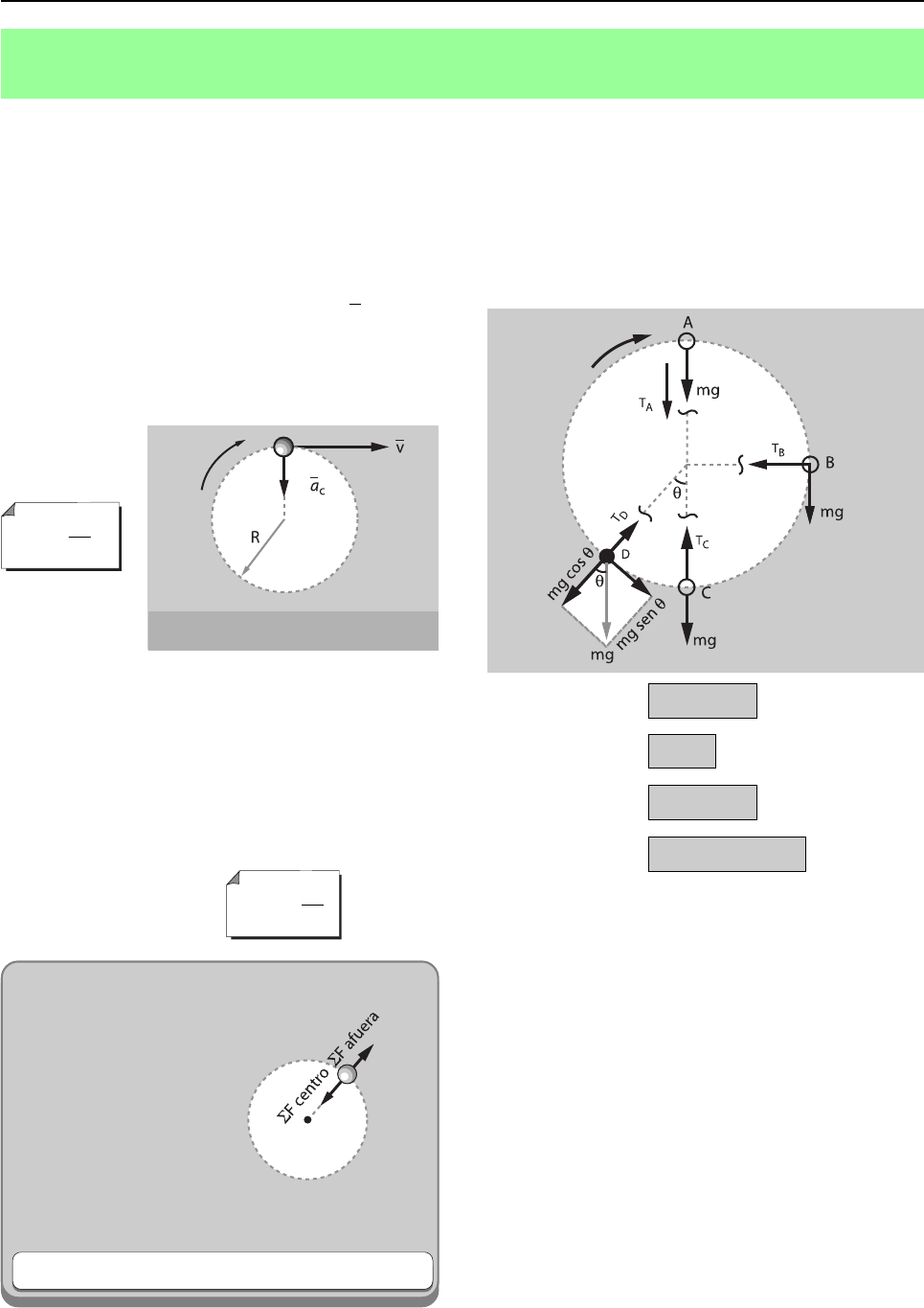 Jorge Mendoza Dueñas174 Concepto Es una parte de la mecánica que estudia las condi- ciones que deben cumplir una o más fuerzas que actúan sobre un cuerpo, para que éste realice un movimiento circular. DINÁMICA CIRCULARDINÁMICA CIRCULARDINÁMICA CIRCULARDINÁMICA CIRCULARDINÁMICA CIRCULAR FUERZA CENTRÍPETFUERZA CENTRÍPETFUERZA CENTRÍPETFUERZA CENTRÍPETFUERZA CENTRÍPETAAAAA Es la resultante de todas las fuerzas radiales que ac- túan sobre un cuerpo en movimiento circular y vie- ne a ser la responsable de obligar a dicho cuerpo a que su velocidad cambie contínuamente de direc- ción , dando origen a la aceleración centrípeta. ac v R = 2 ACELERACIÓN CENTRÍPETACELERACIÓN CENTRÍPETACELERACIÓN CENTRÍPETACELERACIÓN CENTRÍPETACELERACIÓN CENTRÍPETA (A (A (A (A (a C ))))) Es una magnitud vectorial que mide la rapidez con la cual cambia de dirección el vector velocidad. áF mc c= a F m v Rc = 2 La fuerza centrípeta no es una fuerza real como el peso, reac- ción, tensión, etc., es más bien una resul- tante de las fuerzas en la dirección del radio en cada instante. Siendo así, dicha fuerza se pue- de representar de la siguiente manera: Fuerza Centrípeta: Resultante de Fuerzas Radiales CASOS COMUNES Analicemos el diagrama de cuerpo libre de un mó- vil en movimiento circular en cuatro posiciones: A,B,C y D, luego determinemos la fuerza centrípeta en cada posición. Fc = Σ fuerzas hacia el centro - Σ fuerzas hacia afuera En el punto “A”: En el punto “B”: En el punto “C”: En el punto “D”: FUERZA CENTRÍFUGAFUERZA CENTRÍFUGAFUERZA CENTRÍFUGAFUERZA CENTRÍFUGAFUERZA CENTRÍFUGA (SEUDO(SEUDO(SEUDO(SEUDO(SEUDO-FUERZA)FUERZA)FUERZA)FUERZA)FUERZA) Esta “Fuerza” es mencionada en muchos libros, pero realmente no existe. Muchas personas afirman que la fuerza centrífuga existe en algunos casos y se manifiesta como la reacción de la fuerza centrípeta (acción); sin em- bargo, todos sabemos que la tercera ley de Newton (acción y reacción) sólo se cumple para fuerzas rea- les (peso , reacción, tensión, etc) y no para resultan- tes de varias fuerzas. Muchos manifiestan que la fuerza centrípeta es la que jala al cuerpo hacia el centro del circulo y la centrífuga es la que jala hacia fuera del círculo; en realidad esto es falso. F mg Tc A= + F Tc B= F T mgc C= − F T mgc D= − cos θ La aceleración centrípeta se representa mediante un vector dirigido hacia el centro del circulo. Dinámica 175 − Un disco acoplado a un motor. − Un medidor de frecuencia (R.P.M.) − Un cilindro de aproximadamente 1 m de diá- metro y una altura no mayor de 50 cm. − Un borrador (determinar su peso en kg) NOTA Cuando se representa el diagrama de cuerpo libre, el lector no dibujará la fuerza centrípeta y menos aún la “fuerza centrífuga”. ILUSTRACIONES EXPERIENCIA: DINÁMICA CIRCULAR Demostrar que la fuerza centrípeta obliga a un cuerpo a describir como trayectoria una circunferencia. OBJETIVO MATERIAL A EMPLEARSE NÚMERO DE ALUMNOS: Dos 1.- Colocar los materiales según la figura mostrada. PROCEDIMIENTO 2.- Colocar el borrador en la pared interna del ci- lindro, observar. 3.- Activar el disco lentamente. Jorge Mendoza Dueñas176 4.- Colocar el borrador en la pared interna del ci- lindro, observar. 5.- Si el borrador ha caído, aumentar la frecuen- cia del disco, para luego volver a colocar el borrador en la posición mostrada. 6.- Repetir el paso 5 hasta que el borrador no caiga. 7.- Conseguido el objetivo, anotar la frecuencia del disco (R.P.M.) 8.- Repetir todo el proceso cuatro veces más. PREGUNTAS 1.- Completar la tabla 2.- Cuando el disco se encuentra estático y colo- camos el borrador en la pared interna, ¿Por qué cae? hacer su diagrama de cuerpo libre. 3.- Cuando el disco gira lentamente y colocamos el borrador en la posición indicada, ¿Por qué cae? hacer su diagrama de cuerpo libre. 4.- Cuando el disco gira lo suficiente para que el borrador permanezca en su posición inicial. ¿Por qué no cae? se le ayudará proporcionán- dole el diagrama de cuerpo libre del borrador. 5.- ¿Será la fuerza centrípeta la reacción normal que empuja al borrador hacia el eje del cilin- dro? Si - No. 6.- ¿Cuánto vale dicha fuerza centrípeta? (en tér- minos de m = masa del borrador) recordar Fc = mv 2/R. 7.- Sabemos que la fuerza de rozamiento se cal- cula f = µN. Si el cilindro no gira, entonces no hay fuerza centrípeta, luego la normal sería cero (N = 0). ¿Hacia donde iría el borrador?, ¿Por qué? ¿Describiría una circunferencia como trayectoria? 8.- En el momento que el borrador no cae, a que es igual la fuerza de rozamiento. A) mg D) 4mg B) 2mg E) 5mg C) 3mg 9.- Calcule el coeficiente µs entre el borrador y el cilindro. 10.- ¿Es posible que el borrador suba cuando el cilindro gira? experimente y comente. f(RPM) f(RPS) ω = 2πf (rad/s) v = ωR (m/s) 1° vez 2° vez 3° vez 4° vez 5° vez Promedio Dinámica 177 Fuerza eFuerza eFuerza eFuerza eFuerza externaxternaxternaxternaxterna Fuerza Externa: Para que la carreta se mueva, es nece- sario la presencia de una fuerza externa, en el presente caso dicha fuerza se activará por intermedio del caballo. Fuerza internaFuerza internaFuerza internaFuerza internaFuerza interna Fuerza Interna: La niña trata de mo- ver el coche, no cumplirá su cometi- do ya que F es una fuerza interna. Fuerza centrípetaFuerza centrípetaFuerza centrípetaFuerza centrípetaFuerza centrípeta Las personas dentro de “la montaña rusa” en movimiento perciben diferentes sensaciones en su paseo circular, debido a la variación contínua de la fuerza centrípeta. Evidentemente las sensaciones más extraor- dinarias se producen en la parte más alta y baja del aparato dado que son los puntos en donde la fuerza centrípeta alcanza valores extremos. La fuerza centrífugaLa fuerza centrífugaLa fuerza centrífugaLa fuerza centrífugaLa fuerza centrífuga La Fuerza Centrífuga: Siempre que accionamos la licuadora para hac