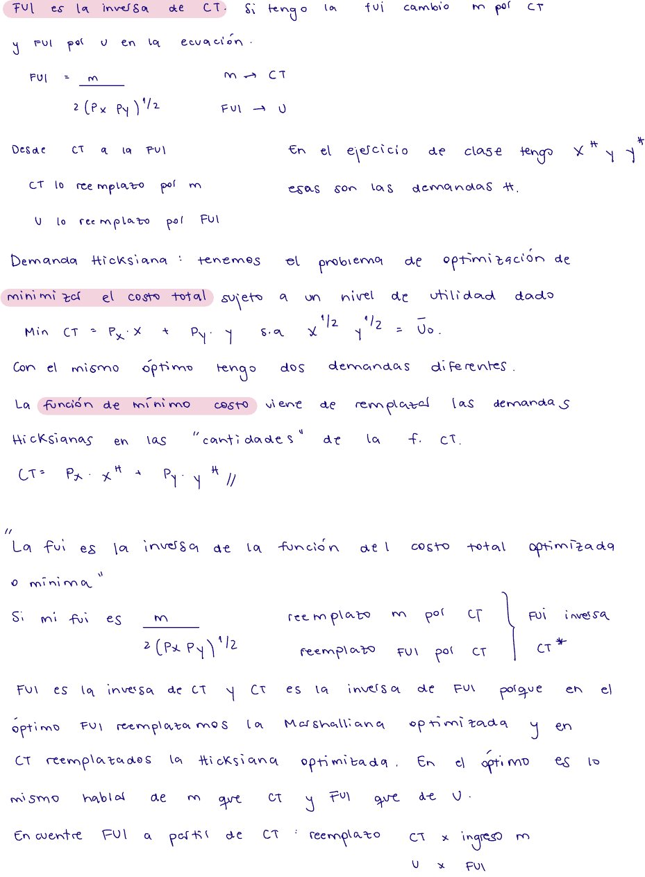 FUI es la inversa de CT Si tengo la fui cambio m por CT y FUI por u en la ecuación FUI m m CT 2 PxPy 12 Fui U Desde CT a la FUI En el ejercicio de clase tengo y y CT lo reemplazo por m esas son las demandas H U lo reemplazo por FUI Demanda Hicksiana tenemos el probiema de optimizaciónde minimizar el costo total sujeto a un nivel de utilidad dado Min CT Px X Py y g a 2 y 2 Jo Con el mismo Óptimo tengo dos demandas diferentes La función de mínimo costo viene de remplazar las demandas Hicksianas en las cantidades de la f CT Ts Pp PyoyHy La fui es la inversa de la función del costo total Optimizada mínima si mi fui es m reemplazo m por 4 Pyle reemplazo µ po c FÍ FUI es la inversa deCT y CT es la inversa de Ful porque en el Óptimo FUI reemplazamos la Marshalliana optimizada y en CT reemplazados la Hicksiana optimizada En el óptimo es lo mismo hablar de m que CT y FUI que de V Encuentre FUI a partir de CT reemplazo CT ingreso m U x FUI elniveldeutilidada lo largodeestacurvano semantieneconstante meubicoacá La utilidad se Apxdisminuye lapendiente mantiene constante Jo 11 ma a ubicar mequedoacá acállego angemeau Fui reemplazado en laHicksiana primal Dual dalaMarshalliana CTreemplazado en laMarshalliana dalaHicksiana m dFUIIgp Roy Nos permite llegar de fui a la demanda Marshalliana yFUI ym En su Shepard Nos permite llegar a la demanda Hicksiana a partir de la función de mínimo costo Ejercicio clasea oct FUI m 2Pts Identidad de Roy 2 PxPy 1 2 con µ la deriva XM dFUI la px M y respecto a PX dFUI 1dm 2Pa 42 px 32 2 de la 1 2PyYa m n mx 2pts L Shepard OCT La 2 U R 2 px Spx 42va 3 sepuedellegar a la demanda marshalliana a partir de la demanda Hicksiana y la FUI reemplazando U FUI 4 Puedo llegar a la demanda hicksiana a partir de la demanda marshalliana y la F Min costo reemplazando m Cr Demandamarshaliana disminuye el precio de un bien la Rp pendiente disminuye os trasladamos a una curva de utilidad superior Baja el recio y aumenta la cantidad A lo largo de la demanda argualiana la utilidad no se mantiene constante Demanda hicksiana La utilidad se mantiene constante Jo Al disminuir Pr la RP ambia Nos ubicamos en un punto con los nuevos precios en con el mismo nivel de utilidad Identidad de Roy 11204 puedo llegar a la demanda marsha liana con la FUI JV es la derivada de Ful FUIXm 8 2px FUI JFUI ypx gm del jm con el lema de Shepard llego a la demanda Hicksiana con la f de mínimo costo deriva la función de costo respecto al precio vamos de costos q demanda Hicksiang JCT spx Ambas vienen del teorema del envolvente FUI i m M 2 PxPy 1 2 Deriva Px Í px Roy dFUI lapx M Zp y 42 px 3 2 2 dFUI 1dm 1 2 Py1 2 px1 2 M m 2Px FUI reemplazado en la Hicksiana me da la Marshaliana 3 CT reemplazado en la Marshalliana me da la Hicksiana Efecto sustitución si cambia el precio del b en como cambia a utilidad consumida mantiene utilidad constante si aumenta el precio disminuye cantidad consumidor Es LO tix LX Hayrelación con la demanda Hicksiana Es negativo vfecto ingreso ante cambio de precios como cambia mi poder dquisitivo EI 2 1 No tiene signoJm El sentido del efeto ingreso depende del tipo del bien Bien normal EI 30 también llamado superiol 3ien inferior EI LO 3ien neutro EI O DMarshall ana considera ambos efectos D Hicksiana considera solo efecto sustitución Jo sara encontró la DMarshaIliana en el gráfico del bien normal Para saber cual es más elástica tengo que ver el efecto y el tipo de bien A PX puedosaltar decurva gráficos porque nohaynivelde utilidad fija BienNormal EI 1 si A px iY A px Dtpoder adquisitivo 9 1Es si Apx px van enlamismadirección Marshaliana va desde A hasta c Hicksiana va desde Ahasta B Marshaliana es más elástica que la Hicksiana para bienes Normales En los distintos bienes lo que más inflige es el efecto ingreso BienNormal i marshalliana más elástica se demuestra Bien inferior ansiamos más elástica en base q Bien neutro coinciden gráficos A C B La demanda Hicksiana aumenta en toda la magnitud del efecto sustitución porque solo considera ese efecto El efecto ingreso en los bienes inferiores al aumentar el ingreso disminuye la cantidad consumida de los bienes inferiores La Marshalliana en los bienes interiores considera ambos efectos por un lado aumentó por efecto sustitución la cantidad consumida hasta luego tenemos que de y disminuyó la cantidad consumida La demanda Hicksiana va a tener un aumento mayor que la demanda Marsnaliano EI 1 Es El punto C se ubica 0 al medio de A y B 0 bien a la izquierda de A en un caso que el ES 30 L EI Si punto C está a la izquierda de A el EI 7 ES A la derecha de 13 va a ubicarse si es un bien normal eso significa que el Es va en la misma dirección del EI Si ante A Px el EI es 7 91 ES al A Pt 19 A cantidad consumida va a primar eso nos da una demanda con pendiente positiva Demanda con pendiente positiva es cuando el El 2 ES 10 supera pasamos el punto A esos son bienes Giffen Bienes neutros las elasticidades de las demandas coinciden Como el electo ingreso en los bienes neutros coinciden ambas demandas Ecuación de Slutsky Explica todo lo anterior matemáticamente Relación 4 parte del supuesto que si reemplazo CT en la Hicksiana obtengo DMarshalliana Xt Px Py u XM Px Py CTCPx.py.li IX 211M DXM spx Spx JCT 2Pts Demanda Hicksiana Lema Shepard Shepard y reemplazo m por CT gps M itZX JXM iz X.la Spx Spx dm d Pendiente Hicksiana t E sustitución E ingreso es 0 porque no negativo etiste Si despejo Spx M H H2X 2X 2X Xt Marshallanos considera ambos Jpx zp dm efectos ET Es EI O puede ser O O Ó D depende del bien Elasticidad E Precio propia de la demanda corresponde al cambio porcentual en la cantidad demandada del bien ante un cambio porcentual en el precio del mismo bien M px A X thnx A1 px Junpx pr po dp Po Pdpdp Xr xa pDX Xo Xv Mx px Al DX DXPxA1 p pe p X apapPo I en en p den p denp 1 DX X pdp Los divido den DX a g a ln p P den DX Pdemp dio dp M X px P E Cruzada de la demanda corresponde al cambio porcentual en la cantidad dema