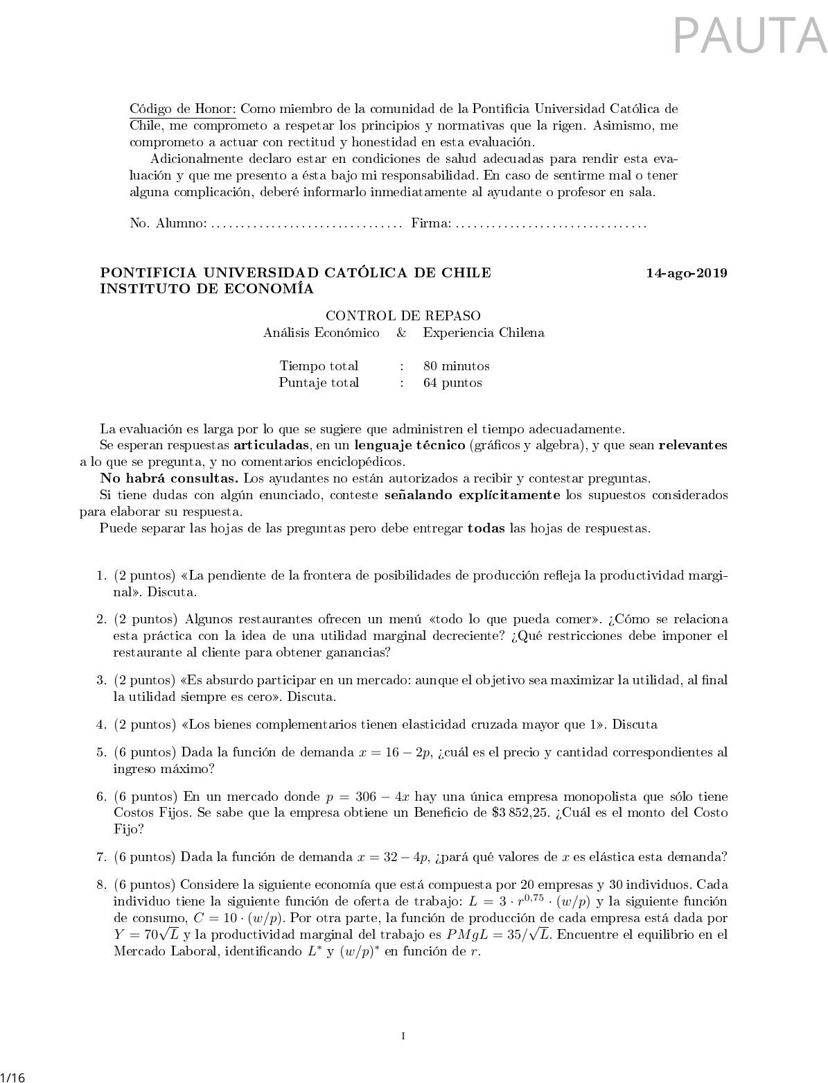 Código de Honor: Como miembro de la comunidad de la Ponti�cia Universidad Católica de Chile, me comprometo a respetar los principios y normativas que la rigen. Asimismo, me comprometo a actuar con rectitud y honestidad en esta evaluación. Adicionalmente declaro estar en condiciones de salud adecuadas para rendir esta eva- luación y que me presento a ésta bajo mi responsabilidad. En caso de sentirme mal o tener alguna complicación, deberé informarlo inmediatamente al ayudante o profesor en sala. No. Alumno: . . . . . . . . . . . . . . . . . . . . . . . . . . . . . . . . Firma: . . . . . . . . . . . . . . . . . . . . . . . . . . . . . . . . PONTIFICIA UNIVERSIDAD CATÓLICA DE CHILE 14-ago-2019 INSTITUTO DE ECONOMÍA CONTROL DE REPASO Análisis Económico & Experiencia Chilena Tiempo total : 80 minutos Puntaje total : 64 puntos La evaluación es larga por lo que se sugiere que administren el tiempo adecuadamente. Se esperan respuestas articuladas, en un lenguaje técnico (grá�cos y algebra), y que sean relevantes a lo que se pregunta, y no comentarios enciclopédicos. No habrá consultas. Los ayudantes no están autorizados a recibir y contestar preguntas. Si tiene dudas con algún enunciado, conteste señalando explícitamente los supuestos considerados para elaborar su respuesta. Puede separar las hojas de las preguntas pero debe entregar todas las hojas de respuestas. 1. (2 puntos) �La pendiente de la frontera de posibilidades de producción re�eja la productividad margi- nal�. Discuta. 2. (2 puntos) Algunos restaurantes ofrecen un menú �todo lo que pueda comer�. ¾Cómo se relaciona esta práctica con la idea de una utilidad marginal decreciente? ¾Qué restricciones debe imponer el restaurante al cliente para obtener ganancias? 3. (2 puntos) �Es absurdo participar en un mercado: aunque el objetivo sea maximizar la utilidad, al �nal la utilidad siempre es cero�. Discuta. 4. (2 puntos) �Los bienes complementarios tienen elasticidad cruzada mayor que 1�. Discuta 5. (6 puntos) Dada la función de demanda x = 16− 2p, ¾cuál es el precio y cantidad correspondientes al ingreso máximo? 6. (6 puntos) En un mercado donde p = 306 − 4x hay una única empresa monopolista que sólo tiene Costos Fijos. Se sabe que la empresa obtiene un Bene�cio de $3 852,25. ¾Cuál es el monto del Costo Fijo? 7. (6 puntos) Dada la función de demanda x = 32− 4p, ¾pará qué valores de x es elástica esta demanda? 8. (6 puntos) Considere la siguiente economía que está compuesta por 20 empresas y 30 individuos. Cada individuo tiene la siguiente función de oferta de trabajo: L = 3 · r0,75 · (w/p) y la siguiente función de consumo, C = 10 · (w/p). Por otra parte, la función de producción de cada empresa está dada por Y = 70 √ L y la productividad marginal del trabajo es PMgL = 35/ √ L. Encuentre el equilibrio en el Mercado Laboral, identi�cando L∗ y (w/p)∗ en función de r. i PAUTA 1/16 9. (8 puntos) En 1796, Gottfried Christoph Härtel, un editor de música alemán, calculó el costo de imprimir música usando una tecnología de placa grabada y utilizó estas funciones de costo para tomar decisiones de producción. Härtel pensó que el costo �jo de imprimir una página musical -el costo de grabar las planchas- era de 900 pfennings. El costo de cada copia adicional de la página era de 5 pfennings. a) (4 puntos) Identi�que las funciones de costo total, costo total medio, costo variable medio y costo marginal. b) (4 puntos) Härtel utilizó sus datos para hacer el siguiente análisis. Supongamos que espera vender exactamente 300 copias de una composición a 15 pfennings por página de la composición. ¾Cuál es el monto máximo que el editor está dispuesto a pagar al compositor por página de la composición? 10. (12 puntos) Una �rma produce y vende un bien en un mercado perfectamente competitivo. Ud. identi�ca su función de costo variable medio como CVMe = 10+X y la de costo marginal como CMg = 10+2X, donde X es la cantidad producida del bien. Suponga que la �rma tiene un costo �jo de 56,25 unidades monetarias. a) (6 puntos) Suponga que en el mercado participan 10 �rmas, todas iguales en cuanto a costos y capacidad de producción. La función de demanda en el mercado es P = 100 −X, donde X es la cantidad demandada. Calcule la máxima ganancia que podría obtener la �rma y la cantidad de X que debería producir y vender. b) (3 puntos) Dibuje en un grá�co el equilibrio de mercado. c) (3 puntos) ¾Debe la �rma seguir o no en este mercado? Justi�que su respuesta. 11. (12 puntos) Ud. tiene una �rma dedicada a sellar sobres (pegar estampillas en el sobre), Ud. contra- ta trabajadores para que sellen los sobres, cada trabajador gana $5 por hora y sella 50 sobres por hora. Suponga además que Ud. tiene un espacio gratuito ilimitado y, por lo tanto, puede agregar tan- tos trabajadores como desee sin disminuir la productividad. No tiene otros gastos que pagar a los trabajadores. a) (7 puntos) Dibuje el producto total, el producto marginal, el producto medio, el costo total, el costo medio, el costo variable medio y el costo marginal. b) (5 puntos) Suponga que ahora Ud. arrienda una máquina de estampado con capacidad ilimitada, por $10 por hora. Esto hace posible que los trabajadores aumenten su producción a 100 sobres sellados por hora. Dibuje el nuevo producto total, producto marginal, producto medio, costo variable medio y costo marginal. ii PAUTA 2/16 Estimados correctores: Asignen puntaje de acuerdo a lo indicado. No den puntaje por relleno. Si la pregunta no se responde, el puntaje correspondiente es cero. Respuesta en blanco versus respuesta incorrecta [esta diferencia es importante para el cálculo posterior de los puntajes] En la prueba En la planilla En Blanco se dibuja una línea vertical a lo largo del espacio de respuesta se anota X (equis mayuscula) Incorrecta se marcan los errores en la respuesta se anota 0 (cero) Errore