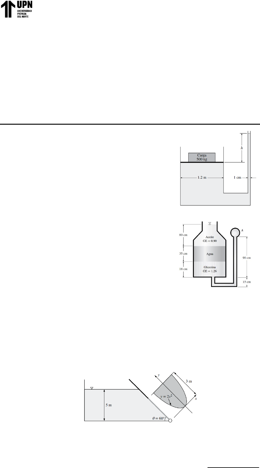 28 de mayo de 2022 PRÁCTICA N° 3 Facultad: Ingeniería Carrera Profesional: Ingeniería Civil Ciclo: 6° CURSO: MECÁNICA DE FLUIDOS Unidad: Desarrolla problemas de Ecuación General Estática Desarrollar los siguientes ejercicios y cargar en el gestor de práctica de campo el desarrollo de los ejercicios, en formato PDF. Solo el delegado subirá los trabajos. 1. Se va a levantar una carga de 500 kg que está sobre el elevador hidráulico que se muestra en la figura mostrada, vertiendo aceite (ρ = 780 kg/m 3) en un tubo delgado. Determine cuál debe ser la altura h para empezar a levantar el peso. 2. Un recipiente con fluidos múltiples está conectado a un tubo en U, como se muestra en la figura. Para las gravedades específicas y las alturas de las columnas de los fluidos dadas, determine la presión manométrica en A. Además, determine la altura de una columna de mercurio que crearía la misma presión en A. Respuestas: 0.415 kPa, 0.311 cm 3. El lado del muro de una presa de 100 m de largo que está en contacto con agua tiene forma de un cuarto de círculo con un radio de 7 m. Determine la fuerza hidrostática ejercida sobre la presa y su línea de acción cuando dicha presa está llena hasta el borde. 4. Un tanque de decantación abierto como el que se muestra en la figura, contiene una suspensión líquida. Determine la fuerza resultante que actúa sobre la compuerta y su línea de acción, si la densidad del líquido es de 850 kg/m3. La compuerta es parabólica como se bosqueja, mirando directamente sobre la compuerta. Respuestas: 140 kN, 1.64 m desde el fondo. 28 de mayo de 2022 5. Debe determinarse la densidad de un líquido mediante un hidrómetro viejo cilíndrico de 1 cm de diámetro cuyas marcas de división están borradas por completo. Primero, se deja caer el hidrómetro en agua y se marca el nivel correspondiente a ésta. Después se deja caer en el otro líquido y se observa que la marca para el agua ha ascendido 0.3 cm por arriba de la interface líquido-aire, según se evidencia en la imagen. Si la altura de la marca para el agua es de 12.3 cm, determine la densidad del líquido. 6. ¿Cuál es la presión absoluta dentro del tanque A en la posición a? 7. ¿Cual es la presión PA? Si la densidad relativa del aceite es 0.8. 8. Para el nanómetro compuesto de la figura, calcule la presión manométrica en el punto A. 9. La figura muestra un tanque cerrado que contiene gasolina flotando sobre el agua. Calcule la presión manométrica del aire arriba de la gasolina. 10. Realiza un resumen de ¿Que realiza la hidrostática?