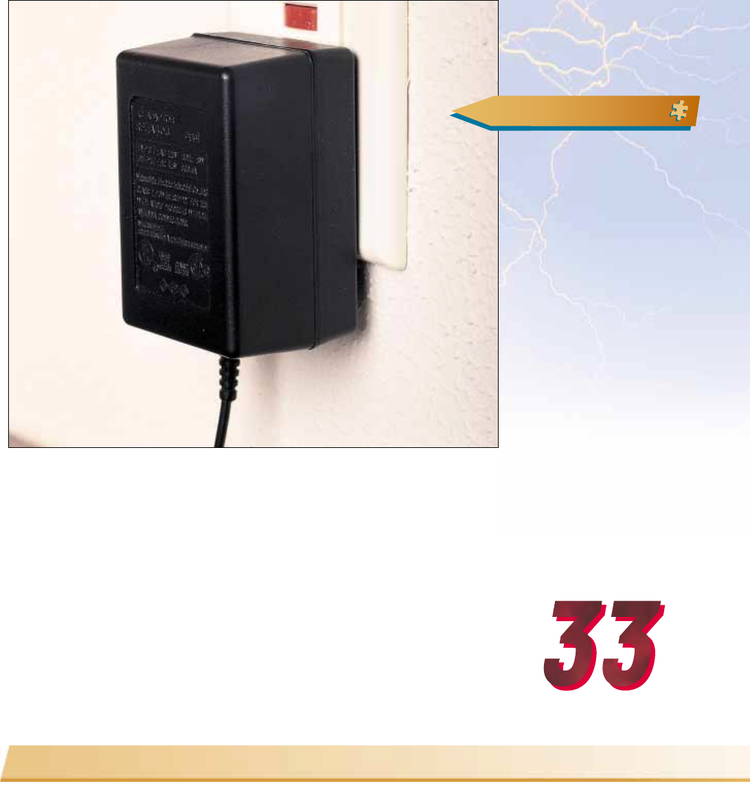 c h a p t e r Alternating-Current Circuits P U Z Z L E R Small “black boxes” like this one are commonly used to supply power to elec- tronic devices such as CD players and tape players. Whereas these devices need only about 12 V to operate, wall outlets provide an output of 120 V. What do the black boxes do, and how do they work? (George Semple) C h a p t e r O u t l i n e 33.1 ac Sources and Phasors 33.2 Resistors in an ac Circuit 33.3 Inductors in an ac Circuit 33.4 Capacitors in an ac Circuit 33.5 The RLC Series Circuit 33.6 Power in an ac Circuit 33.7 Resonance in a Series RLC Circuit 33.8 The Transformer and Power Transmission 33.9 (Optional) Rectifiers and Filters P U Z Z L E R 1043 1044 C H A P T E R 3 3 Alternating-Current Circuits n this chapter we describe alternating-current (ac) circuits. Every time we turn on a television set, a stereo, or any of a multitude of other electrical appliances, we are calling on alternating currents to provide the power to operate them. We begin our study by investigating the characteristics of simple series circuits that con- tain resistors, inductors, and capacitors and that are driven by a sinusoidal voltage. We shall find that the maximum alternating current in each element is proportional to the maximum alternating voltage across the element. We shall also find that when the applied voltage is sinusoidal, the current in each element is sinusoidal, too, but not necessarily in phase with the applied voltage. We conclude the chapter with two sections concerning transformers, power transmission, and RC filters. AC SOURCES AND PHASORS An ac circuit consists of circuit elements and a generator that provides the alter- nating current. As you recall from Section 31.5, the basic principle of the ac gener- ator is a direct consequence of Faraday’s law of induction. When a conducting loop is rotated in a magnetic field at constant angular frequency �, a sinusoidal voltage (emf) is induced in the loop. This instantaneous voltage �v is where �Vmax is the maximum output voltage of the ac generator, or the voltage amplitude. From Equation 13.6, the angular frequency is where f is the frequency of the generator (the voltage source) and T is the period. The generator determines the frequency of the current in any circuit connected to the generator. Because the output voltage of an ac generator varies sinusoidally with time, the voltage is positive during one half of the cycle and negative during the other half. Likewise, the current in any circuit driven by an ac generator is an alternating current that also varies sinusoidally with time. Commercial electric- power plants in the United States use a frequency of 60 Hz, which corresponds to an angular frequency of 377 rad/s. The primary aim of this chapter can be summarized as follows: If an ac genera- tor is connected to a series circuit containing resistors, inductors, and capacitors, we want to know the amplitude and time characteristics of the alternating current. To simplify our analysis of circuits containing two or more elements, we use graph- ical constructions called phasor diagrams. In these constructions, alternating (sinus- oidal) quantities, such as current and voltage, are represented by rotating vectors called phasors. The length of the phasor represents the amplitude (maximum value) of the quantity, and the projection of the phasor onto the vertical axis rep- resents the instantaneous value of the quantity. As we shall see, a phasor diagram greatly simplifies matters when we must combine several sinusoidally varying cur- rents or voltages that have different phases. RESISTORS IN AN AC CIRCUIT Consider a simple ac circuit consisting of a resistor and an ac generator , as shown in Figure 33.1. At any instant, the algebraic sum of the voltages around a 33.2 � � 2�f � 2� T �v � �Vmax sin �t 33.1 I 33.2 Resistors in an ac Circuit 1045 closed loop in a circuit must be zero (Kirchhoff’s loop rule). Therefore, or1 (33.1) where �vR is the instantaneous voltage across the resistor. Therefore, the in- stantaneous current in the resistor is (33.2) where Imax is the maximum current: From Equations 33.1 and 33.2, we see that the instantaneous voltage across the re- sistor is (33.3) Let us discuss the current-versus-time curve shown in Figure 33.2a. At point a, the current has a maximum value in one direction, arbitrarily called the positive direction. Between points a and b, the current is decreasing in magnitude but is still in the positive direction. At b, the current is momentarily zero; it then begins to increase in the negative direction between points b and c. At c, the current has reached its maximum value in the negative direction. The current and voltage are in step with each other because they vary identi- cally with time. Because iR and �vR both vary as sin�t and reach their maximum values at the same time, as shown in Figure 33.2a, they are said to be in phase. Thus we can say that, for a sinusoidal applied voltage, the current in a resistor is al- ways in phase with the voltage across the resistor. A phasor diagram is used to represent current–voltage phase relationships. The lengths of the arrows correspond to �Vmax and Imax . The projections of the phasor arrows onto the vertical axis give �vR and iR values. As we showed in Section 13.5, if the phasor arrow is imagined to rotate steadily with angular speed �, its vertical- axis component oscillates sinusoidally in time. In the case of the single-loop resis- tive circuit of Figure 33.1, the current and voltage phasors lie along the same line, as in Figure 33.2b, because iR and �vR are in phase. Note that the average value of the current over one cycle is zero. That is, the current is maintained in the positive direction for the same amount of time and at the same magnitude as it is maintained in the negative direction. However, the direction of the current has no effect on the behavior of the resi