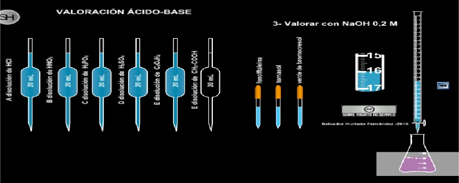 Actividad #3 (40 minutos) trabajo en grupo. Utilizando el simulador de titulación https://labovirtual.blogspot.com/search/label/valoraci%C3%B3n%20%C3%A1cido-base Determina la concentración de ácido acético (un ácido débil) contenido en una muestra de vinagre mediante la titulación con una solución de NaOH (una base fuerte) de concentración conocida. 1. Para ello dispone de una solución estándar de NaOH 0.2 M 2. Para escoger el ácido, desliza el cursor sobre la pipeta que contiene el ácido que se va a usar. 3. Selecciona una alícuota de 20 mL de ácido acético (solución de vinagre), haciendo clic sobre la pipeta de este ácido. 4. Selecciona un indicador ácido-base a utilizar (fenolftaleína) pulsando sobre el bulbo de goma naranja del gotero. 5. Coloca el mouse sobre la llave de la bureta para dejar salir la disolución valorante. 6. Deja salir líquido hasta que la disolución del matraz cambie de color (viraje del indicador). 7. Agita el matraz deslizando el cursor sobre este, para comprobar que el cambio de color es permanente, en caso contrario sigue valorando hasta que el cambio de color sea permanente. Lea el volumen final y anótelo. Cuando la bureta había diluido 16 mL en el matraz que contenía 20 mL se tornó morado la disolución, por más que agitaba no se volvió a cambiar. 8. Ahora con la información obtenida calcula la concentración molar del ácido acético CH3COOH en la muestra de vinagre. Conversiones: Concentración molar = Número de Moles de Soluto Volumen de la Solución Concentración molar = Número de Moles de Soluto Volumen de la Solución La concentración molar del ácido acético es de 0.138 M 9. Para el cálculo de la masa de ácido acético, utilice la fórmula de molaridad, la masa molar del ácido, y para calcular la masa de la solución considere que el experimento se desarrolló a 20°C, donde la densidad del ácido acético es 1.05 g/mL. 10. Calcule el porcentaje de ácido acético en la muestra de vinagre usando la fórmula de abajo. 11. Investiga la concentración del ácido acético en el vinagre comercial y compara con el resultado obtenido (podrías por ejemplo mirar en tu cocina si hay una botella de vinagre y leer la etiqueta). Explica cualquier similitud o diferencia observada. Al investigar la concentración del ácido acético en el vinagre comercial, estos poseen una concentración de 3 – 5 %. Al realizar una comparación con nuestro resultado se puede observar que existe una diferencia. Esta diferencia se debe a que los vinagres son elaborados con diferentes métodos entre los cuales se puede mencionar: Método de Orleans, Método Schuetzenbach, Métodos modernos y por Maduración. Nuestro resultado podemos compararlo con el Método Schuetzenbach ya que cada nivel se aumenta la concentración de ácido acético entre 1 y 2%.