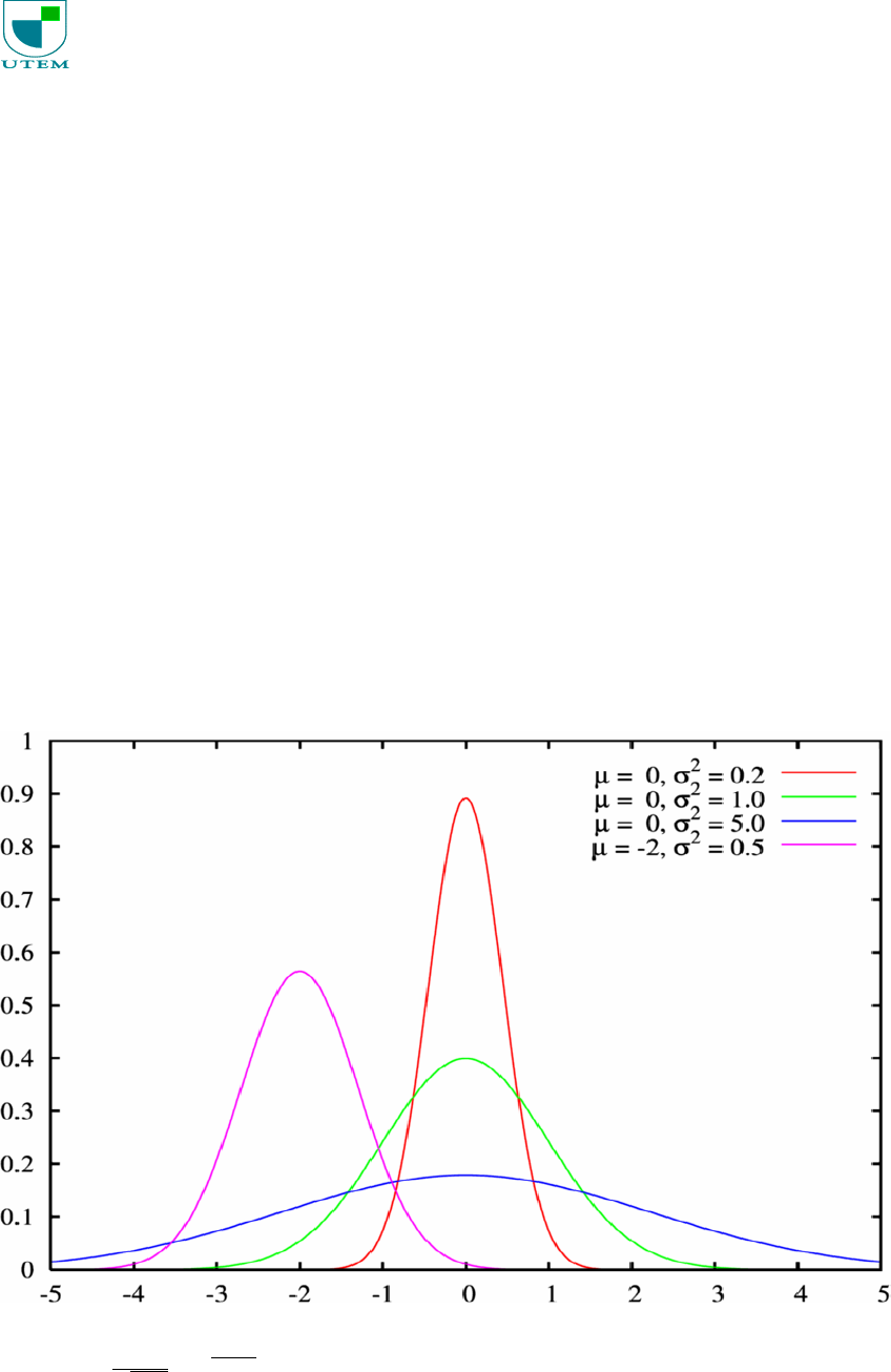 UNIVERSIDAD TECNOLOGICA METROPOLITANA DEPARTAMENTO DE MATEMÁTICA - SEDE SAN IGNACIO -------------------------------------------------------------------------------------------------------------------------------------------------------------- ________________________________________________________________________ Distribución Normal 1 Dra. Ing. Teresa Brand Domínguez. Distribuciones de Probabilidad Variable Aleatoría Continúa, Distribución Normal La distribución normal, también llamada distribución de Gauss o distribución gaussiana, es la distribución de probabilidad que con más frecuencia aparece en estadística y teoría de probabilidades. Esto se debe a dos razones fundamentalmente: Su función de densidad es simétrica y con forma de campana, lo que favorece su aplicación como modelo a gran número de variables estadísticas. Es, además, límite de otras distribuciones y aparece relacionada con multitud de resultados ligados a la teoría de las probabilidades gracias a sus propiedades matemáticas. Como sucede en todas las distribuciones continuas de probabilidad, un valor de probabilidad de una variable aleatoria continua sólo puede determinarse para un intervalo de valores. La altura de la función de densidad, o curva de probabilidad, de una variable con distribución normal está dada por: = donde : es la constante 3,14160Ð\Ñ /" # È ’ “15# Ð\ Ñ# # # . 5 1 : media de la distribución. UNIVERSIDAD TECNOLOGICA METROPOLITANA DEPARTAMENTO DE MATEMÁTICA - SEDE SAN IGNACIO -------------------------------------------------------------------------------------------------------------------------------------------------------------- ________________________________________________________________________ Distribución Normal 2 Dra. Ing. Teresa Brand Domínguez. : desviación estandar de la distribución5 Propiedad : El área encerrada bajo la curva normal siempre esRÐBß Ñ "5 Muchas variables aleatorias continuas presentan una función de densidad cuya gráfica tiene forma de campana. La importancia de la distribución normal se debe principalmente a que hay muchas variables asociadas a fenómenos naturales que siguen el modelo de la normal: Caracteres morfológicos de individuos Caracteres fisiológicos como el efecto de un fármaco Caracteres sociológicos como el consumo de cierto producto por un mismo grupo de individuos Caracteres psicológicos como el cociente intelectual Errores cometidos al medir ciertas magnitudes Valores estadísticos muestrales como la media I La distribución probabilistica normal es una distribución continua, con las siguientes caracteristicas: 1.- Es acampanada, donde la media, mediana y moda son iguales 2.- es simétrica 3.- es asintótica, lo que significa que la curva se eproxima al eje x, pero nunca lo toca. 4.- queda descrita completamente por la media y la desviación estándar. 5.- existe una familia de distribuciones normales, cada vez que cambien la media o la desviación estándar, se origina una nueva distribución normal. OBS.- Se consideran tres áreas bajo la curva normal que se usan ampliamente - aproximadamente 68% del área bajo la curva normal está dentro de más una y menos una desviaciones estándares respecto de la media ( 1 ). 5„ - aproximadamente el 95% del área bajo la curva normal está dentro de más dos y menos dos desviaciones estándares respecto de la media ( 2 ). 5„ - prácticamente toda el área (99.7%) bajo la curva normal está dentro de tres desviaciones estándares respecto de la media (a uno y otro lado del centro), lo cual se indica por 2 .. 5„ UNIVERSIDAD TECNOLOGICA METROPOLITANA DEPARTAMENTO DE MATEMÁTICA - SEDE SAN IGNACIO -------------------------------------------------------------------------------------------------------------------------------------------------------------- ________________________________________________________________________ Distribución Normal 3 Dra. Ing. Teresa Brand Domínguez. . --I---------I---------I---------I---------I---------I---------I------- x . 5 . 5 . 5 . . 5 . 5 . 5-3 -2 -1 +1 +2 +3 - 68,26 % -Ä Ã ----------- 95,44 % ----------Ä Ã ------------------------ 99,74 % ----------------------Ä Ã II.- la distribución normal estandar es un caso especial del tipo normal 1.- tiene una media 0.00 y una desviación estandar 1.00 2.- Como se dijo cualquier distribución normal puede convertirse a una tipo normal estándar mediante la siguiente fórmula: z = B.5 --I---------I---------I---------I---------I---------I---------I------- x . 5 . 5 . 5 . . 5 . 5 . 5-3 -2 -1 +1 +2 +3 se convierte en --I---------I---------I---------I---------I---------I---------I------- z -3 -2 -1 0 1 2 3 68,26 % Ä Ã ----------- 95,44 % ----------Ä Ã ------------------------ 99,74 % ----------------------Ä Ã Puesto que toda diferente combinación de y generaría una distribución. 5 normal de probabilidad diferente (aunque siempre simétrica y mesocúrtica), las tablas de probabilidad normales se basan en una distribución en particular: la distribución normal estandar. Ësta es la distribución de probabilidad con = 0 y = 1, . Todo. 5 RÐ!ß "Ñ valor procedente de una población con distribución normal puede convertirse en el\ equivalente valor normal estandar mediante la fórmula.^ ^ œ \.5 Luego su función de densidad asociada será = donde : es la constante 3,14160Ð\Ñ /" # È 1 B# # 1 : media de la distribución. UNIVERSIDAD TECNOLOGICA METROPOLITANA DEPARTAMENTO DE MATEMÁTICA - SEDE SAN IGNACIO -------------------------------------------------------------------------------------------------------------------------------------------------------------- ________________________________________________________________________ Distribución Normal 4 Dra. Ing. Teresa Brand Domínguez. *Asimetría: Índice que expresa el grado de asimetría de la distribución. La asimetría positiva indica que los valores más extremos se encuentran por encima de la media. La asi
