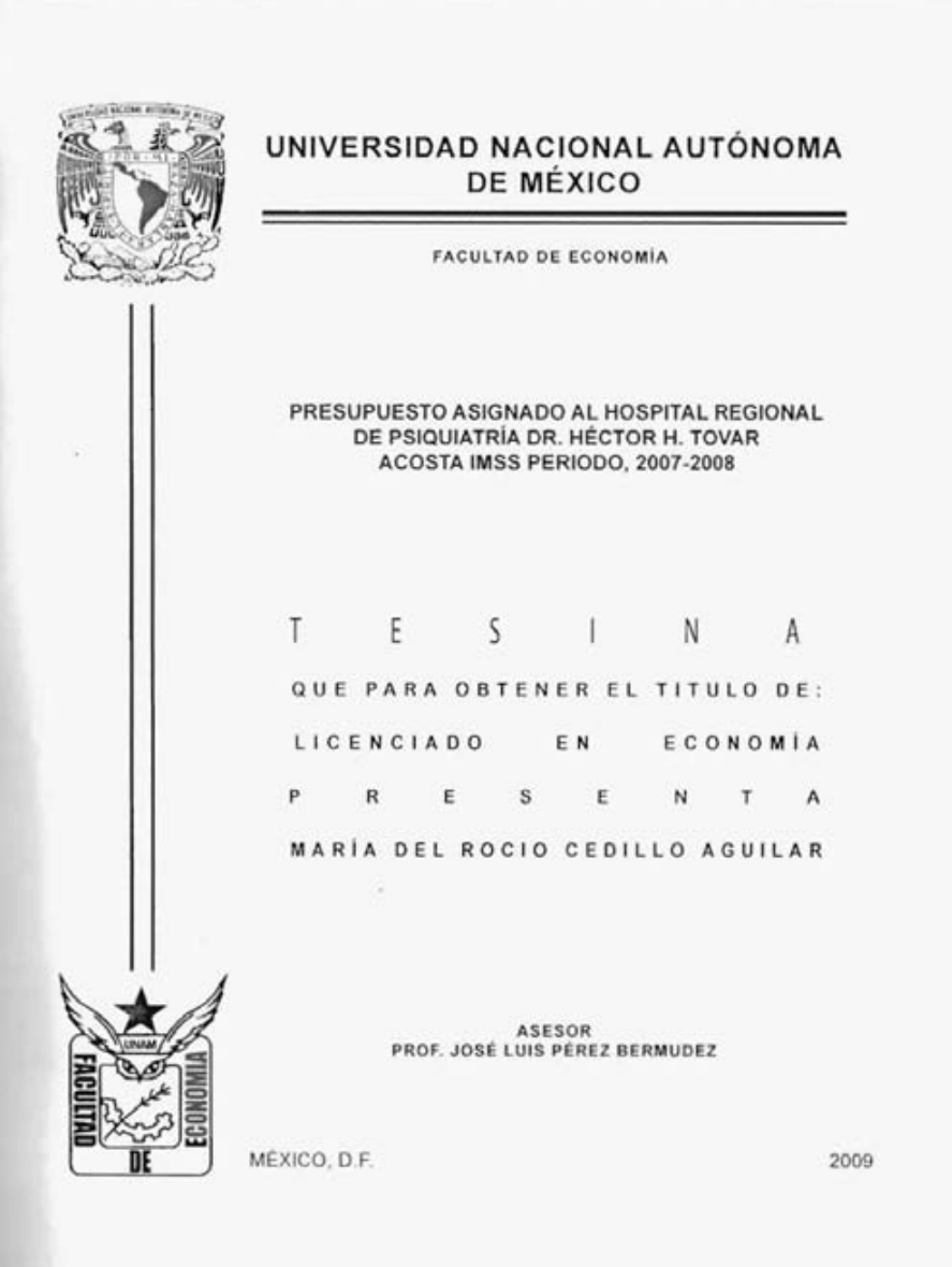 UNIVERSIDAD NACIONAL AUTÓNOMA DE MEXICO FACULTAD DE ECONOMiA PRESUPUESTO ASIGNADO AL HOSPITAL REGIONAL DE PSlaUIATRiA OR. HÉCTOR H. r eVAR ACOSTA IMSS PERIODO, 2007-2008 T E s N A QUE PARA OBT ENER EL TITULO DE: LICE N C IAD O E N ECO N Q M IA p R E s E N T A MARiA DEL RoelO CEDILlO AGUILAR ASES OR PROF. J OSE LUIS PE R EZ BERMU OEZ DI MEXICO, D.F 2009 UNAM – Dirección General de Bibliotecas Tesis Digitales Restricciones de uso DERECHOS RESERVADOS © PROHIBIDA SU REPRODUCCIÓN TOTAL O PARCIAL Todo el material contenido en esta tesis esta protegido por la Ley Federal del Derecho de Autor (LFDA) de los Estados Unidos Mexicanos (México). El uso de imágenes, fragmentos de videos, y demás material que sea objeto de protección de los derechos de autor, será exclusivamente para fines educativos e informativos y deberá citar la fuente donde la obtuvo mencionando el autor o autores. Cualquier uso distinto como el lucro, reproducción, edición o modificación, será perseguido y sancionado por el respectivo titular de los Derechos de Autor. AGRADECIMIENTOS A MI HIJA MARIANA: Por haber tenido tolerancia, paciencia y amor de muchas horas de trabajo; dedicación y mucho entusiasmo de terminar mi carrera por muchos años truncada. A MI ESPOSO JOAQUIN: Por su cariño y porque me ayudo a mantener estabilidad en el hogar con el propósito de que estuviera plenamente concentrada. A MIS HIJOS ABRAHAM Y NESTOR: Por su amor. A MIS PADRES Y HERMANOS: Por el apoyo moral, por darme ánimos de seguir adelante y su motivación para terminar la carrera. A MIS SINODALES: Por las observaciones que me hicieron y fructificaron la investigación. A LOS DOCTORES: Gregorio Aramayo Diez de Medina: Por sus comentarios de la aplicación de la psiquiatría en distintos padecimientos mentales. Irineo Guzmán: Por sus acertados diagnósticos en tratamientos de pacientes psiquiátricos. A LA UNAM: Por ser una institución con valores críticos y científicos que está al servicio del pueblo y que forma profesionales distinguidos. ÍNDICE Pág. 1 INTRODUCCIÓN 9 1.1 JUSTIFICACIÓN 12 1.2 OBJETIVOS 14 CAPITULO I GASTO PÚBLICO EN SALUD PERIODO 1995 a 2007. 1 Introducción 1.1 Condiciones generales de la Población Mexicana en Salud 17 1.1.1 Transición Demográfica-Epidemiológica 17 1.1.2 Demanda de servicios 17 1.1.3 Enfermedades que ocasionan más pérdida de años de vida saludable 18 1.1.4 Rezago epidemiológico 18 1.1.5 Desigualdad social 19 1.2 Gasto Público en Salud y la Reforma al Sector 19 1.2.1 Participación del Gasto en Salud en el PIB 19 1.2.1.1 Tasas de Crecimiento 21 1.2.2 Distribución del gasto en salud 21 1.2.3 Gasto Público en Salud y la Seguridad Social 22 1.2.4 Seguro Popular 22 1.2.5 Política Presupuestal 24 1.2.6 Seguro Universal 24 1.2.7 Políticas Sociales Regresivas 25 1.2.8 Reforma al Sistema Nacional de Salud y Política Presupuestal 26 1.2.9 Descentralización del Presupuesto, Objetivo: IMSS 28 1.2.10 Sistema Plural de Servicios de Salud 28 1.2.11 Consecuencias de la Reforma 28 1.2.12 Perspectivas de las Enfermedades Mentales (carga de la enfermedad) 29 1.3 Gasto Privado en Salud 30 1.3.1 Participación del Gasto Privado en Salud 30 1.3.2 Beneficios y Subsidios del Gobierno al Sector Privado en Salud 30 1.3.3 Población atendida 31 1.3.4 Gasto Prepago o de Bolsillo 31 CAPITULO II ANTECEDENTES, OBJETIVOS Y NORMAS DE LA PSIQUIATRÍA EN MÈXICO; ORIGEN Y FUNCIONAMIENTO DEL HOSPITAL REGIONAL DE PSIQUIATRÍA DR. HÉCTOR H. TOVAR ACOSTA. 2 Introducción 2.1 Antecedentes Históricos 33 2.1.1 Origen y Desarrollo de la Psiquiatría en México 33 2.1.2 Conceptualización de la Salud Mental y la Seguridad Social 34 2.1.3 Surgimiento de la Psiquiatría en México 34 2.1.4 Instituciones Normativas que surgieron para regular la atención de pacientes psiquiátricos 36 2.1.5 IMSS: Origen y Funcionamiento del Hospital Regional de Psiquiatría Dr. Héctor H. Tovar Acosta 37 2.2 Objetivos y Normas 39 2.2.1 Proyecto Unidades Médicas de Alta Especialidad incluido el 39 Hospital Regional de Psiquiatría Dr. Héctor H. Tovar Acosta 39 2.2.2 Objetivo 41 2.2.3 Organigrama Puestos de mando 41 2.2.4 Reglamento de Organización Interna del IMSS, en el articulo 76.- de la Dirección de Prestaciones Médicas, Titulo cuarto de los órganos normativos del Instituto 41 2.2.4.1 Fracción I 41 2.2.4.2 Fracción IV 41 2.2.5 ¿Cómo Unidad Médica de Alta Especialidad el Hospital Regional de Psiquiatría Dr. Héctor H. Tovar Acosta ha alcanzado sus objetivos? 42 2.2.6 Norma que lo Rige 43 2.2.7 Criterios para hospitalización de pacientes psiquiátricos 44 2.2.8 Derechos Universales de los pacientes con trastornos mentales 45 2.3 Recursos Humanos e Infraestructura 46 CAPITULO III TRASTORNOS MENTALES MÁS FRECUENTES EN EL HOSPITAL REGIONAL DE PSIQUIATRÍA DR. HÉCTOR H. TOVAR ACOSTA DURANTE EL AÑO 2007 A 2008. 3 Introducción 3.1 Ingresos de primera vez y subsecuentes por sexo periodo 26 de agosto de 2007 a 26 de agosto de 2008 48 3.1.1 Trastornos Mentales identificados del total de ingresos 49 3.1.2 Comparación con la Encuesta Nacional Epidemiológica 53 3.2 Definiciones 53 3.3 Clasificación de los trastornos mentales y del comportamiento en hombres y mujeres 54 3.3.1 Trastorno del humor afectivo 55 3.3.2 Esquizofrenia, Trastorno Esquizotípico y Trastorno de ideas delirantes 57 3.3.3 Trastornos neuróticos secundarios a situaciones estresantes somotomoformos 58 3.3.4 Trastornos mentales y del comportamiento debido al consumo de substancias psicotrópicas 60 3.3.5 Retraso mental 60 CAPITULO IV PRESUPUESTO ASIGNADO AL HOSPITAL REGIONAL DE PSIQUIATRIA DR. HÈCTOR H. TOVAR ACOSTA EN EL PERIODO 2000 A 2007 4 Introducción 4.1 Política presupuestal en el IMSS 63 4.1.1 Política de Asignación de Recursos 63 4.1.2 Participación del Gasto en los Seguros que administra el IMSS 64 4.1.3 Régimen Obligatorio 66 4.2 Comportamiento del Seguro de Enfermedades y Maternidad 66 4.2.1 Situación financiera 66 4.2.2 Esquema de finan