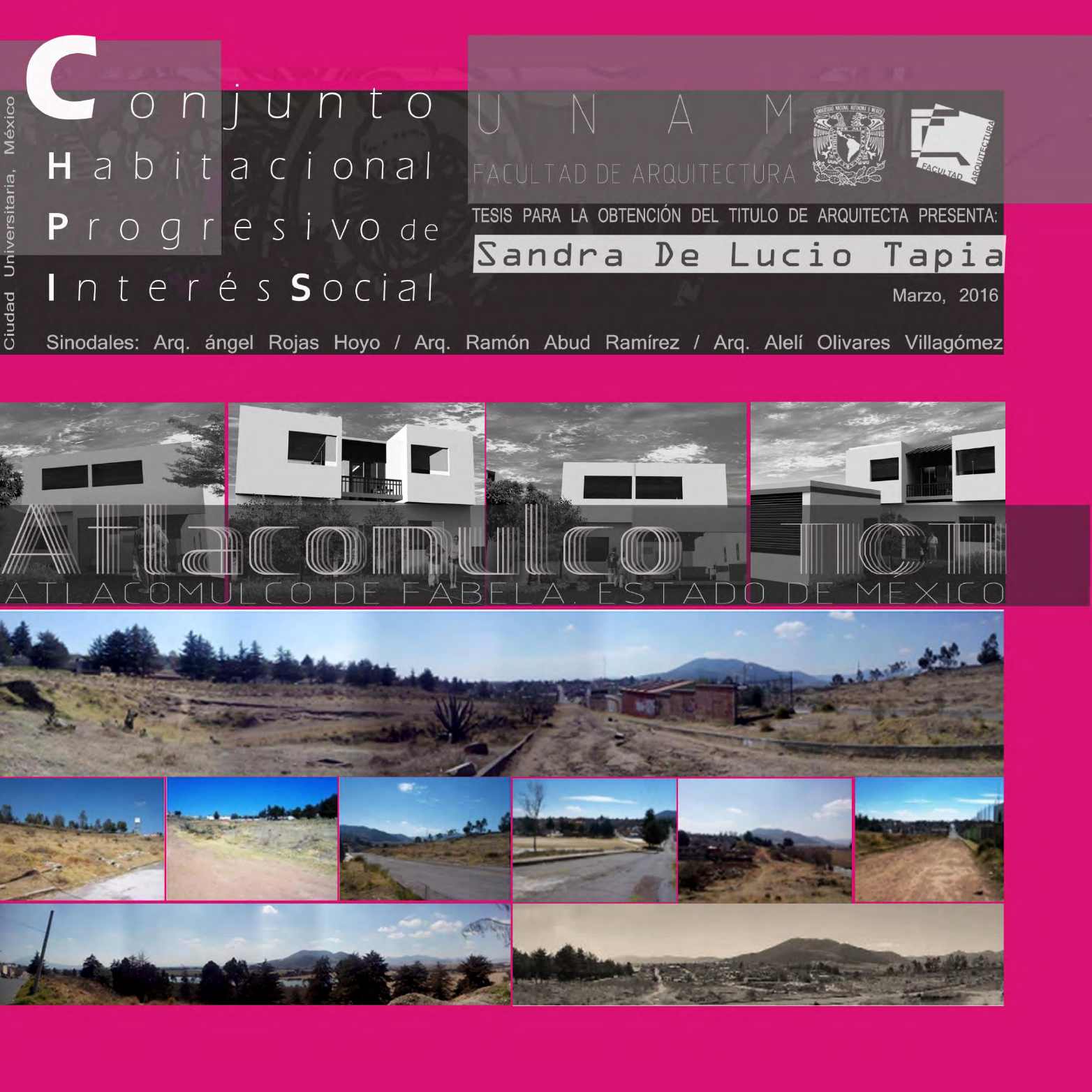 UNAM – Dirección General de Bibliotecas Tesis Digitales Restricciones de uso DERECHOS RESERVADOS © PROHIBIDA SU REPRODUCCIÓN TOTAL O PARCIAL Todo el material contenido en esta tesis esta protegido por la Ley Federal del Derecho de Autor (LFDA) de los Estados Unidos Mexicanos (México). El uso de imágenes, fragmentos de videos, y demás material que sea objeto de protección de los derechos de autor, será exclusivamente para fines educativos e informativos y deberá citar la fuente donde la obtuvo mencionando el autor o autores. Cualquier uso distinto como el lucro, reproducción, edición o modificación, será perseguido y sancionado por el respectivo titular de los Derechos de Autor. 1 2 3 Lourdes Texto escrito a máquina Ciudad Universitaria, CDMX 4 5 6 A mis hermanos Jessica De Lucio y Alejandro De Lucio que me apoyaron en lo posible, me alentaron y fueron participes en esas noches de desvelo, en esos días de entrega y sobre todo me dieron la mano cuando más lo necesité, ¡gracias hermanos!. A un ser que ha sido fundamental para lograr lo que soy ahora, un gran maestro, el que me enseñó el significado tan sublime de la Arquitectura, el que compartió conmigo este sinuoso camino, sin duda alguna, siempre estaré eternamente agradecida contigo Jaime Sebastián Jiménez Gallardo. Finalmente a mis amigos que me brindaron el apoyo incondicional durante toda la carrera, que me motivaron a seguir adelante con este proyecto y sobre todo me brindaron una fiel amistad, Beatriz, Lorena, Aleisa, Dulce, Yazmin, Marcos, Mónica, Christian, Minerva, Luis, Omar etc. ¡Gracias por estar a mi lado! Un momento extraordinario en mi vida, poder compartir con mi familia y amigos, todos y cada uno de mis triunfos, me siento sumamente orgullosa de ello. En especial por haber cursado en la Máxima Casa de Estudios, sin duda alguna, mi segunda casa, que tanto me ha dado. ¡Gracias UNAM, gracias Facultad de Arquitectura, gracias a todos mis profesores que fueron indispensables para llegar hasta aquí!. No tengo palabras suficientes para poder agradecer a todos los que han sido participes en esta aventura de mi vida llamada Arquitectura. Desvelos, tareas, proyectos, trabajos finales, horas de estudio, exposiciones, exámenes, llantos, risas, alegrías, tristezas, estrés, felicidad, las horas de trabajo, en fin, todo el curso de la carrera ¡gracias!. Principalmente agradezco a mis padres Patricia Tapia y Alejandro De Lucio, por todo su apoyo y amor incondicional que me han brindado a lo largo de la vida, sin ellos no hubiera sido posible cumplir este sueño de ser Arquitecta. ¡Gracias por confiar en mi, espero no fallarles nunca!. 7 8 Un grupo de estudiantes de la Facultad de Arquitectura de la Universidad Nacional Autónoma de México, se dio a la tarea de realizar un proyecto llamado “Conjunto Habitacional Progresivo de Interés Social Atlacomulco, TIC TI”, ubicado en el Estado de México, con el propósito de mejorar una de las problemáticas de mayor presencia en nuestro país, México, que es la vivienda. En el presente documento se aborda la problemática desde una perspectiva arquitectónica, urbanística, social, política y cultural en la colonia Río Lerma- Rancho TIC TI en el municipio de Atlacomulco de Fabela en el Estado de México. Arquitectónicamente se afronta la problemática con un proyecto académico en seminario de titulación en el Taller José Revueltas, en el cual se plantea una nueva traza urbana con un conjunto habitacional de 340 viviendas progresivas de interés social. Considerando aspectos ambientales, el perfil de los usuarios, el financiamiento de dichas viviendas, equipamiento urbano, infraestructura y dignificar la vivienda en los habitantes de dicho lugar. Mediante la Arquitectura Progresiva se brinda una oportunidad más accesible para la población mexicana, para que pueda acceder a una vivienda digna, de acuerdo a su capital disponible. Llevándose a cabo el proyecto a través de un esquema de desarrollo progresivo de vivienda, que permitirá adquirir un pie de casa, siendo este la primer etapa de desarrollo del proyecto. Posteriormente una segunda etapa donde se extiende la vivienda de manera horizontal y vertical y finalmente una tercer etapa, donde se concluye la construcción de la vivienda. La disposición espacial se define de acuerdo a la topografía del sitio, que se adapta a las condiciones naturales del terreno, generando sendas y andadores, dándole prioridad al peatón y a la interacción con su entorno inmediato. Se incluyen en el proyecto espacios de cultura, deporte y educación para completar este gran complejo en Atlacomulco. Proyecto realizado por las estudiantes: • Sandra De Lucio Tapia • Beatriz Aleida. Raygada Ayanegui • Sandra Castañeda Castro 9 10 La vivienda en México. Problemática de vivienda en México. Organismos que gestionan la producción de vivienda en México. Autoconstrucción. Vivienda progresiva. Estado de México. Población/Nivel educativo. Atlacomulco. Educación escolar. Geografía/Clima/Hidrografía/Flora y Fauna. Vialidades. Características y uso de suelo. Economía actual. Plan de Desarrollo Urbano. Integración Latinoamericana. Centro Urbano Miguel Alemán. Fraccionamiento Rehilete. Fraccionamiento Las Anacuas. Conjunto Ciprés. I N T R O D U C C I Ó N I N V E S T I G A C I Ó N C A S O S A N Á L O G O S S I T I O Río Lerma TIC-TI. Predio. Rutas de acceso. Equipamiento urbano/Espacio público. Instancias Gubernamentales de Seguridad Pública. Salud. Transporte público. Cultura. Comercio de bajo impacto. Educación. Instrumentación normas de uso de suelo. Análisis FODA. Topografía del sitio. Contexto inmediato. Colindancias. Lotificación. Conjunto. Vivienda. Propuesta urbana. Vialidades. Núcleos de estacionamiento. Andadores peatonales, plazoletas y ciclopista. Zonas deportivas. Centro cultural TIC-TI. E N F O Q U E P R O P U E S T A U R B A N A 14 15 16 18 20 24 25 26 28 29 30 31 32 33 38 40 42 