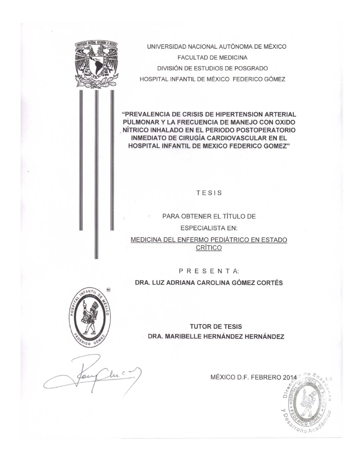 1 UNIVERSIDAD NACIONAL AUTÓNOMA DE MÉXICO FACULTAD DE MEDICINA DIVISiÓN DE ESTUDIOS DE POSGRADO HOSPITAL INFANTIL DE MÉXICO FEDERICO GÓMEZ "PREVALENCIA DE CRISIS DE HIPERTENSION ARTERIAL PULMONAR Y LA FRECUENCIA DE MANEJO CON OXIDO NíTRICO INHALADO EN EL PERIODO POSTOPERATORIO INMEDIATO DE CIRUGíA CARDIOVASCULAR EN EL HOSPITAL INFANTIL DE MEXICO FEDERICO GOMEZ" T E S I S PARA OBTENER El TiTULO DE ESPECIALISTA EN: MEDICINA DEL ENFERMO PEDIÁTRICO EN ESTADO CRITICO P R E S E N T A: DRA. LUZ ADRIANA CAROLINA GÓMEZ CORTÉS TUTOR DE TESIS DRA. MARIBELLE HERNÁNDEZ HERNÁNDEZ UNAM – Dirección General de Bibliotecas Tesis Digitales Restricciones de uso DERECHOS RESERVADOS © PROHIBIDA SU REPRODUCCIÓN TOTAL O PARCIAL Todo el material contenido en esta tesis esta protegido por la Ley Federal del Derecho de Autor (LFDA) de los Estados Unidos Mexicanos (México). El uso de imágenes, fragmentos de videos, y demás material que sea objeto de protección de los derechos de autor, será exclusivamente para fines educativos e informativos y deberá citar la fuente donde la obtuvo mencionando el autor o autores. Cualquier uso distinto como el lucro, reproducción, edición o modificación, será perseguido y sancionado por el respectivo titular de los Derechos de Autor. 2 , DIRECTOR DE TESIS DRA. MARI BE LE HERNÁNDEZ HERNÁNDEZ Médico Adscrito al Servicio de Terapia Intensiva Pediátrica 3 INDICE 1.- Antecedentes ……………………..………………………………4 2.- Pregunta de Investigación ………………………………………9 3.- Planteamiento del problema…….………………………………9 4.- Justificación………………………...……………………………..10 5.- Objetivos……………………………..…………………………….10 6.- Material y métodos………………….…………………………… 11 7.- Definición de variables……………...……………………………12 8.- Resultados……….………………………………………………. 15 9.- Discusión ……..……………………..…………………………… 18 10.- Conclusión……………………………..…………………… …..19 10.- Cronograma……………………………..…………………. …..21 11.- Bibliografía……………………… ..……………………………..22 12.- Anexos….………………………………………………………..24 4 I. ANTECEDENTES: Marco Teórico: La hipertensión arterial pulmonar (HTAP) postoperatoria es una complicación que se presenta con poca frecuencia en países del primer mundo, sin embargo, en países en desarrollo es un evento esperado por la detección tardía de niños con cardiopatías congénitas (1,2); la frecuencia reportada de HTAP en Europa y EUA es de 2% (1,,3,4,5) y los eventos de crisis de vasorreactividad pulmonar se refieren hasta de 0.75% (1,3,4,5). La prevalencia estimada de HTAP en pacientes no operados es de 30%, y de 15% en los ya corregidos (1,3). La HTAP asociada a cardiopatías congénitas es una de las causas más comunes de morbimortalidad temprana aun en niños con cambios vasculares reversibles (1). Se define HTAP de acuerdo con el consenso realizado en Dana Point 2008 como la presión arterial pulmonar media (PAPm) mayor de 25 en reposo, o una presión en cuña de la arteria pulmonar (PCAP) o de aurícula izquierda igual o mayor a 15, o resistencias vasculares pulmonares mayores a tres unidades Woods (1). Podemos considerar la etiología de la hipertensión pulmonar como multifactorial (fig.1). Más, es importante señalar, el posible rol que el endotelio tiene en aquellos pacientes que son sometidos a circulación extracorpórea (CEC) durante la corrección quirúrgica de su cardiopatía. Como actualmente se sabe, el endotelio vascular produce múltiples sustancias vasoactivas, incluidos el ON (Óxido Nítrico), PGE2 (prostaglandina 2) y ET-1 (endotelina-1). La secreción de estas sustancias se activa por estrés (liberándose ON y PGE2, disminuyendo ET- 1) y otra variedad de factores (adrenalina, trombina, citocinas, factores de crecimiento, hipoxia) (19,20). La reducción de la habilidad del endotelio para liberar factores de relajación se encuentra afectada en forma importante después de la CEC, con el consiguiente incremento de las RVP (resistencias vasculares pulmonares) (1,2,3). 5 FIGURA 1. Etiología de la hipertensión Arterial Pulmonar (1) Evaluación Preoperatoria y Tratamiento Se ha descrito que los que presentan crisis tienen lechos vasculares reactivos y los que fallecen de HTAP por lo general tienen muscularizacion de las pequeñas arteriolas pulmonares sin cambios de enfermedad vascular pulmonar irreversible(2,3). Si en la valoración preoperatoria se detectan signos clínicos o hallazgos ecocardiográficos que sugieran elevación de RVP se debería realizar cateterismo cardiaco para valoración hemodinámica objetiva (4). Tenemos que identificar a aquellos pacientes con riesgo de presentar hipertensión pulmonar en periodo postquirúrgico en forma preoperatoria, basándose en su enfermedad cardiaca; pudiéndose agrupar en cuatro categorías que explican los posibles mecanismos de responsables (1,4,5): 1. Resistencias vasculares pulmonares incrementadas. 2. Incremento del flujo pulmonar con resistencias vasculares pulmonares normales. 3. Combinación de incremento de las resistencias vasculares pulmonares y flujo pulmonar. 4. Incremento de la presión venosa Pulmonar. De acuerdo a esta clasificación, se pueden establecer estrategias de ventilación, monitorización y manejo médico (2). El tratamiento agudo de la HTAP postquirúrgica se enfoca principalmente a prevenirla e identificar en forma oportuna las crisis de hipertensión pulmonar, las cuales condicionan disfunción ventricular izquierda, comprometiendo en forma importante el gasto cardiaco, lo cual puede conllevar a un evento que pone en rie
