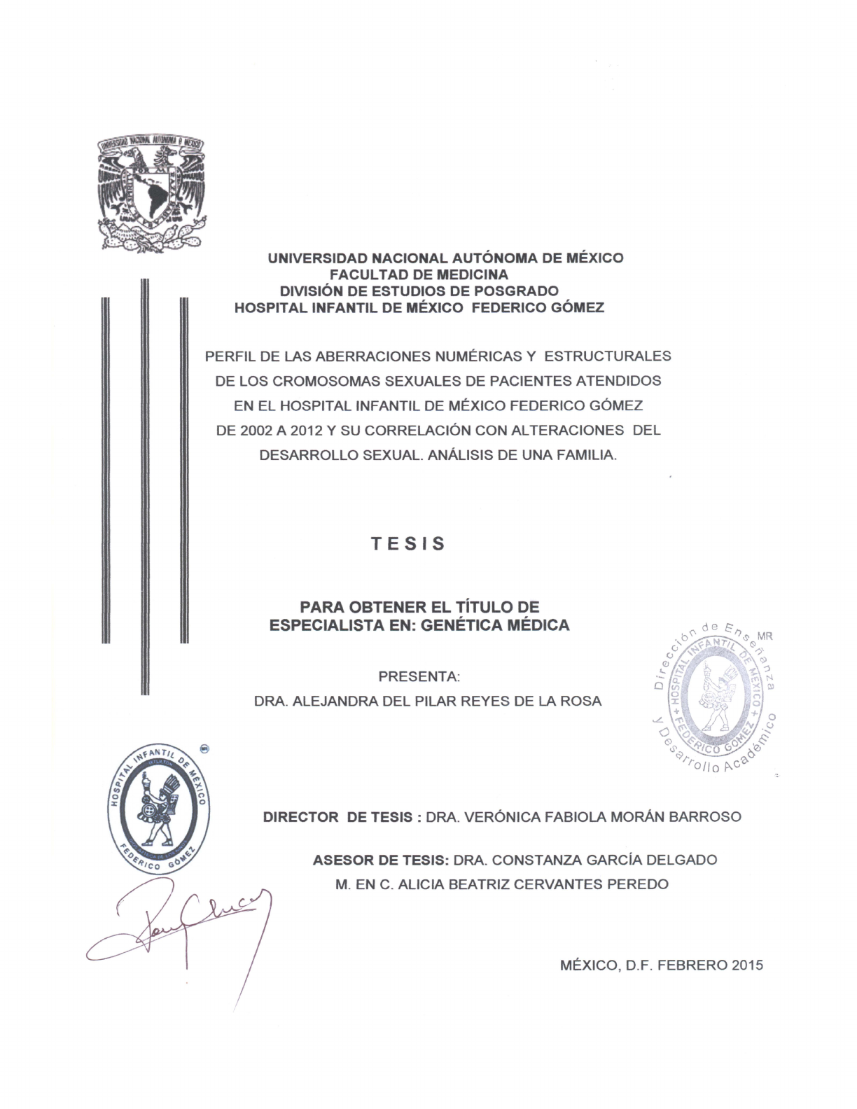 UNIVERSIDAD NACIONAL AUTÓNOMA DE MÉXICO FACULTAD DE MEDICINA DIVISiÓN DE ESTUDIOS DE POSGRADO HOSPITAL INFANTIL DE MÉXICO FEDERICO GÓMEZ PERFIL DE LAS ABERRACIONES NUMÉRICAS Y ESTRUCTURALES DE LOS CROMOSOMAS SEXUALES DE PACIENTES ATENDIDOS EN EL HOSPITAL INFANTIL DE MÉXICO FEDERICO GÓMEZ DE 2002 A 2012 Y SU CORRELACiÓN CON ALTERACIONES DEL DESARROLLO SEXUAL. ANÁLISIS DE UNA FAMILIA. T E S I S PARA OBTENER El TíTULO DE ESPECIALISTA EN: GENÉTICA MÉDICA PRESENTA: DRA. ALEJANDRA DEL PILAR REYES DE LA ROSA DIRECTOR DE TESIS: DRA. VERÓNICA FABIOLA MORÁN BARROSO ASESOR DE TESIS: DRA. CONSTANZA GARCíA DELGADO M. EN C. ALICIA BEATRIZ CERVANTES PEREDO MÉXICO, D.F. FEBRERO 2015 UNAM – Dirección General de Bibliotecas Tesis Digitales Restricciones de uso DERECHOS RESERVADOS © PROHIBIDA SU REPRODUCCIÓN TOTAL O PARCIAL Todo el material contenido en esta tesis esta protegido por la Ley Federal del Derecho de Autor (LFDA) de los Estados Unidos Mexicanos (México). El uso de imágenes, fragmentos de videos, y demás material que sea objeto de protección de los derechos de autor, será exclusivamente para fines educativos e informativos y deberá citar la fuente donde la obtuvo mencionando el autor o autores. Cualquier uso distinto como el lucro, reproducción, edición o modificación, será perseguido y sancionado por el respectivo titular de los Derechos de Autor. DRA. REBECA GÓMEZ CHICO VELASCO DIRECTORA DE ENSEÑANZA Y DESARROLLO ACADÉMICO HOSPITAL INFANTIL DE MÉXICO FEDERICO GÓMEZ xf;;1/41 ~kd'& ~P; ~//2/~ TU TO,RA: DRA. VERÓN A FABIOLA MORÁ~ BARROSO JEFE DEL DEPA TAMENTO DE GENETICA HOSPITAL INFANTIL DE MÉXICO FEDERICO GÓMEZ ~~~ l~ ~JJ- ASESOR DE ~IS: 6~A. CONSTANZA G~RCíA DELGADO MÉDICO ADSCRITO AL DEPARTAMENTO DE GENÉTICA HOSPITAL INFANTIL DE MÉXICO FEDERICO GÓMEZ ASESOR DE TES : M. EN C. ALICIA BEATRIZ CERVANTES PEREDO SERVICIO DE GENÉTICA HOSPITAL GENERAL DE MÉXICO DR. EDUARDO LICEAGA, FACULTAD DE MEDICINA, UNAM Resumen' Introducción:' Las$ alteraciones$ en$ los$ cromosomas$ sexuales$ son$ consideradas$ las$ aberraciones$cromosómicas$más$comunes$con$una$frecuencia$de$1:400$recién$nacidos$vivos.$ El$ fenotipo$de$ los$pacientes$es$variable$y$en$general$no$se$observa$ambigüedad$de$genitales$ por$ lo$ que$ su$ diagnóstico$ se$ puede$ retrasar.$ Los$ trastornos$ del$ desarrollo$ sexual$ (TDS)$ se$ presentan$en$1:4$500$recién$nacidos$vivos$y$sólo$en$el$20%$de$los$casos$es$posible$llegar$a$un$ diagnóstico$molecular$de$precisión.$El$TDS$46,XX$testicular$se$caracteriza$por$presentar$grado$ variable$ de$ ambigüedad$ de$ genitales,$ testículos,$ ausencia$ de$ derivados$ Müllerianos$ y$ complemento$ cromosómico$46,XX.$ La$mayoría$de$ los$ casos$ son$esporádicos$y$ se$deben$a$ la$ presencia$ del$ gen$ SRY$ en$ el$ cromosoma$ X$ paterno,$ sin$ embargo,$ en$ muy$ pocos$ de$ los$ restantes,$incluyendo$algunos$casos$familiares,$no$se$conoce$su$etiología.$ ' Material'y'métodos:$Se$hizo$una$revisión$del$registro$de$resultados$de$cariotipo$con$bandas$ GTG$ realizados$ en$ el$ Departamento$ de$ Genética$ del$ Hospital$ Infantil$ de$ México$ Federico$ Gómez$del$año$2002$al$2012,$para$la$identificación$de$los$casos$con$aberraciones$numéricas$y$ estructurales$de$los$cromosomas$sexuales$y$correlacionarlas$con$la$presencia$de$un$trastorno$ del$desarrollo$sexual.$Posteriormente$se$realizó$el$análisis$estadístico$y$se$ identificó$un$caso$ familiar$ para$ ampliar$ su$ estudio$ y$ otorgar$ asesoramiento$ genético.$ Criterios$ de$ inclusión:$ Casos$ con$ reporte$ de$ cariotipo$ entre$ enero$ de$ 2002$ a$ diciembre$ de$ 2012.$ Cariotipos$ realizados$ con$ bandas$ GTG.$ Presentación$ de$ alteración$ numérica$ o$ estructural$ de$ los$ cromosomas$ sexuales.$ Con$ nomenclatura$ clara$ y$ letra$ legible.$ Criterios$ de$ exclusión:$ No$ se$ cuente$con$la$nomenclatura$clara.$No$legibles.$Criterios$de$eliminación:$Casos$sin$resultados.$ El$análisis$estadístico$fue$un$estudio$retrospectivo,$observacional$y$descriptivo,$en$el$cual$se$ utilizaron$medidas$ de$ tendencia$ central$ para$ el$ análisis$ de$ la$ población$ y$ de$ los$ resultados$ obtenidos.$ En$ el$ análisis$ del$ caso$ clínico$ se$ tuvieron$ los$ siguientes$ criterios;$ criterios$ de$ inclusión:$Pacientes$con$alteraciones$numéricas$o$estructurales$de$los$cromosomas$sexuales.$ Pacientes$ con$ reversión$ sexual$ y/o$ ambigüedad$ de$ genitales.$ Con$ resultado$ legible$ y$ con$ nomenclatura$adecuada.$Que$acepten$participar$en$el$estudio.$Que$pueda$ofrecerse$beneficio$ de$ los$estudios$propuestos.$Criterios$de$exclusión:$Pacientes$que$no$acepten$participar.$Que$ haya$ contraindicación$ de$ toma$ de$ muestra.$ No$ se$ encuentre$ en$ expediente$ clínico$ para$ confirmación$ de$ datos.$ Criterios$ de$ eliminación:$ No$ se$ pueda$ confirmar$ el$ resultado.$ No$ se$ obtenga$resultado$de$la$muestra.$ $ Resultados:'En$el$período$establecido$se$ reportaron$1$741$casos$con$una$cromosomopatía,$ 199$ (11.43%)$ correspondieron$ a$ una$ alteración$ de$ los$ cromosomas$ sexuales,$ de$ los$ cuales$ 137$(7.87%)$presentaron$una$aberración$numérica$y$36$(2.07%)$$una$estructural.$El$21.11%$ de$ las$ alteraciones$ de$ los$ cromosomas$ sexuales$ estaban$ asociadas$ a$ un$ trastorno$ en$ el$ desarrollo$sexual.$Se$identificó$el$caso$familiar$de$dos$hermanos$con$un$TDS$46,XX$testicular,$ en$ uno$ de$ ellos$ se$ efectuaron$ estudios$ adicionales$ incluyendo$ un$ cariotipo$ molecular.$ Los$ estudios$de$FISH$y$PCR$demostraron$que$se$trataba$de$un$caso$SRY$negativo.$En$el$análisis$de$ los$datos$obtenidos$del$microarreglo$no$se$detectaron$ganancias$ni$pérdidas$en$ninguno$de$los$ genes$implicados$en$el$proceso$de$desarrollo$sexual,$entre$ellos$SOX9,$SOX3,$DAX1$y$RSPO1,$ni$ en$ región$ alguna$ del$ su$ genoma.$ Adicionalmente$ no$ se$ encontró$ alguna$ variación$ en$ la$ secuencia$del$gen$RSPO1,$que$pudiera$tener$efecto$un$efecto$patogénico.$ $ Discusión' y' conclusiones:$ Las$ aberraciones$ de$ los$ cromosom