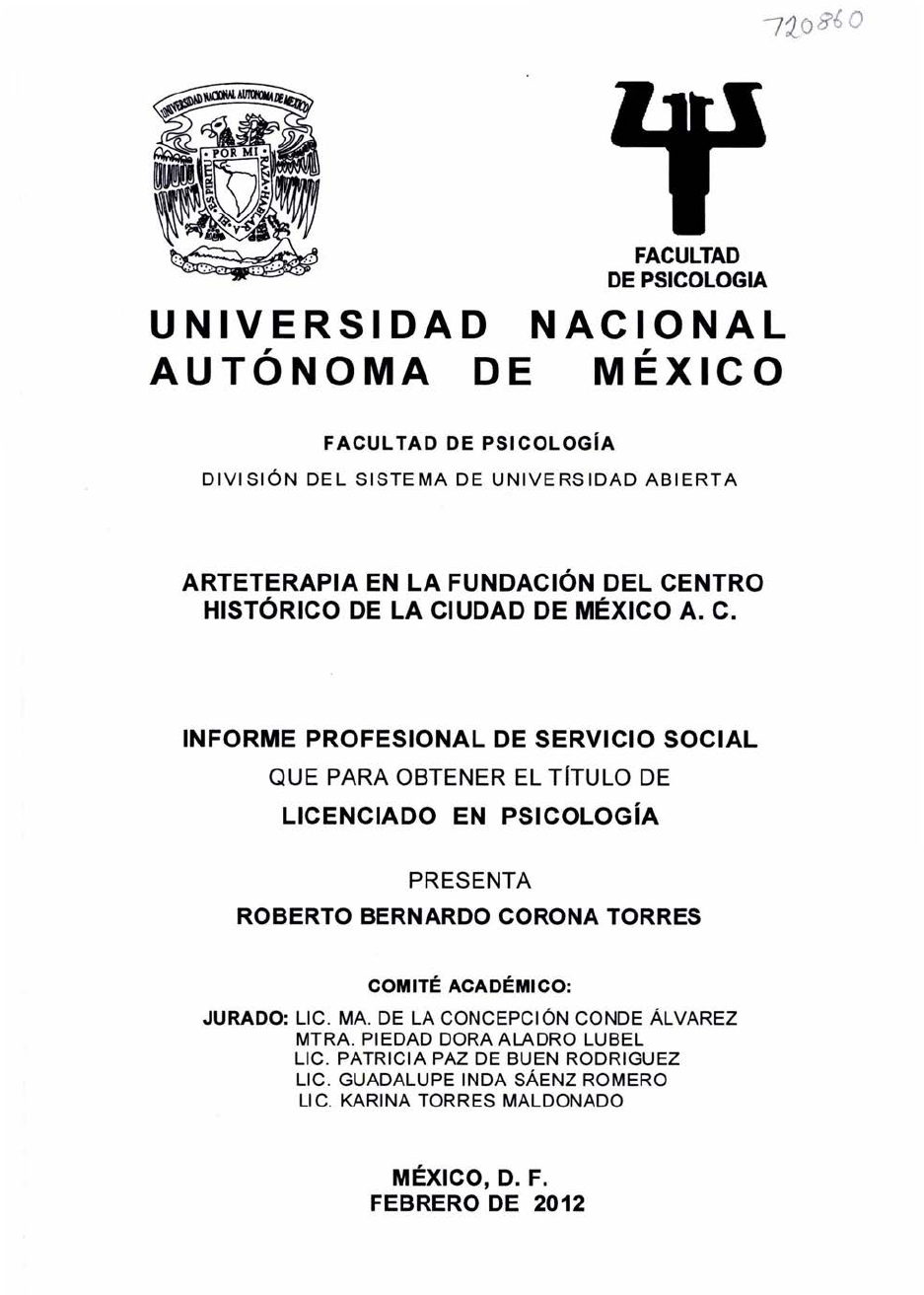 FACULTAD DE PSICOLOGIA UNIVERSIDAD NACIONAL AUTÓNOMA DE MÉXICO FACUL TAO DE PSICOLOGÍA DIVISIÓN DEL SISTEMA DE UNIVERSIDAD ABIERTA ARTETERAPIA EN LA FUNDACIÓN DEL CENTRO HISTÓRICO DE LA CIUDAD DE MÉXICO A. C. INFORME PROFESIONAL DE SERVICIO SOCIAL QUE PARA OBTENER EL TITULO DE LICENCIADO EN PSICOLOGÍA PRESENTA ROBERTO BERNARDO CORONA TORRES COMITÉ ACADÉMICO: JURADO: LIC . MA. DE LA CONCEPCIÓN CONDE ÁLVAREZ MTRA. PI EDAD DORA ALADRO LUBEL LIC . PATRICIA PAZ DE BUEN RODRIGUEZ LIC . GUADALUPE INDA SÁENZ ROMERO U C. KARINA TORRES MALDONADO MÉXICO, D. F. FEBRERO DE 2012 UNAM – Dirección General de Bibliotecas Tesis Digitales Restricciones de uso DERECHOS RESERVADOS © PROHIBIDA SU REPRODUCCIÓN TOTAL O PARCIAL Todo el material contenido en esta tesis esta protegido por la Ley Federal del Derecho de Autor (LFDA) de los Estados Unidos Mexicanos (México). El uso de imágenes, fragmentos de videos, y demás material que sea objeto de protección de los derechos de autor, será exclusivamente para fines educativos e informativos y deberá citar la fuente donde la obtuvo mencionando el autor o autores. Cualquier uso distinto como el lucro, reproducción, edición o modificación, será perseguido y sancionado por el respectivo titular de los Derechos de Autor. Gracias A Teresa y Luis: Les debo estar aquí. A quienes ayudaron a pagar mis colegiaturas. A quienes me mostraron con el ejemplo el valor de un oficio y una profesión. A mis colegas en Casa Mesones, y a los usuarios que participaron en los talleres. A Jorge por acompañarme y apoyarme en este y otros viajes. A la Facultad de Psicología por hacerme orgullosamente UNAM. INDICE RESUMEN _______________ ~ 1 DATOS GENERALES DEL PROGRAMA DE SERVICIO SOCIAL 3 Objetivos del programa 3 CONTEXTO DE LA INSTITUCIÓN Y DEL PROGRAMA DONDE SE REALIZÓ EL SERVICIO SOCIAL 4 Misión 4 Objetivos generales de la Fundación 5 Principios y creencias 5 Valores 5 Visión 6 DESCRIPCIÓN DE LAS ACTIVIDADES REALIZADAS EN EL SERVICIO SOCIAL 8 Actividades dentro del cronograma 9 Apoyo en talleres de arteterapia para usuarios _ 9 Realización del taller de introducción al arteterapia para psicólogos 15 Actividades más relevantes fuera del cronograma __ 16 Apoyo en taller para padres "Círculo Mágico" __ 16 Apoyo en taller de desarrollo personal "Camino hacia mí" 17 Asesoría psicológica individual 17 RESULTADOS DEL SERVICIO SOCIAL 18 DETERMINAR OBJETIVOS DEL INFORME DE SERVICIO SOCIAL 20 SOPORTE TEÓRICO METODOLÓGICO 21 Definición de arteterapia 21 Otras definiciones de arteterapia 21 Ámbitos de aplicación del arteterapia 22 Objetivos al intervenir con arteterapia 23 Antecedentes del uso del arte con fines terapéuticos _ 24 Naumburg y el arteterapia con orientación dinámica __ 26 Edith Kramer y el arte como terapia 27 Arteterapia en el mundo 29 Modelo de interacción en arteterapia 30 La interpretación en arteterapia 33 Terapia grupal 33 Grupo terapéutico 34 Factores de la terapia grupal 34 Arteterapia grupal 35 Conceptos generales de gestalt 36 Arteterapia y gestalt 37 Modelo terapéutico gestáltico para trabajar con emociones ------------ Grupos como comunidades creativas ___ _ Intervenciones comunitarias con arte ------- PROPUESTA PARA PROGRAMA DE ARTETERAPIA EN LA FCH ----------- Objetivo general de la propuesta ________ _ Método ----------------- Cronograma---------------- RECOMENDACIONES Y I O SUGERENCIAS _____ _ REFERENCIAS _______________ _ 37 38 39 42 42 43 43 45 46 ANEXOS ------------------~ Retos personales ____________ _ Testimonio; Oiga. _____________ _ Formato de evaluación de talleres de la FCH ___ _ Registro fotográfico ____________ _ 49 49 50 53 54 RESUMEN Con el fin de acreditar el servicio social requerido para la licenciatura en psicología por la UNAM, presté mis servicios en el área de desarrollo personal de la Fundación del Centro Histórico de la Ciudad de México A. C. (FCH). El programa, registrado como "Desarrollo Social y Cultural del Centro Histórico de la Ciudad de México" ofrece desarrollo en el área de psicología clínica, en el cual se me brindó la oportunidad de alternar temas del currículo universitario con mis conocimientos de arteterapia, disciplina incluida entre la gama de servicios que la FCH ofrece a la comunidad y en la cual centraré mi desempeño profesional. Así, fijé como objetivo principal del servicio social el contribuir al establecimiento de un programa permanente de arteterapia como parte de los servicios a la comunidad de esta institución, tanto en su modalidad preventiva; como herramienta de fomento a la creatividad y manejo de emociones en talleres grupales, como en su modalidad de recurso terapéutico de contención emocional y apoyo en el servicio de asesoría psicológica individual. La arteterapia, tema central de este informe, se define como "una disciplina especializada en acompañar, facilitar y posibilitar un cambio significativo en la persona mediante la utilización de diversos medios artísticos: atendiendo a su proceso creativo, a las imágenes que produce y a las preguntas y respuestas que éstas le suscitan". 1 En Norteamérica, Sudamérica y Europa la arteterapia ha comprobado su efectividad como modelo de intervención en el manejo de las emociones. Sin embargo, en nuestro país es una disciplina poco conocida y de escasa aplicación, especialmente en el campo de la atención a la salud mental comunitaria. Esta omisión histórica representa para mi desarrollo profesional una oportunidad para promover la inserción de la arteterapia como opción compatible con las diversas alternativas de atención a la salud mental en México, tanto a nivel privado como institucional. Durante el servicio social, entre otras actividades relacionadas con la psicología, impartí el taller de arteterapia a usuarios y un taller de introducción a la arteterapia dirigido a los psicólogos de la institución. Como resultado, obtuve testimonios favorables de transformación e