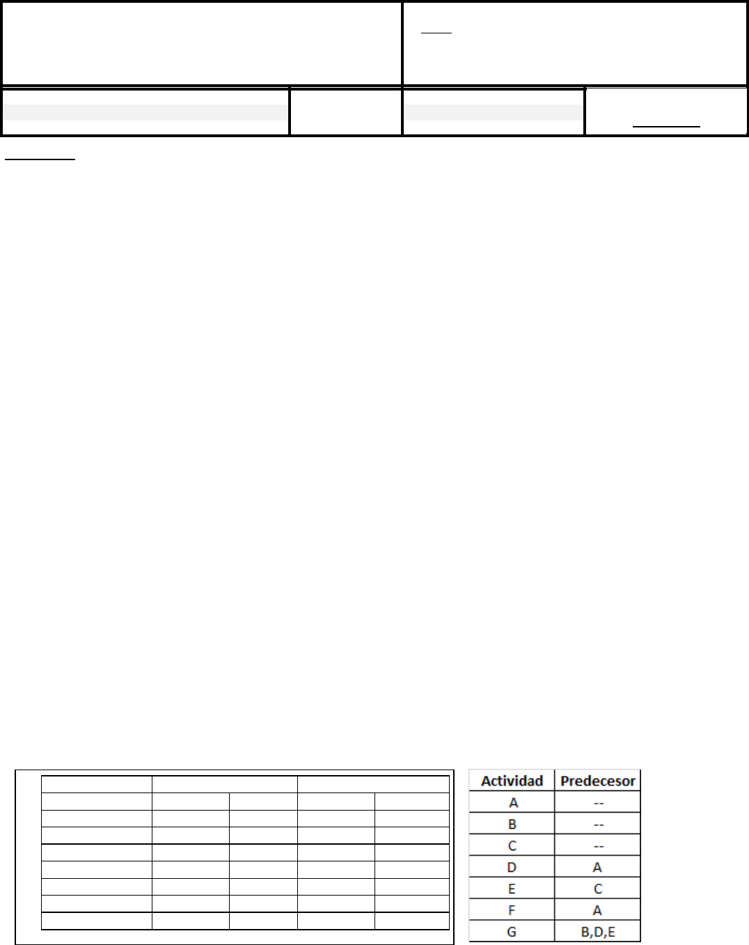 Ejercicios: 1) Que es un proyecto? 2) Enuncie las etapas en el desarrollo de un proyecto. 3) En que se utilizan los Métodos de Camino Crítico? 4) Que Métodos de Camino Crítico conoce? 5) Enuncie y describa las etapas que consideran los métodos de Camino Crítico en el desarrollo de un proyecto. 6) Que entiende por Red y diga cuales son los elementos que la componen. 7) Enuncie las reglas básicas para la construcción de un diagrama de flechas 8) Que es una actividad ficticia. 9) Que es una matriz de precedencias o secuencias. 10) En que consiste el método de numeración de eventos e indique el procedimiento para numeración de redes 11) Que es la programación de actividades 12) Que entienda por Margen de seguridad 13) Que entiende por Método PERT y CPM. 14) Cual es la diferencia en la estimación de los tiempos de duración de cada uno de las actividades del proyecto según se utilice PERT o CPM 15) Que entiende por: Fecha temprana de un suceso; Fecha tardía de un suceso. 16) Enuncie la clasificación de "Márgenes". a) Defina a cada uno de ellos. b) Realice su representación esquemática. 17) Que entiende por: Índice de Criticidad; Porcentaje de aprovechamiento de recursos; Diagrama financiero. 18) Que es un diagrama calendario o diagrama a escala de tiempo? 19) Que es un diagrama de Gantt 20) Que inconveniente presentan los gráficos de Gantt para propósitos de planeamiento. 21) Enuncie las ventajas del CPM con respecto al Gantt. 22) Que es un diagrama de carga de recursos? 23) Para que es utilizado y en que consiste el algoritmo de Burgueses. Cuál es el principio que sigue e indique el proce- dimiento a seguir para su aplicación. 24) Que es un diagrama financiero? 25) Que entiende por Costos Directos e Indirectos? 26) Que entiende por acortamiento de un programa. Cuál es el criterio para reducir la duración de las tareas. Explique el procedimiento a seguir. 27) Explique cuál es el procedimiento para obtener la curva de mínimo costo. a) Cuál es su punto óptimo? b) Cuál es el significado del mismo? 28) Para realizar un proyecto necesitamos ejecutar las siguientes actividades: A, B, C, D, E, F Y G con las siguientes relaciones entre ellas: Con los costos directos normales y máximos correspondientes a las duraciones normales y mínimas que se suministran. Los costos indirectos vienen dados en función de su duración por la expresión: CI = 1200 + TE TE: Tiempo esperado de duración del proyecto. L.U. Nº: ALUMNO: UNIVERSIDAD NACIONAL DE JUJUY FACULTAD DE INGENIERÍA CÁTEDRA: INVESTIGACIÓN OPERATIVA TEMA: PLANIFICACIÓN, PROGRAMACIÓN Y CONTROL DE PROYECTOS TRABAJO PRÁCTICO Nº 9 FECHA: / Oct / 19 CARRERA: ACTIVIDADES DURACIONES COSTOS NORMAL MÍNIMA NORMAL MÁXIMO A 25 15 200 330 B 28 18 130 250 C 19 14 200 220 D 12 8 150 160 E 50 40 800 850 F 15 13 120 136 G 9 8 100 125 2 Se pide: a) Construir el Grafo PERT / CPM normal determinando su camino critico y las holguras total, libre e independiente. b) Costo directo, indirecto y total c) Costo unitario del acortamiento de cada tarea d) Días de reducción posible. e) Camino Crítico Irreducible. f) Duración Óptima del proyecto. 29) La realización de un proyecto se ha previsto según el cuadro siguiente. en donde la actividad A precede a las B, C, y D, y éstas a la E. Se pide calcu- lar, las reducciones posibles y la curva del coste directo del proyecto, indi- cando su variación día a día desde la duración normal hasta la conseguida en el menor tiempo y coste posibles. 30) Dado el cuadro siguiente, con las actividades. necesarias para la realización de un proyecto, con sus tiempos opti- mista, medio y pesimista, así como las reducciones posibles de cada ac- tividad y los costes unitarios de los acortamientos: se pide: a) Construir el Grafo PERT / CPM normal determinando su camino cri- tico y las holguras total, libre e inde- pendiente. b) Duración media del Proyecto. c) Variancia. d) Tiempo mínimo que se necesita para que sea factible el proyecto (pro- babilidad 25%) e) Número de días necesarios para tener la certeza estadística de termi- narlo (probabilidad 97 %). f) Qué costaría reducirlo al tiempo mínimo necesario para hacerlo (proba- bilidad 25 %). g) Probabilidad que el proyecto se haga en 19 días. h) Dibujar el grafo reducido. 31) Dados los siguientes datos, se pide: a) Escriba la matriz de precedencias b) Construya la red correspondiente c) Calcule las fechas tardías y tempranas para cada una de las actividades d) Calcule la holgura para cada actividad y determine el camino critico.siendo sus precedencias-: Actividad Descripción Predecesora Duración A Elegir local -- 3 B Crear Plan -- 5 C Requerim de personal B 3 D Diseñar medios A,C 4 E Construir interior D 8 F Elegir personal C 2 G Contratar nuevos empl F 4 H Mudar oficinas F 2 I Hacer arreglos B 5 J Capacitar personal H,E,G 3 ACTIVIDADES DURACIONES COSTOS NORMAL ACELERADA NORMAL ACELERADA A 15 14 540 620 B 16 12 216 260 C 14 13 180 224 D 15 13 216 260 E 13 --- 288 --- ACTIVIDAD A B C D E F G H I J K L M N t0 2 3 4 6 2 3 1 3 1 3 2 2 2 2 tm 4 6 6 8 4 5 3 6 2 4 3 4 4 5 tp 6 9 8 10 6 7 5 9 3 5 4 6 6 8 Reducción posible 1 4 2 1 2 1 3 1 2 1 1 2 3 1 Coste unitario 5 1 1,5 1 2 4 3 2 4 1 1 3 1 5 siendo sus precedencias-. A PRECEDE A B, E B PRECEDE A C, F C PRECEDE A G, J, M D PRECEDE A H, K H PRECEDE A I,L I PRECEDE A J, M J PRECEDE A N 3 32) Dado el cuadro siguiente con las actividades necesarias para la realización de un proyecto, con sus tiempos opti- mista, medio y pesimista, así corno las reducciones posibles de cada actividad con los costes unitarios de acortamiento y sus precedencias, se pide: Actividad Tiempo Optimista Tiempo Probable Tiempo Pesimista Precedente Reducciones Costo de acorta- miento A 3 5 10 -- 1 100 B 1 1,5 5 -- 5 52 C 1,5 3 4 A 2 98 D 1,2 3,3 4,2 B 3 48 E 2 3,5 5 C 4 150 F 2 2,8 3 D 2 200 G 3 6,5 7 E 3 150 H 2 4 5,2 F 1 120 I 0,5 1 2,3 G,H 2 85 J 0,8 3 4 I 3 105 a) Grafo normal con holguras. b) Duración media del p