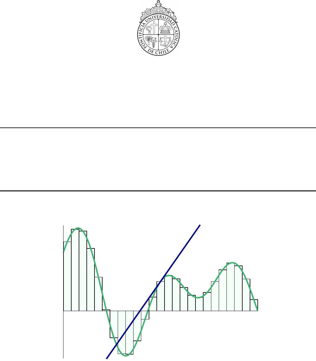 Pontificia Universidad Cat ´ olica de Chile Facultad de Matem ´ aticas � Departamento de Matem´atica Primer Semestre 2014 Cálculo I Resumen de conceptos y problemas resueltos Sebastián Soto Rojas Estudiante de Ingenieŕıa Civil Electricista (spsoto@uc.cl) http://web.ing.puc.cl/~spsoto mailto:spsoto@uc.cl Segunda versión. c� 2013� 2014 Sebastián Soto R. 1 Índice 1. Ĺımites y continuidad 7 1.1. Concepto de ĺımite . . . . . . . . . . . . . . . . . . . . . . . . . . . . . . . . . . . . . 7 1.2. Cálculo de ĺımites y sus propiedades . . . . . . . . . . . . . . . . . . . . . . . . . . . . 11 1.3. Definición y existencia de ĺımites . . . . . . . . . . . . . . . . . . . . . . . . . . . . . 21 1.3.1. Ĺımites por definición . . . . . . . . . . . . . . . . . . . . . . . . . . . . . . . . 21 1.3.2. Existencia de ĺımites . . . . . . . . . . . . . . . . . . . . . . . . . . . . . . . . 29 1.4. Continuidad . . . . . . . . . . . . . . . . . . . . . . . . . . . . . . . . . . . . . . . . . 33 1.4.1. Concepto de continuidad . . . . . . . . . . . . . . . . . . . . . . . . . . . . . . 33 1.4.2. Condiciones de continuidad . . . . . . . . . . . . . . . . . . . . . . . . . . . . 42 1.4.3. Teorema del Valor Intermedio . . . . . . . . . . . . . . . . . . . . . . . . . . . 49 1.5. Ĺımites en infinito . . . . . . . . . . . . . . . . . . . . . . . . . . . . . . . . . . . . . . 56 1.5.1. Ĺımites en infinito . . . . . . . . . . . . . . . . . . . . . . . . . . . . . . . . . 56 1.5.2. Aśıntotas horizontales y verticales . . . . . . . . . . . . . . . . . . . . . . . . . 62 2. Derivadas y diferenciabilidad 67 2.1. Definición de derivada y recta tangente . . . . . . . . . . . . . . . . . . . . . . . . . . 67 2.1.1. Definición de derivada y diferenciabilidad . . . . . . . . . . . . . . . . . . . . . 67 2.1.2. Rectas tangentes . . . . . . . . . . . . . . . . . . . . . . . . . . . . . . . . . . 75 2.1.3. Derivadas y álgebra de ĺımites . . . . . . . . . . . . . . . . . . . . . . . . . . . 80 2.2. Reglas de derivación . . . . . . . . . . . . . . . . . . . . . . . . . . . . . . . . . . . . 84 2.3. Derivación impĺıcita . . . . . . . . . . . . . . . . . . . . . . . . . . . . . . . . . . . . . 93 2.3.1. Curvas impĺıcitas . . . . . . . . . . . . . . . . . . . . . . . . . . . . . . . . . . 93 2.3.2. Funciones inversas . . . . . . . . . . . . . . . . . . . . . . . . . . . . . . . . . 99 2 3. Aplicaciones de la derivada 104 3.1. Tasas de cambio . . . . . . . . . . . . . . . . . . . . . . . . . . . . . . . . . . . . . . . 104 3.2. Teoremas de Rolle y del Valor Medio . . . . . . . . . . . . . . . . . . . . . . . . . . . 107 3.3. Máximos, mı́nimos y gráficos de funciones . . . . . . . . . . . . . . . . . . . . . . . . 119 3.3.1. Repaso conceptual . . . . . . . . . . . . . . . . . . . . . . . . . . . . . . . . . 119 3.3.2. Problemas . . . . . . . . . . . . . . . . . . . . . . . . . . . . . . . . . . . . . . 123 3.4. Regla de L’Hôpital . . . . . . . . . . . . . . . . . . . . . . . . . . . . . . . . . . . . . 140 3.5. Problemas de optimización . . . . . . . . . . . . . . . . . . . . . . . . . . . . . . . . . 144 3.6. Otros . . . . . . . . . . . . . . . . . . . . . . . . . . . . . . . . . . . . . . . . . . . . . 154 4. Integrales 159 4.1. Sumas de Riemann . . . . . . . . . . . . . . . . . . . . . . . . . . . . . . . . . . . . . 159 4.2. Propiedades de la integral . . . . . . . . . . . . . . . . . . . . . . . . . . . . . . . . . 165 4.2.1. Demostración de propiedades . . . . . . . . . . . . . . . . . . . . . . . . . . . 166 4.2.2. Cotas en integrales . . . . . . . . . . . . . . . . . . . . . . . . . . . . . . . . . 168 4.2.3. Teorema del Valor Medio Integral . . . . . . . . . . . . . . . . . . . . . . . . . 171 4.3. Teorema Fundamental del Cálculo . . . . . . . . . . . . . . . . . . . . . . . . . . . . . 173 4.3.1. Teorema Fundamental del Cálculo, parte I . . . . . . . . . . . . . . . . . . . . 173 4.3.2. Teorema Fundamental del Cálculo, parte II . . . . . . . . . . . . . . . . . . . . 187 4.4. Técnicas de integración . . . . . . . . . . . . . . . . . . . . . . . . . . . . . . . . . . . 194 4.4.1. Técnicas de integración básicas . . . . . . . . . . . . . . . . . . . . . . . . . . 195 4.4.2. Fracciones parciales y sustituciones trigonométricas . . . . . . . . . . . . . . . 202 4.4.3. Integrales de repaso . . . . . . . . . . . . . . . . . . . . . . . . . . . . . . . . . 208 4.4.4. Técnicas avanzadas, aplicación y demostración de propiedades . . . . . . . . . 219 4.4.5. Relaciones de recursividad . . . . . . . . . . . . . . . . . . . . . . . . . . . . . 227 3 5. Aplicaciones de la integral 237 5.1. Cálculo de áreas . . . . . . . . . . . . . . . . . . . . . . . . . . . . . . . . . . . . . . . 237 5.2. Cálculo de volúmenes . . . . . . . . . . . . . . . . . . . . . . . . . . . . . . . . . . . . 248 5.3. Sólidos de revolución . . . . . . . . . . . . . . . . . . . . . . . . . . . . . . . . . . . . 251 5.3.1. En torno al eje X y al eje Y : fórmula directa . . . . . . . . . . . . . . . . . . . 251 5.3.2. Por cascarones ciĺındricos . . . . . . . . . . . . . . . . . . . . . . . . . . . . . 254 5.4. Una aproximación intuitiva: series de Fourier . . . . . . . . . . . . . . . . . . . . . . . 259 6. Problemas de alternativas 265 6.1. Selección múltiple . . . . . . . . . . . . . . . . . . . . . . . . . . . . . . . . . . . . . . 265 6.1.1. Soluciones . . . . . . . . . . . . . . . . . . . . . . . . . . . . . . . . . . . . . . 287 6.2. Verdadero o falso . . . . . . . . . . . . . . . . . . . . . . . . . . . . . . . . . . . . . . 288 6.2.1. Soluciones . . . . . . . . . . . . . . . . . . . . . . . . . . . . . . . . . . . . . . 289 4 Introducción El modelamiento matemático es una de las herramientas básicas en las Ciencias de la Ingenieŕıa, por lo que todo estudiante de la carrera debe tener un dominio mı́nimo de conocimientos de Álgebra y Cálculo. En muchos ámbitos de la Ingenie