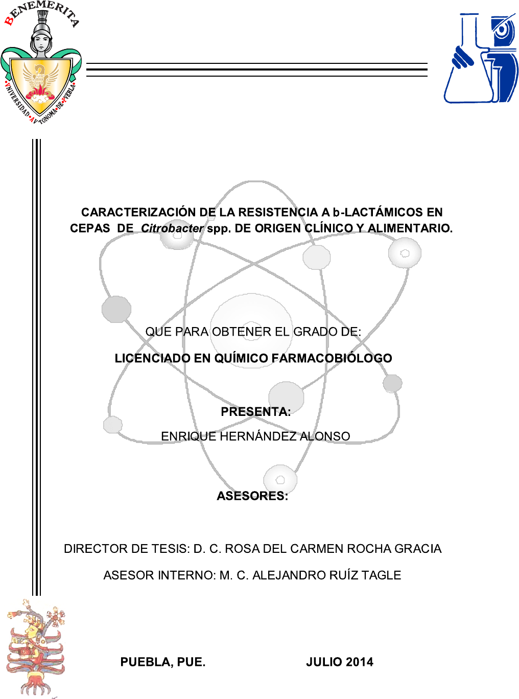 BENEMÉRITA UNIVERSIDAD AUTÓNOMA DE PUEBLA CENTRO DE INVESTIGACIONES EN CIENCIAS MICROBIOLÓGICAS FACULTAD DE CIENCIAS QUÍMICAS DEPARTAMENTO DE MICROBIOLOGÍA T E S I S i CONTENIDO ÍNDICE DE TABLAS Y FIGURAS ........................................................................................ iv ÍNDICE DE GRÁFICAS Y DIAGRAMAS ..............................................................................v AGRADECIMIENTOS INSTITUCIONALES ........................................................................ vi AGRADECIMIENTOS ACADÉMICOS................................................................................ vii AGRADECIMINETOS PERSONALES .............................................................................. viii LEISTA DE ABREVIATURAS ...............................................................................................x RESUMEN ............................................................................................................................ xii INTRODUCCIÓN. ................................................................................................................. 1 MARCO TEÓRICO ............................................................................................................... 2 1. Características generales de las enterobacterias. ...................................................... 2 1.1 Enterobacterias patógenas. .................................................................................... 2 1.2 Enterobacterias Oportunistas. ................................................................................. 3 2. Citrobacter spp. ............................................................................................................. 3 2.1 Características generales del genero Citrobacter spp........................................... 4 2.3 Infecciones causadas por Citrobacter spp. ............................................................ 5 3. Antibióticos -lactámicos. ............................................................................................. 5 3.1 Clasificación de los antibióticos -lactámicos. ....................................................... 6 3.2 Mecanismo de acción de los antibióticos -lactámicos. ........................................ 7 4. Resistencia bacteriana. ................................................................................................. 9 5. -lactamasas. .............................................................................................................. 10 5.1 -lactamasas de espectro extendido (BLEE). ...................................................... 10 5.1.1 BLEE TEM........................................................................................................... 13 5.1.2 BLEE SHV. .......................................................................................................... 14 5.1.3 BLEE OXA........................................................................................................... 15 5.1.4 BLEE CTX-M. ...................................................................................................... 16 5.1.5 BLEE AmpC. ....................................................................................................... 17 5.1.6 Otras BLEE. ........................................................................................................ 18 6. Epidemiología y diseminación de BLEE .................................................................... 20 MARCO DE REFERENCIA ................................................................................................ 22 ii PLANTEAMIENTO DEL PROBLEMA................................................................................ 24 JUSTIFICACIÓN ................................................................................................................. 25 OBJETIVO GENERAL ........................................................................................................ 26 OBJETIVOS ESPECÍFICOS .............................................................................................. 26 METODOLOGÍA. ................................................................................................................ 27 7. Universo de estudio..................................................................................................... 27 8. Tamaño de muestra. ................................................................................................... 27 9. Tipo de estudio. ........................................................................................................... 27 10. Criterios de inclusión. ................................................................................................ 27 11. Criterios de exclusión. ............................................................................................... 28 12. Obtención de Muestras. ............................................................................................ 29 13. Confirmación de cepas. ............................................................................................ 29 14. Determinación de sensibilidad a antibióticos. .......................................................... 30 15. Selección de cepas para amplificación de genes. .................................................. 32 16. Amplificación de genes BLEE. ................................................................................. 32 17. Templado para la amplificación. ............................................................................... 34 18. Condiciones para las PCR’s. .................................................................................... 35 19. Visualización de los productos de PCR. .................................................................. 37 20. Purificación de los productos de PCR...................................................................... 37 21. Secuenciación de los genes amp