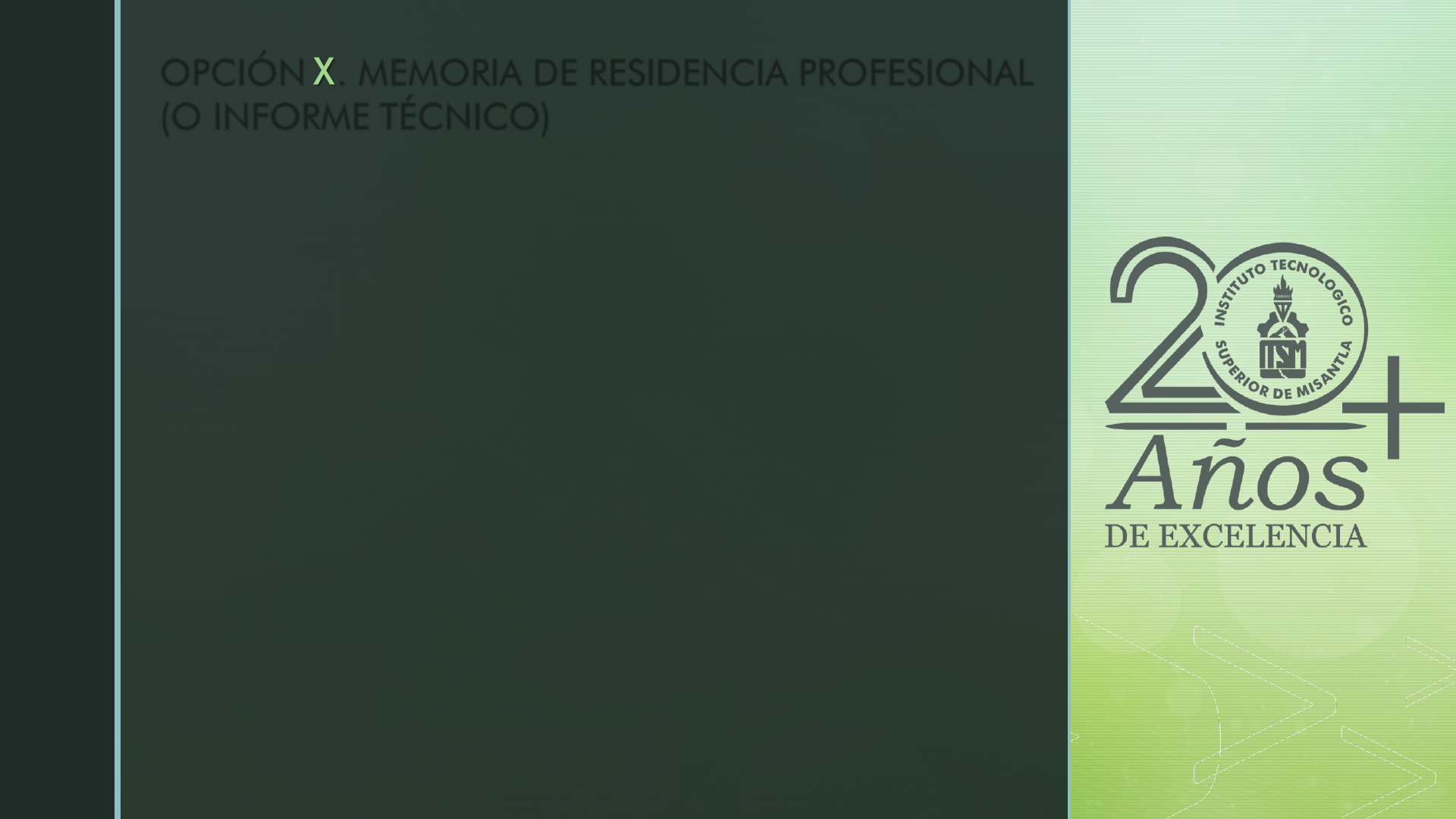 1.- Portada. 2.- Reconocimientos o agradecimientos. 3.- Índice de contenido. 4.- Introducción. 5.- Justificación. 6.- Objetivos: Generales y específicos. 7.- Caracterización del área en que participó. 8.- Planteamiento del problema. 9.- Alcances y limitaciones. OPCIÓN X. MEMORIA DE RESIDENCIA PROFESIONAL (O INFORME TÉCNICO) R E Q U I S I T O S 10.-Fundamento teórico. 11.- Procedimiento y descripción de las actividades realizadas. 12.- Resultados. 13.- Conclusiones y recomendaciones. 14.- Bibliografía. 15.- Anexos. 16.- Glosario. OPCIÓN X. MEMORIA DE RESIDENCIA PROFESIONAL (O INFORME TÉCNICO) R E Q U I S I T O S