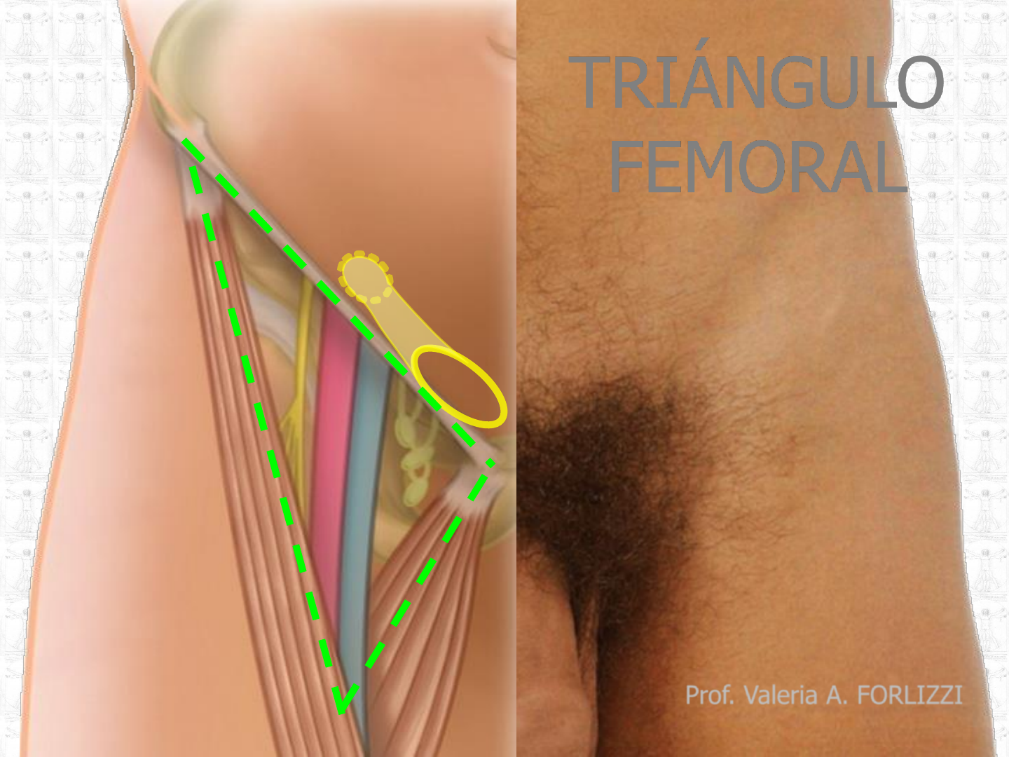 TRIÁNGULO FEMORAL Prof. Valeria A. FORLIZZI Tríangulo femoral: - Límite superior: ligamento inguinal. - Límite lateral: borde medial del m. sartorio. - Límite medial: borde lateral del m. aductor largo. - Límite profundo (posterior): m. iliopsoas y m. pectíneo. - Límite superficial (anterior): fascia cribosa (dependencia de la fascia lata) Presenta un acceso superior: ESPACIO SUBINGUINAL Espacio subinguinal Laguna muscular Laguna vascular Conducto inguinal Anillo inguinal profundo Anillo inguinal superficial Anillo femoral Espacio subinguinal: - Límite anterior: ligamento inguinal. - Límite posterior: borde anterior del coxal. Dividido por el arco iliopectíneo en - LAGUNA MUSCULAR - LAGUNA VASCULAR Laguna muscular: - Límite anterior: ligamento inguinal. - Límite posterior: borde anterior del ilion. - Límite medial: arco iliopectíneo. Contenido: - M. iliopsoas. - N. femoral. - N. cutáneo femoral lateral. Laguna vascular: - Límite anterior: ligamento inguinal. - Límite posterior: ligamento pectíneo [Cooper]. - Límite lateral: arco iliopectíneo. - Límite medial: ligamento lacunar [Gimbernat] Contenido: - R. femoral del n. genitofemoral - A. femoral - V. femoral - Anillo femoral Anillo femoral: - Límite anterior: ligamento inguinal. - Límite posterior: ligamento pectíneo [Cooper]. - Límite lateral: vena femoral. - Límite medial: ligamento lacunar [Gimbernat] Está cerrado por el tabique femoral (fascia transversalis) En la concavidad del lig. lacunar: - Nodo linfático inguinal profundo proximal [Cloquet] : - Hoja anterior: prolongación de la fascia transversalis. - Hoja posterior: fascia iliopsoas y fascia pectínea. Contenido: - Arteria femoral - Vena femoral - CONDUCTO FEMORAL : - Forma cónica. - Extremo superior: anillo femoral cerrado por el tabique femoral. - Extremo inferior: llega hasta el hiato safeno. Contenido: - Nodos linfáticos inguinales profundos. nodos Trayecto de los vasos femorales: - Extremo superior: laguna vascular. - Primera porción: triángulo femoral. - Segunda porción: conducto aductor. - Extremo inferior: hiato aductor. © A n a to m ía C lí n ic a - E d u a rd o P ró - 2 0 1 4 BIBLIOGRAFÍA - Ferreira, Teragni, Pró, Forlizzi. Atlas Fotográfico de Anatomía Humana. Ed. Weber Ferro. 1995 - Pró. Anatomía Clínica. Ed. Médica Panamericana. Ed. 2ª. 2014 - Schünke, Schulte, Schumacher, Voll, Wesker. Prometheus. Texto y Atlas de Anatomía. Ed. Médica Panamericana. Ed. 2ª. 2011. Consulta online http://www.atlasprometheus.com - Thiel. Photographischer Atlas der Praktischen Anatomie. Ed. Springer. 2005 vforlizzi@gmail.com