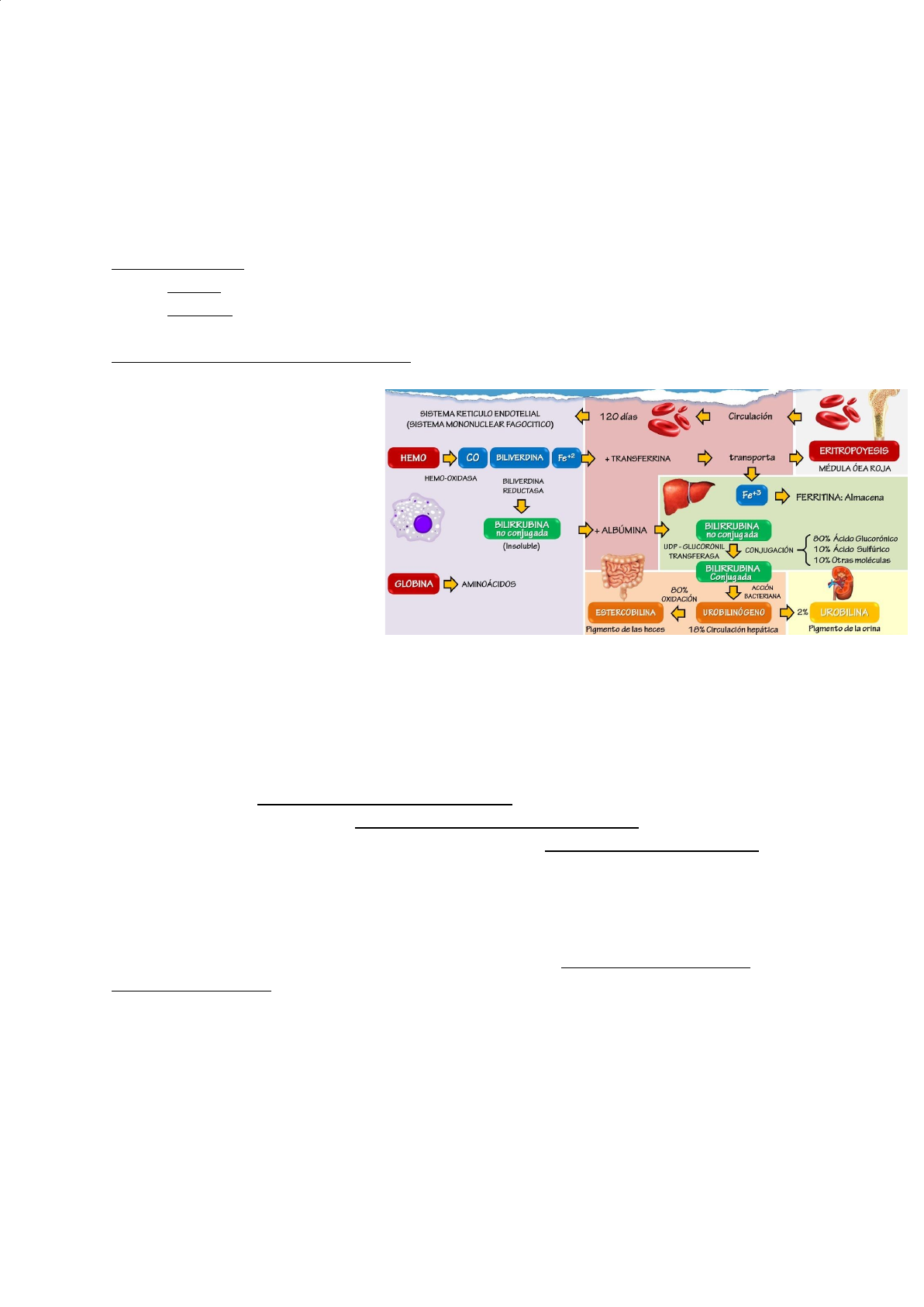 BILIRRUBINA: Diariamente se producen 300 mg. - 85% se origina por catabolismo de la hemoglobina presente en los eritrocitos maduros circulantes - 15% de otras fuentes (mioglobina, cit p450, etc.) Bilirrubina normal: menor a 1,2 mg/dl. - Directa: 0,2 mg/dl (0-0,3 mg/dl) - Indirecta: 0,5 mg/dl (0,3-0,7 mg/dl) METABOLISMO DE LA BILIRRUBINA La hemo-oxigenasa actúa sobre el hemo formando cantidades equimolares de monóxido de carbono, hierro y biliverdina. Para que ocurra la reacción es necesaria la presencia de oxígeno y NADPH. Posteriormente la biliverdina es convertida, por acción de la enzima biliverdina reductasa, en bilirrubina indirecta/no conjugada. ● Bilirrubina indirecta o no conjugado: Es poco soluble. Viaja unida a proteínas (albúmina, no filtra a nivel renal). Es TÓXICA. Atraviesa la BHE. La mando al hígado para conjugarla, captada por por la membrana basal los hepatocitos (polo vascular). La uno con proteínas ligadoras Y y Z. Es transportada al retículo endoplásmico y se conjuga con dos moléculas de ácido glucurónico, mediado por enzima UDP glucuronil transferasa, formando di-glucuronato o bilirrubina directa/conjugada. ● Bilirrubina directa o conjugada: Es soluble, puede viajar en sangre y filtrar a nivel renal. Es POCO TÓXICA. En el tubo digestivo, el ácido glucurónico es liberado por la enzima glucuronidasa de bacterias intestinales y la bilirrubina resultante es convertida a urobilinógeno por reductasas de bacterias intestinales. El urobilinógeno, incoloro, da lugar a urobilina y estercobilinógeno. BD se puede eliminar: - 80% por heces: le da color - 20% restante puede: ● 90% circulación enterohepática (reabsorbido) ● 10% va a la orina: no le da color a la orina, esta es amarilla por otros componentes. ICTERICIA: coloración amarilla de piel, mucosas y escleróticas. Hay bilirrubina total (BI+BD) superior a 2 mg/dl→ Hiperbilirrubinemia: 1,2 a 2 mg/dl. De acuerdo a su origen, se clasifican las ictericias en: ● PRE HEPÁTICA: Problema antes de la conjugación, que generan la aumento de bilirrubina indirecta. Causas: La causa más común es hemólisis. Otras son: anemia falciforme y hemolítica (patología: incompatibilidad materno-fetal) Hay mucha bilirrubina indirecta, por ende el hígado, que esta bien, conjuga mucho. Llega un punto en que se satura, no puede conjugar toda la BI. Al conjugar mucho, hay aumento de la bilirrubina directa. Esta se elimina por heces (80%) y por orina. Elimina mucho más por las heces, tiene mucha coloración -> HIPERCOLIA. Se elimina por orina, tiene color normal. En sangre: - indirecta: AUMENTADA - directa: NORMAL ● HEPÁTICA: Problema en el hígado. Este capta, conjuga y excreta. Causas comunes: cirrosis y hepatitis. - Problema en la captación: mucha bilirrubina indirecta, porque capta menos. Clínica similar a prehepática. - Problema en la excreción: mucha bilirrubina directa, porque no puedo excretar. Clínica similar a posthepática. - Problema en la conjugación: mixto (mucha BD + BI) ● POST HEPÁTICA: Problema de excreción, que genera aumento de la bilirrubina directa. Causas comunes: Alteraciones estructurales del tracto biliar, colelitiasis (cálculos en la vesícula), atresia congénita de las vías biliares extrahepáticas, etc. La causa más común es una obstrucción en las vías biliares. La BI es normal, se conjuga a BD como corresponde, pero no puedo excretar al intestino. Por lo que no hay eliminación por las heces, estas no tienen color: acolia. La BD retrodifunde al hígado y va a la sangre. Es hidrosoluble, filtra a nivel renal. Aumenta en orina, oscureciéndola: coluria. En sangre: - indirecta: NORMAL - directa: AUMENTADA