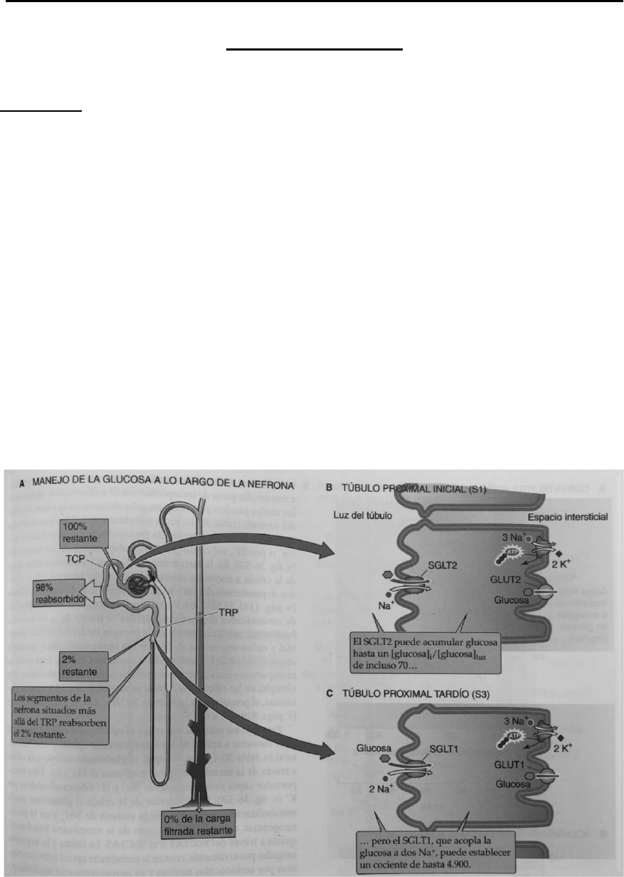 Nicolas Fantozzi. R1 UA2 Fisiología 1 Manejo renal de Glucosa, Calcio, Fosforo y Magnesio GLUCOSA: Este soluto se filtra libremente en el glomérulo, pero luego, se reabsorben grandes cantidades, de forma que en la orina solo aparecen normalmente muy bajas concentraciones. El Túbulo Contorneado Proximal es el encargado de reabsorber casi la totalidad de la carga de glucosa que se filtra, sobre todo en su primer segmento (S1). La glucosa restante es reabsorbida en segmentos más distales del TCP. A medida que la glucosa se reabsorbe en la parte inicial del TCP, disminuye su concentración en la luz tubular, cayendo a valores mucho menores que los del intersticio. Por lo tanto, la reabsorción se hace en contra del gradiente y esta debe ser activa para poder realizarse. La reabsorción se da por un Cotransporte de Na+/Glucosa (SGLT1, SGLT2) que se encuentra en la membrana apical de las células del túbulo contorneado proximal. Gracias al gradiente electroquímico del Na+, que se establece por la Bomba Na+/K+ basolateral, se impulsa el transporte contragradiente de la glucosa hacia el interior celular (Transporte activo secundario). Nicolas Fantozzi. R1 UA2 Fisiología 2 La captación de glucosa en el S1 está mediada por un trasportador (de baja afinidad, pero alta capacidad) llamado SGLT2, el cual es el encargado de la reabsorción del 90% de la glucosa y realiza el cotrasporte 1:1 de sodio: glucosa. Por otro lado, la captación de la glucosa a nivel del Segmento 3 (parte final del TCP) se da por un cotrasportador (de alta afinidad, pero baja capacidad) llamado SGLT1, este posee una estequiometria de 2:1 entre el sodio y la glucosa. Una vez en el interior celular, sale de ella por la membrana basocelular, a través de un transportador de glucosa llamado GLUT (que es independiente del sodio) y mueven a la glucosa por difusión facilitada. El GLUT2 se encuentra en el S1 y el GLUT1 en el S3. En condiciones normales el porcentaje de glucosa que se excreta es muy cercano al 0%, pero en condiciones que la glucosa en plasma supera el umbral, se empezaran a ver cantidades de glucosa en la orina. Este umbral es de aproximadamente 200mg/dl y a partir de este, la excreción de glucosa aumentara linealmente a medida que aumente su concentración en plasma. También, los SGLT muestran otra característica, que es la saturación. La tasa de reabsorción de glucosa puede alcanzar una meseta, que es el Transporte máximo o Tm (Aproximadamente de 400mg/min). A partir de este, los trasportadores no pueden responder a incrementos adicionales de la glucosa filtrada. Este se da de manera gradual y no de manera brusca. CALCIO: La concentración total del Calcio plasmático es aproximadamente de 8,8 a 10,6 mg/dl. Un 40% está unido a proteínas, principalmente a la albumina y este constituye la porción NO FILTRABLE. El 60% restante forma la porción FILTRABLE y este se conforma de dos fracciones; el 15% lo compone el Calcio único a aniones pequeños como carbonato, fosfato. Y el 45% restante es el Calcio ionizado (Ca2+), este es el que el cuerpo regula de forma estricta (Su concentración es de 4 a 5,2mg/dl aproximadamente). De la porción que se puede filtrar, los riñones absorben el 99%, especialmente en el Túbulo Contorneado Proximal, la Rama Ascendente Gruesa de Henle y el Túbulo Contorneado Distal. Nicolas Fantozzi. R1 UA2 Fisiología 3 Túbulo Contorneado Proximal: Se reabsorbe aproximadamente el 65% del calcio filtrado, por un proceso sin control hormonal. Prácticamente toda la reabsorción se da por la ruta paracelular. Cuando existe un voltaje transepitelial positivo en la luz, se favorece la reabsorción del calcio. La reabsorción pasiva de calcio depende en gran medida también, de la concentración luminal de este. A mayor concentración, más gradiente transepitelial y así, más reabsorción. Cuanto mayor sea la reabsorción de líquido a través del túbulo proximal, mayor es la concentración de calcio en la luz y mayor es su reabsorción. Por ejemplo, si comenzamos a ingerir una dieta rica en NaCl, la cual aumentaría el volumen extracelular y reduciría la reabsorción de agua y Na+, también se reduciría la reabsorción de Ca2+ y aumentaría su excreción urinaria. Lo que aumentaría el riesgo de desarrollar cálculos renales. Rama ascendente gruesa: Se reabsorbe cerca del 25% del calcio filtrado. La mayor parte de esta reabsorción se da por vía paracelular de forma pasiva impulsada por un voltaje positivo en la luz. Los diuréticos que actúan en este segmento (ej: Furosemida), inhiben la generación de este voltaje transepitelial positivo e imposibilitan la reabsorción del calcio. Túbulo Contorneado Distal: Se reabsorbe aproximadamente el 8% del calcio filtrado. Esta es una zona reguladora importante para la excreción de Calcio. En este, la reabsorción se hace por medio de una ruta transepitelial activa y consta de dos etapas; la primera por una entrada pasiva de Ca2+ a través de canales apicales favorecida por un gradiente electroquímico importante y la segunda por la salida del calcio de la célula por un intercambiador de Na+/Ca2+ y una bomba de Ca2+ ATPasa en la membrana basolateral. Nicolas Fantozzi. R1 UA2 Fisiología 4 Regulación: Hormona Paratiroidea (PTH): Es el regulador más importante para la reabsorción renal de calcio. Ejerce su acción a nivel del TCD incrementando la transcripción de los canales de calcio en la membrana apical e inhibiendo su endocitosis. Vitamina D: Aumenta la reabsorción del calcio a nivel de la nefrona distal, estimulando la transcripción de canales de calcio. Concentración plasmática de Ca2+: El Ca2+ extracelular se une a un receptor detector de Ca2+ en la membrana basolateral del Asa Ascendente Gruesa de Henle, lo que lleva a una disminución del potencial transepitelial positivo de la luz y da lugar a una disminución de la permeabilidad paracelular del Ca2+ produciendo una disminución en la reabsorción y aumento en su excre
