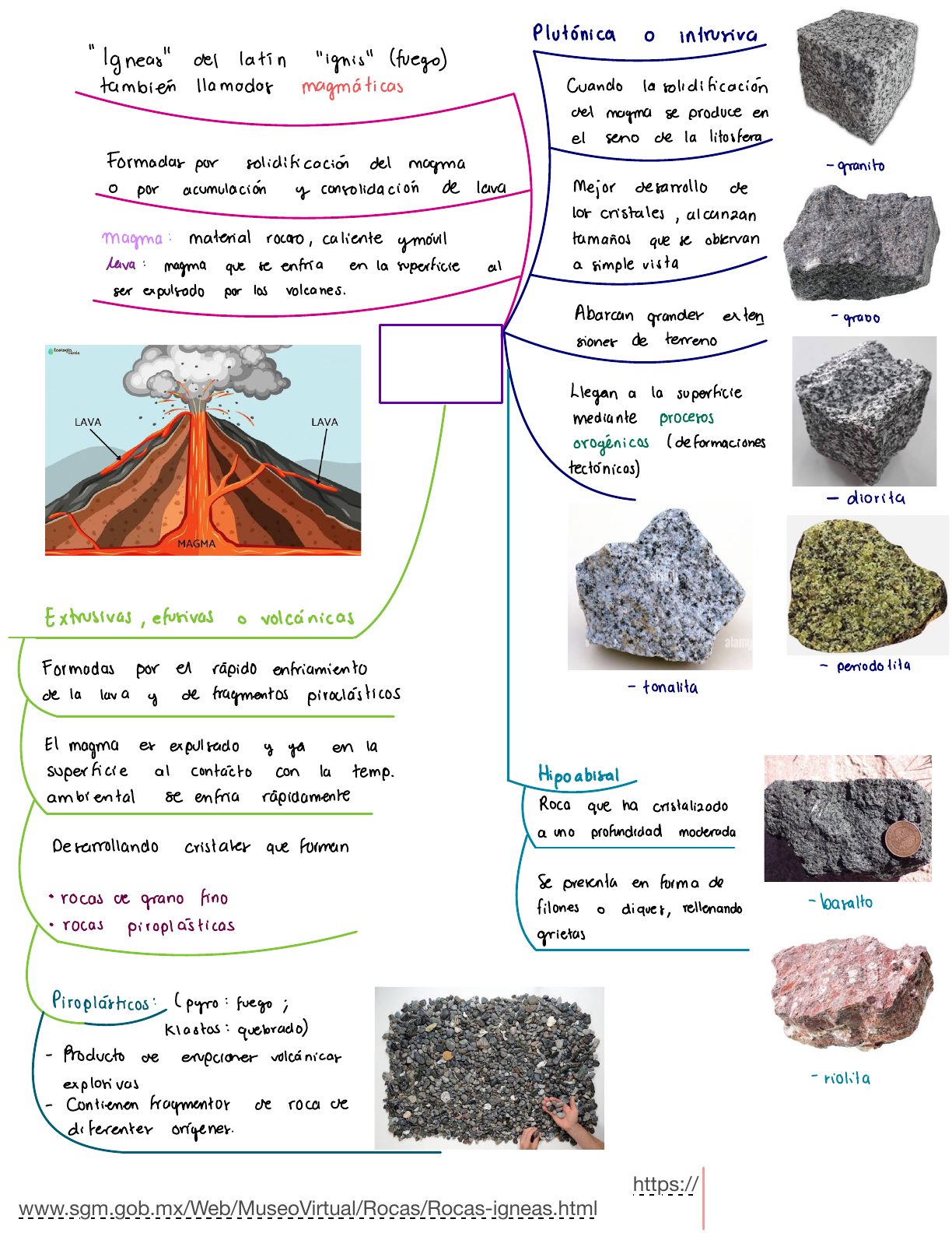 Rocas ígneas López Romero María Fernanda 21 oct 2022 Servicio Geológico Mexicano, 2020. “Rocas ígneas” consultado en https:// www.sgm.gob.mx/Web/MuseoVirtual/Rocas/Rocas-igneas.html " Igneas " del latín " ignis " (fuego) también llamadas magmáticas Cuando la solidificación del magma se produce en "" """""" " ... """" ◦ "" el seno de la litosfera Formadas por solidificación del magma - granito Mejor desarrollo de los cristales , alcanzan magma : material rocoso , caliente ymóvil tamaños que se observan lava : magma que se enfría en la superficie al a simple vista ser expulsado por los volcanes . Abarcan grandes exten - grabo sioner de terreno Llegan a la superficie mediante procesos orogénicos ( deformaciones tectónicas)TY """"www.g.amu.g.uua.ua,}-Formadas por el rápido enfriamiento - periodo tita de la lava y de fragmentos piroclásticos - tonalita El magma es expulsado y ya en la superficie al contacto con la temp . Hipo abisal ambiental se enfría rápidamente """ """ a una profundidad moderada Desarrollando cristales que forman se presenta en forma de • rocas oe grano fino filones o diques , rellenando - basalto( una, µ , , ,, agua, grietas Piroclásticos : ( pyro : fuego ; klastos : quebrado) - Producto de erupciones volcánicas explosivas - riolita - Contienen fragmentos de roca de diferentes orígenes.