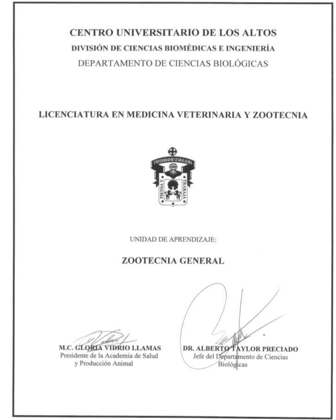 UNIVERSIDAD DE GUADALAJARA FORMATO GENERAL PROGRAMA DE ASIGNATURA NOMBRE DE MATERIA CODIGO DE MATERIA DEPARTAMENTO AREA DE FORMACION CENTRO UNIVERSITARIO CARGA HORARIA TEORIA PRACTICA TOTAL CREDITOS TIPO DE CURSO FORMACION PROFESIONAL PREREQUISITOS ELABORO: Fecha última actualización REVISORES DE BIBLIOGRAFÍA: APROBADO POR COLEGIO DEPARTAMENTAL JULIO 2015 ZOOTECNIA GENERAL PN 135 CIENCIAS BIOLOGICAS OPTATIVA ABIERTA CENTRO UNIVERSITARIO DE LOS ALTOS 42 42 88 7 TEORICO PRÁCTICO LICENCIATURA EN MÉDICO VETERINARIO Y ZOOTECNISTA JUNIO 2015 ING. JESUS ALVAREZ GONZALEZ, M.C. ALICIA LUNA VEGA, M.C. ENRIQUE VAZQUEZ AVALOS PhD. J. Rogelio Orozco Hernández, M.C. Gloria Vidrio Llamas Ninguno OBJETIVO GENERAL OBJETIVOS ESPECIFICOS Al término del módulo, El alumno conocerá las bases del manejo de las explotaciones de los animales domésticos El alumno conocerá la importancia de la zootecnia en el desarrollo social CONTENIDO TEMATICO SINTETICO ZOOTECNIA GENERAL I.- Introducción 1.1-Historia 1.2 Funciones de la zootecnia 1.3 Desarrolló político 1.4 Desarrollo social 1.5 Desarrollo económico II.- Situación actual de la ganadería en México 2.1. Estadística 2.2. Problemas de la ganadería de México 2.3. Alternativas III.- Sistemas de producción pecuaria en México 3.1. Regiones ecológicas IV.- Razas de prehistóricas 4.1. Bovinos de leche 4.2. Bovinos de carne 4.3. Porcinos 4.4. Ovinos 4.5. Caprinos 4.6. Aves V.- Biología y fisiología de la reproducción VI.- Anatomía y fisiología del aparato digestivo VII.- Instalaciones y equipo 7.1. Instalaciones y equipo 7.1.1. Instalaciones por etapa biológica VIII.- Manejo 8.1. Sistemas de identificación IX.- Forrajes 9.1. Importancia 2.- Principales plantas forrajeras ESTRUCTURA CONCEPTUAL ACADEMIA: SALUD Y PRODUCCIÓN ANIMAL PRODUCCIÓN PECUARIA RAZAS INSTALACIONES MANEJO ESPECIES PRODUCTIVAS ZOOTECNIA GENERAL BIBLIOGRAFIA BASICA BIBLIOGRAFIA COMPLEMENTARIA Fecha última actualización: JUNIO 2015 Avila Téllez, Salvador Producción de leche con ganado bovino 2010 México: Manual moderno, c2010. Bassom, Frances Razas y cría de pollos y gallinas: una guía práctica para el avicultor 2010 Barcelona: Ediciones Omega, S.A., c2010. Cantú Brito, Jesús Enrique. Zootecnia de ganado caprino 2008 México: Editorial Trillas, 2008. Damerow, Gail Guía de la cría de pollos y gallinas: cuidados, alimentación, instalaciones 2011 Barcelona: Ediciones Omega, Durán Ramírez, Felipe Manejo y nutrición en aves de corral: construcciones, equipo, manejo, nutrición 2009 Colombia: Grupo Latino, 2005 Durán Ramírez, Felipe El manual del caballo 2008 Colombia: Grupo Latino Editores, Gellon, Gabriel El huevo y la gallina: manual de instrucciones para construir un animal 2004 Buenos Aires, Argentina: Siglo XXI Editores Argentina S.A., ©2004, reimpresión 2008, 4ª. Reimp. 2012. Lesur, Luis Manual de cría y manejo de borrejos: una guía paso a paso 2005 México: editorial Trillas, 2005 Lesur, Luis Manual de porcicultura: una guía paso a paso 2003 México, editorial Trillas, 2003 Lesur, Luis Manual del ganado bovino para carne: una guía paso a paso 2005 México: Trillas, 2005. Mannetje L.T., R.M. Jones. Field and laboratory methods for grassland and animal production research 2000 Usa : Cab, 2000 Ortiz Ríos, Carlos Daniel. Guía para alimentación animal y elaboración de concentrados 2003 Bogotá: Convenio Andrés Bello: UPAR, c2003. Oteiza Fernández, José Diccionario de zootecnia 2001 México: Trillas, c2001. Sañudo Astiz, Carlos Atlas mundial de etnología zootécnica 2011 Zaragoza, España: Grupo Asís Biomedia, S.L.: Servet, ©2011. Taylor, Robert E. Scientific farm animal production. an introduction to animal science 1998 USA: Prentice Hall, 1998 Flores Covarrubias, Javier. Cálculos para la planeación y control de empresas porcinas 2005 México: Facultad de Medicina Veterinaria y Zootecnia, UNAM : McGraw-Hill / Interamericana, c2005. Moreno Chan, Ricardo. Ciencia veterinaria 2007 México: UNAM, Facultad de Medicina Veterinaria y Zootecnia., Phillips, C.J.C. Principios de producción bovina 2003 Zaragoza: Acribia, 2003 Pond, Wilson G. Introducción a la ciencia animal 2006 Zaragoza: Editorial Acribia, 2006. http://148.202.105.23:8991/F/UNPQ3CGXVLDNFBYR6XV3GIJ4S3Y5ASLXQ6YSI44FMAX3XQK7R7-01984?func=full-set-set&set_number=559409&set_entry=000001&format=999 http://148.202.105.23:8991/F/UNPQ3CGXVLDNFBYR6XV3GIJ4S3Y5ASLXQ6YSI44FMAX3XQK7R7-08778?func=full-set-set&set_number=559345&set_entry=000005&format=999 http://148.202.105.23:8991/F/UNPQ3CGXVLDNFBYR6XV3GIJ4S3Y5ASLXQ6YSI44FMAX3XQK7R7-08778?func=full-set-set&set_number=559345&set_entry=000005&format=999 http://148.202.105.23:8991/F/5J2469LCU6H1YKAUHF4SJEU85MFS66DAN2PA2UFJAI75I9ELGC-00807?func=full-set-set&set_number=558649&set_entry=000003&format=999 http://148.202.105.23:8991/F/UNPQ3CGXVLDNFBYR6XV3GIJ4S3Y5ASLXQ6YSI44FMAX3XQK7R7-08203?func=full-set-set&set_number=559340&set_entry=000002&format=999 http://148.202.105.23:8991/F/UNPQ3CGXVLDNFBYR6XV3GIJ4S3Y5ASLXQ6YSI44FMAX3XQK7R7-08203?func=full-set-set&set_number=559340&set_entry=000002&format=999 http://148.202.105.23:8991/F/UNPQ3CGXVLDNFBYR6XV3GIJ4S3Y5ASLXQ6YSI44FMAX3XQK7R7-09435?func=full-set-set&set_number=559351&set_entry=000010&format=999 http://148.202.105.23:8991/F/UNPQ3CGXVLDNFBYR6XV3GIJ4S3Y5ASLXQ6YSI44FMAX3XQK7R7-09435?func=full-set-set&set_number=559351&set_entry=000010&format=999 http://148.202.105.23:8991/F/UNPQ3CGXVLDNFBYR6XV3GIJ4S3Y5ASLXQ6YSI44FMAX3XQK7R7-00940?func=full-set-set&set_number=559386&set_entry=000006&format=999 http://148.202.105.23:8991/F/UNPQ3CGXVLDNFBYR6XV3GIJ4S3Y5ASLXQ6YSI44FMAX3XQK7R7-03861?func=full-set-set&set_number=559232&set_entry=000004&format=999 http://148.202.105.23:8991/F/UNPQ3CGXVLDNFBYR6XV3GIJ4S3Y5ASLXQ6YSI44FMAX3XQK7R7-03861?func=full-set-set&set_number=559232&set_entry=000004&format=999 http://148.202.105.23:8991/F/5J2469LCU6H1YKAUHF4SJEU85MFS66DAN2PA2UFJAI75I9ELGC-00825?func=full-set-set&set_number=5586