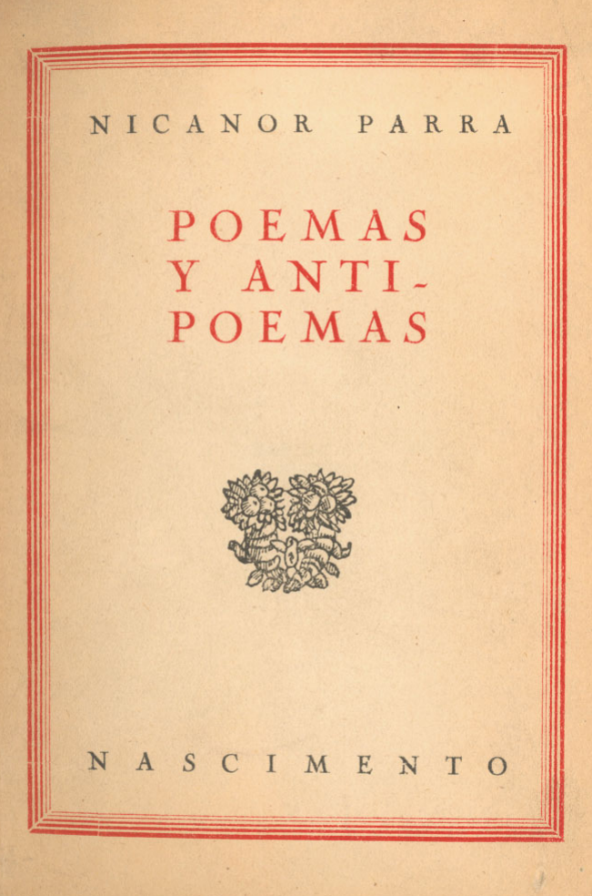 “ Y A N T I - ‘ I M E M T C A N O R P A R R A P o e m a s y Antipoemas del Concurso Nacional de Poesia inado por el Sindicato de Escritores de Chile L S C I M E N T O S A N T I A G O C H I L E 1 9 5 4 N.0 2689 E+ propiedad Inscripcidn N.. 16353 Impreso en lor tallmu de la Editorial Nascimeam - AINIO Prat 1428 - Santiago de Chile, 1994 I S I N F O N I A DE CUNA Una vez Por un 1 Con un Sin quer Buenos 1 Yo le cc El en ca Per0 yo andando parque i n g k dias, dijo, ,n tes t6. s tellano, en francis. Dites moi, don angel, Comment va monsieur. - 9 me di6 la mano, Yo le tom6 el pie: Como un Bngel es! tiHay que ver, sefiores, r Fatuo como el cisne, FGO como un riel, Gordo como un pavo, Feo como usted. Susto me di6 un poco Per0 no arranqu6. Le busquk las plumas, Plumas encontr6, Duras como el duro Cascar6n de un pez. f iBuenas con que hubiera 1 Sido Lucifer! Se enoj6 conmigo, M e tir6 un rev68 Con su eepada de oro, Yo me le agachb. 10 Angel mbs absurd0 Non volvere a ver. pc- Muerto de la risa Dije good bye sir, Siga su camino, Que le vaya bien, 1 Que la pise el auto, Que la mate el tren. L Ya se acabb el cuento, 1 Uno, dos y tree. 11 D E F E N S A D E L A R B O L I Por qui te entregas a esa piedra INiiio de ojos almendrados \Con el impuro pensamiento / D e derramarla contra el 6rboI. ‘-sq Quien no hace nunca daiio a nadie No se merece tan mal trato. Ya sea sauce pensat;vo Ya melanccilico naranjo Debe ser siempre por el hombre Bien distingddo y respetado: Niiio perverso que lo hiera Hiere a su padre y a su hermano. Yo no comprendo, francamente, Ccimo es posible que un muchacho 15 Tenga este gesto tan indigno Siendo tan rubio y delicado. Seguramente que tu madre No sabe el cuervo que ha criado, Te Cree un hombre verdadero, Yo pienso todo lo contrario: Creo que no hay en todo Chile Nifio tan mal intencionado. iPor quh te entregas a esa piedra Como a un pufial envenenado, Tti que comprendes claramente La gran persona que es el brbol! El da la fruta deleitosa Mss que la leche, mbs que el nardo; Lefia de or0 en el invierno, Sombra de plata en el verano Y, lo que es mbs que - todo - junto, C e o x e T t o s - - b 10s pbjaros. p’-l -LT--.- - . - ”.- Que no hay amigo como el brbol, Adonde quiera que te vuelvas Siempre lo encuentras a tu lado, Vayas pisando tierra firme 0 m6vil mar alborotado, Esths meci6ndote en la cuna 0 bien un dZa agonizando, Mbs-fie1 -que_el-&Lio.-del eepejo ~‘ l ;nbs sumiso que un esclavoL iensao ien y reconoce - 16 bo Io que hacee I te est6 mirando, ir que te perdone imo pecado la piedra ingrata > de tu mano. c__ 17 C A T A L I N A P A R R A Caminando soIa Por ciudad extraiia Que serd de nuestra Catalina Parra. Cudnto nempo iun aiio! Que no SB palabra De esta memorable Catalina Parra. Bajo impenitente Lluvia derramada D6nde ird la pobre Catalina Parra. 2L iAh, si yo supiera! Per0 no s$ nada Cud es tu destino Catalina PLlida. S6lo sk que mientras Digo estas palabras En volver a verte Cifro la esperanza. a Aunque sblo seas Vista a la distancia NiEa inolddable, Catalina Parra. Hija mia, jcuLntas Veces comparada Con la rutilante Luz de la maiiana! Ay. amor perdido, i LQmpara sellada! Que esta rosa nunca Pierda 22 P R E G U N T A S A L A H O R A D E L T E Este sefior desvaido parece Una figura de un museo de cera: Mira a trav6s de 10s visillos rotos: Que vale mLs, jel or0 o la belleza?, - iVaIe mLs el arroyo que se mueve 0 TaXpZa-Ka _--- --I -%-Ti xi&&;? A - b j o s se oye una campana Que abre una herida m b , o que la cierra: iEs mbs real el agua de la fuente 0 ‘Tamu&acha que se mira e n ella? NG se sabe, la gente se lo pasa Construyendo castillos en la arena: r jEs superior el vas0 transparente I A la mano del hombre que lo crea? .-_- 25 Se respira una atm6sfera cansada De ceniza, de humo, de tristeza: Lo que se vi6 una vez ya no se vuelve A ver igual, dicen las hojas secas. Hora del t6, tostadas, margarina, Todo envuelto en una especie de niebla 26 r H A Y U N D I A F E L I Z A recorrer me dediqu6 esta tarde Las solitarias calles de mi aldea Acom paEado - por - -__I el .. buen- cre pGsculo - r - - - T - - ue es ̂___ e Gnicp_amigo-que-me * - -- queda. TGG est6 como entonces, el otozo Y su difusa lbmpara de niebla, S ~ l o que el tiempo lo ha invadido todo Con su pdido manto de tristeza. Nunca pens&, cre6dmelo. un instante Volver a ver esta querida tierra, Per0 ahora que he vuelto no comprendo Cbmo pude alejarme de su puerta. Nada ha cambiado, ni sus casas blancas Ni sus vieios portones de rnadez. L 29 Todo est& en su lugar: las golondrinas En la torre mhs alta de la iglesia; El caracol en el jardin: y el musgo En las hizrnedas manos de Ias Fedras. No se puede dudar, este es el reino Del cielo azul y de las hojas secas En donde todo y cada cosa tiene Su singular y plbcida leyenda: Hasta en la propia sombra reconozco Ea mirada celeste de mi 2buela. Estos fueron 10s hechos memorables Que presencici mi juventud primera, El correo en la esqEina de la plaza Y la humedad en las rnuralllas viejas. iBuena cosa. Dios mio! nunca sabe i 1 2: Es A Y Que Una Up- .n~"YI~S.3 VIllhP nnrnrPrn VE Ea . cc \ Cl AI establo volvian Ias ovejas. - ____ ____, - ~ _ _ ~~- . apreciar la dicha verdadera, .ndo la imaginamos mbs lejana justamente cuando est& mSs cerca. de mi, iay de mi! algo me dice ! la vida no es mbs que una quimera: L ilusicin, un sueiio sin orillas, -, 1 .La. ybyurlla LA-"" YCLYDJ'LU. Lmos por partes, no sk bien qug digo L emocibn se me sube a la cabeza. nno ya era la hora del silencio iando emprendi mi singular empresa, na tras otra, en oleaje mudo, .. * . . 30 Las saludb personalmen te a todas y cuando estuve frente a la arboleda Que alimenta el oido del viajero Con su inefable mGsica secreta Record6 el mar y enumerg las hojas En homenaje a mis hermanas muertas. Per$ectamente bien. Segui mi -via;, Como quien de la vida nada espera. Pas6 frente a la rueda del molino, Me detuve delante de una tienda: El olor del cafg siempre es e T mismo. Siempre la misma luna en mi cabeza; Entre e