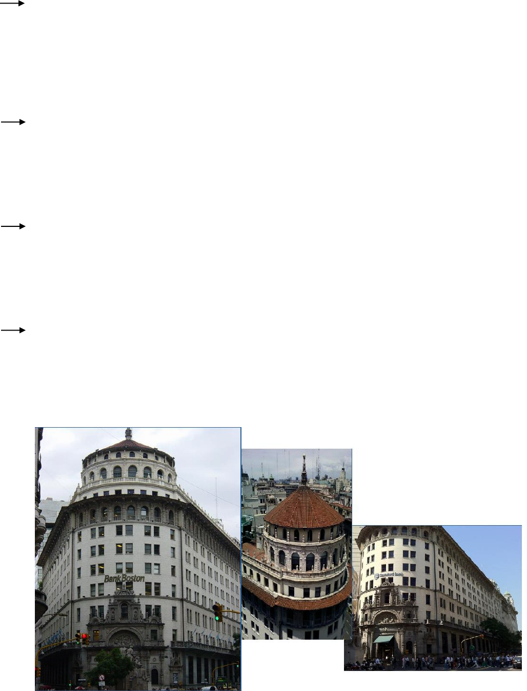 BANCO DE BOSTON – Chambers y Thomas (1924) (Colonial hispano) Aspectos contextuales y funcionales: El Edificio First National Bank of Boston (conocido popularmente como Banco de Boston) es un edificio de oficinas de estilo neoplateresco construido para dicha entidad financiera en 1924, en la esquina de la Avenida Roque Sáenz Peña y las calles Florida y Bartolomé Mitre, en la city financiera de la ciudad de Buenos Aires, Argentina. Actualmente es ocupado por el ICBC Argentina (ex Standard Bank Argentina), que absorbió al BankBoston en 2004. El edificio se distingue por su portería en la esquina y la arquería y balaustradas del último piso, basadas en distintas obras representativas del plateresco español. Aspectos espaciales: El edificio debió ceñirse a la normativa de fachada impuesta por la Municipalidad, con una altura de 8 metros sobre la vereda para el nivel del 1º piso, 33 metros hasta la cornisa y 36 a la parte superior del ático. Contó con 12 plantas: sub- subsuelo, subsuelo, planta baja, entrepiso (todos ocupados por el banco), y 8 pisos superiores destinados a oficinas de alquiler. Los pisos del 1º al 8º del edificio fueron destinados a oficinas de alquiler, con acceso por un vestíbulo al cual se entra por el frente a la Diagonal Norte, con una batería de 4 ascensores. En el segundo piso se instaló una peluquería. Aspectos formales: El edificio se caracteriza por su fachada neoplateresca de 115 metros de extensión, diseñada en homenaje al renacimiento español, con esculturas inspiradas en el Convento de San Marcos, en León y en la Librería de la Catedral, en Santiago. La arcada de la esquina de la calle Florida, de 17 metros de altura, está inspirada en el Hospital de Santa Cruz de Toledo, construida en el siglo XVI. En la misma ochava, remata una cúpula circular con tejas coloniales españolas de color rojo ladrillo. Aspectos tecnológicos: El pórtico de la ochava fue hecho en 400 toneladas de piedra calcárea se tallaron en New York en cuatro meses. Hasta el primer piso se trabajó la decoración del frente en granito de Cosquín, Córdoba, y el resto del mismo fue hecho en revoque piedra artificial blanco compuesto por piedra Mar del Plata molida y cemento portland blanco. Se colocó un sistema de iluminación exterior decorativa para realzar la fachada en días festivos. Se instaló un sistema de ventilación mecánica que permitía circular aire fresco en todo el edificio, que además recibía calefacción en invierno. PABELLON ARGENTINO DE LA EXPOSICION DE SEVILLA – Martin San Noel (1929) (Eclecticismo neocolonial) Aspectos contextuales: El Pabellón de Argentina para la Exposición Iberoamericana de Sevilla de 1929 se levanta en el Paseo de las Delicias, en los jardines de Arjona, frente a la glorieta de Buenos Aires. Un singular edificio de estilo neobarroco que incluye numerosos elementos decorativos iberoamericanos y mestizos, propios del estilo colonial. Aspectos funcionales: Una vez finalizada la Exposición, en el año 1935 el pabellón pasó a manos del Estado español y fue destinado a distintos usos, como dependencias de la Organización Femenina durante el régimen de Franco. Años más tarde, en 1949, pasa a ser de uso docente como Instituto femenino para la ciudad, con el nombre de Instituto Murillo, sufriendo en estos años sucesivas transformaciones en su composición original. Desde 1994, y tras una nueva actuación en él, el edificio es la sede del Conservatorio Profesional de Danza ‘Antonio Ruiz Soler’. Aspectos espaciales: En esta obra, Noel intenta mantener la distribución de la casona sudamericana con su característico patio central. En el centro del pabellón se ubica la casona, a la derecha se levanta un cuerpo de planta cuadrada que se cubre con una cúpula octogonal, en el que se alojaba la exposición industrial. Y a la izquierda otro cuerpo que, utilizando las tendencias neobarrocos propias de la Pampa, integraba un anfiteatro con capacidad para 200 personas, previsto para conferencias y exposiciones sobre Argentina. En la zona posterior se ubica la torre y una portada que reproduce un modelo de la ciudad peruana de Arequipa. Aspectos formales: Diseñado voluntariamente con una total carencia de simetría, el edificio distribuye libremente distintos volúmenes, rodeados de jardines, que se reparten alrededor de un cuerpo central de dos pisos con patio, con dos alas laterales adosadas como capillas barrocas añadidas, y un torreón posterior de cinco pisos de altura. Esta libre expresión volumétrica del edificio la relaciona su autor con los modelos de la arquitectura mudéjar, romántica y americanas, algo común en la arquitectura ecléctica e historicista que se prodigaba en las primeras décadas del siglo XX. El cuerpo central del edificio presenta una portada muy elaborada a modo de un gran retablo barroco en dos pisos, que va englobando los distintos huecos de la fachada. Evoca a las grandes mansiones sudamericanas, incluyendo en su planta superior una biblioteca. Aspectos tecnológicos: Todo el edificio se construye siguiendo un sistema tradicional, y entre sus elementos destaca el uso de la madera en artesonados y columnas, y la azulejería empleada tanto en paños decorativos, como en pavimentos o cúpulas. CASA FRIAS-HELGUERA – Jose Graña (1924) (Neocolonial hispánico) Aspectos contextuales: Ubicada en el centro de la ciudad, al frente de la plaza Independencia, esta antigua vivienda alguna vez perteneció al gobernador de Tucumán, el empresario Federico Helguera Garmendia, hijo del teniente coronel Gerónimo de Helguera y Crisanta Garmendia. Construida durante la segunda mitad del siglo XIX, su arquitectura corresponde a la escuela italianizante, acorde al estilo en boga de la época. Nacida de la iniciativa de Ricardo Frías Silva -yerno de Federico Helguera, casado con su hija María Elvira-, quien atraído por la casa de estilo arequipeño ideada por el arquitecto Estanislao Pirovano para 
