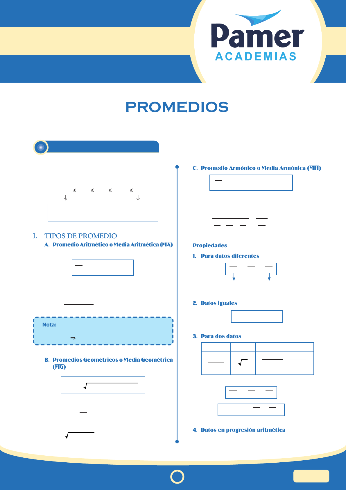 4SAN MARCOS ARITMÉTICA TEMA 2 ARITMÉTICA TEMA 2 PROMEDIOS DESARROLLO DEL TEMA Es una cantidad representativa de un conjunto de valores (medidas de tendencia central). De los valores, se tiene: a1 ≤ a2 ≤ a3 ≤ …… ≤ an ↓ ↓ MENOR ≤ PROMEDIO ≤ MAYOR VALOR VALOR I. TIPOS DE PROMEDIO A. Promedio Aritmético o Media Aritmética (MA) o simplemente promedio MA = Suma de datosNúmero de datos • Dar la MA de: 7; 13 y 4 Resolución 7 + 13 + 43 = 8 Nota: Sea “n” números y “S” suma de los números ⇒ S = n . MA (“n” números) B. Promedios Geométricos o Media Geométrica (MG) MG = Producto de los datos n n: número de datos • Dar la MG de: 5; 15 y 45 Resolución 5 . 15 . 45 3 = 15 C. Promedio Armónico o Media Armónica (MH) MA = Número de datosSuma inversa de datos • Dar la MH de: 2; 6 y 12 Resolución 1 2 1 6 1 12 + 3 + = 9 12 3 = 4 Propiedades 1. Para datos diferentes MH < MG < MA menor promedio mayor promedio 2. Datos iguales MH = MG = MA 3. Para dos datos MA MG MH a + b 2 ab 1 a 1 b + 2 = 2ab a + b Se cumple: MG2 = MA × MH (a – b)2 = 4(MA2 – MG2) 4. Datos en progresión aritmética a1, a2, a3, ..., an PROMEDIOS 55SAN MARCOS ARITMÉTICA TEMA 2 el promedio de todos los términos: MA = a1 + an 2 5. La alteración de la media aritmética Sean los números: 3, 5 y 10 MA = 3 + 5 + 103 = 6 Si aumentamos 7 unidades al 5 y disminuimos 4 al 10: Pfinal = 3 + (5 + 7) + (10 – 4) 3 Pfinal = 3 + 5 + 10 3 + 7 – 4 3 Pfinal = Pinicial + Variación Variación = (Aumenta) – (Disminuye) Total datos D. Promedio ponderado (PP) (Promedio de Promedios) • Al dar 3 exámenes, obtengo 11, 17 y 13; siendo los pesos de cada examen 2, 1 y 3. ¿Cuál será mi nota promedio? Resolución: NOTAS PESOS TOTAL 11 2 11 × 2 17 1 17 × 1 13 3 13 × 3 6 78 ++ La nota promedio será: 11.2 + 17.1 + 13.3 2 + 1 + 3 = 78 6 = 13 En general: PP = a1P1 + a2P2 + a3P3 + ... + anPn P1 + P2 + P3 + ... + Pn Donde: an: enésimo de las notas, precios, … etc. Pn: enésimo de los promedios, peso frecuencias, créditos, ...., etc. Problema 1 El promedio de 6 números es x, si se retira el mayor, el promedio se reduce en 4 unidades. Halle la diferencia entre x y el número mayor retirado. A) –24 B) 24 C) 20 D) –20 E) 30 UNMSM 2001 NIVEL FÁCIL Resolución: MA(6N°) = x ∑6N° 6 = x ∑ 6N° = 6x ∑ 5N° + Mayor = 6x ∑ 5N° = 6x – Mayor .............(1) Donde: MA(5N°) = x – 4 ∑5N° 5 = x – 4 6x – Mayor 5 = x – 4 6x – Mayor = 5x – 20 Mayor – x = 20 Respuesta: 20 Problema 2 Juan viaja de A a B y, recíprocamente de B a A con velocidades medias de 30 y 60 millas por hora; respectivamente. La velocidad media en el viaje completo es: A) 40m/h B) 50m/h C) 45m/h D) 35m/h E) 30m/h UNMSM 2004-I NIVEL INTERMEDIO Resolución: Como aplicación de la media armónica tenemos el cálculo de la rapidez media Vpromedio = MH (Velocidades) Vpromedio = 2 × 30 × 60 30 + 60 Vpromedio = 40 Respuesta: 40m/h Problema 3 La media aritmética de 30 números es 20. Si agregamos 20 números cuya suma es 600, halle la media aritmética de los 50 números. A) 30 B) 10 C) 20 D) 24 E) 60 UNMSM 2013-I NIVEL FÁCIL Resolución: ∑50N° = ∑30N° + ∑20N° ∑50N° = 30 × 20 + 600w Donde: MA(50N°) ⇒ ∑50N° 50 ⇒ 1200 50 = 24 Respuesta: 24 PROBLEMAS RESUELTOS