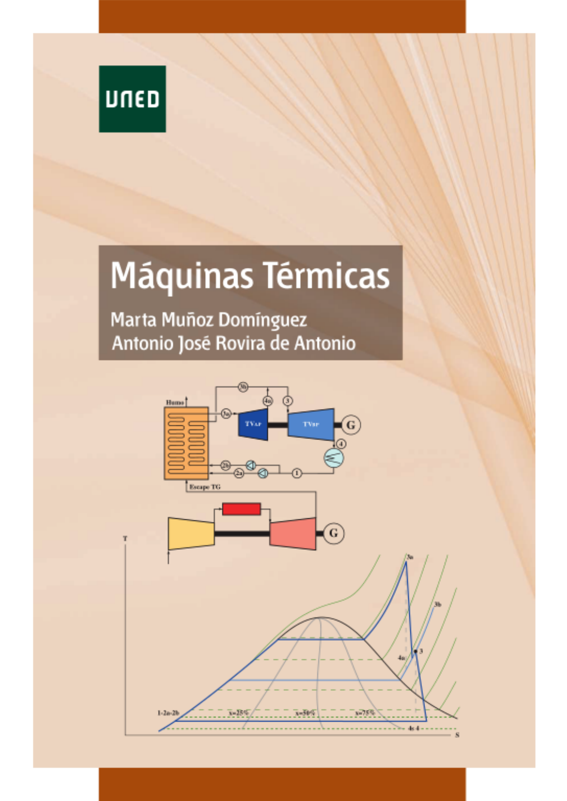 DESCARGA LO MEJOR Y APRENDE AVISO Aclaramos que el material compartido ha sido recolectado exclusivamente de internet de sitios públicos por lo que es considerado libre de distribución En ningún articulo legal se menciona la prohibición de material libre por lo que este usuario no infringe en ningún caso de ley. FEF En Free Ebook Full dispones de las mejores obras literarias con variedad de temas, desde lo científico hasta lo útil para la casa. CLICK AQUI RPF En ReProFull tendrás lo mejor en revistas y programas. El contenido se encuentra en español e ingles. Para todos los gustos. CLICK AQUI FEB En Full Engineering Book encontrarás lo mejor en temas totalmente variados: idiomas matemáticas, biología, ingenierías, y mucho más. CLICK AQUI TIPS | NOTICAS | TECNOLOGIA | Y MAS ENCUENTRAS EN: ADICTEC.COM http://www.fullengineeringbook.net http://reprofull.blogspot.com http://free-ebookfull.blogspot.com http://www.adictec.com http://www.adictec.com Máquinas Térmicas MARTA MUÑOZ DOMÍNGUEZ ANTONIO JOSÉ ROVIRA DE ANTONIO UNIVERSIDAD NACIONAL DE EDUCACIÓN A DISTANCIA MÁQUINAS TÉRMICAS Quedan rigurosamente prohibidas, sin la autorización escrita de los titulares del Copyright, bajo las sanciones establecidas en las leyes, la reproducción total o parcial de esta obra por cualquier medio o procedimiento, comprendidos la reprografía y el tratamiento informático, y la distribución de ejemplares de ella mediante alquiler o préstamos públicos. © Universidad Nacional de Educación a Distancia Madrid 201 © Marta Muñoz Domínguez y Antonio José Rovira de Antonio Todas nuestras publicaciones han sido sometidas a un sistema de evaluación antes de ser editadas. ISBN : 978-84-362- dición : ÍNDICE PREFACIO .......................................................................................................................................................................... 19 BLOQUE TEMÁTICO I GENERALIDADES CAPÍTULO 1. MÁQUINAS Y MOTORES TÉRMICOS. GENERALIDADES ........ 27 Objetivos fundamentales del capítulo .................................................................................... 27 1.1. Introducción ................................................................................................................................................ 27 1.2. Concepto de máquina térmica .............................................................................................. 28 1.2.1. Clasificación de las máquinas de fluido............................................... 28 1.2.2. Distinción entre máquina hidráulica y máquina térmica . 30 1.2.3. Clasificación de las máquinas térmicas ................................................ 31 1.3. Motores térmicos de combustión interna y de combustión ex- externa. Distinción entre máquina térmica y motor térmico .......... 33 1.4. Rendimiento de los motores térmicos ........................................................................ 39 1.4.1. Rendimiento del ciclo y rendimiento de la instalación ..... 39 1.4.2. Rendimiento exergético ............................................................................................ 40 1.5. Cogeneración ............................................................................................................................................. 41 1.6. Campos de aplicación de los motores térmicos ............................................. 43 CAPÍTULO 2. PROCESOS EN FLUÍDOS COMPRENSIBLES ............................................ 53 Objetivos fundamentales del capítulo .................................................................................... 55 2.1. Introducción ................................................................................................................................................ 55 2.2. Procesos termodinámicos de importancia en el estudio de las máquinas y los motores térmicos ..................................................................................... 57 2.3. Principios y ecuaciones que rigen el comportamiento de los flujos compresibles ............................................................................................................................ 60 2.3.1. Principio de conservación de la masa ..................................................... 61 2.3.2. Primer Principio de la termodinámica .................................................... 61 7 8 MÁQUINAS TÉRMICAS 2.3.3. Ecuación de conservación de la cantidad de movi- miento ............................................................................................................................................. 64 2.3.4. Segundo Principio de la termodinámica .............................................. 64 2.3.5. Exergía y balance energético ............................................................................. 66 2.3.6. Ecuaciones de Gibbs..................................................................................................... 68 2.3.7. Ecuaciones calóricas ..................................................................................................... 69 2.3.8. Trabajo intercambiado con el entorno .................................................... 71 2.4. Propiedades termodinámicas de mezclas de gases ideales ............... 76 2.5. El Factor de Carnot. Rendimiento máximo de los motores tér- micos.................................................................................................................................................................... 78 2.6. Concepto de velocidad del sonido y número de mach .......................... 81 2.6.1. Velocidad del sonido.................................................................................................... 81 2.6.2. Concepto de número de Mach.......................................................................... 84 2.6.3. Concepto de onda de choque .................................................................