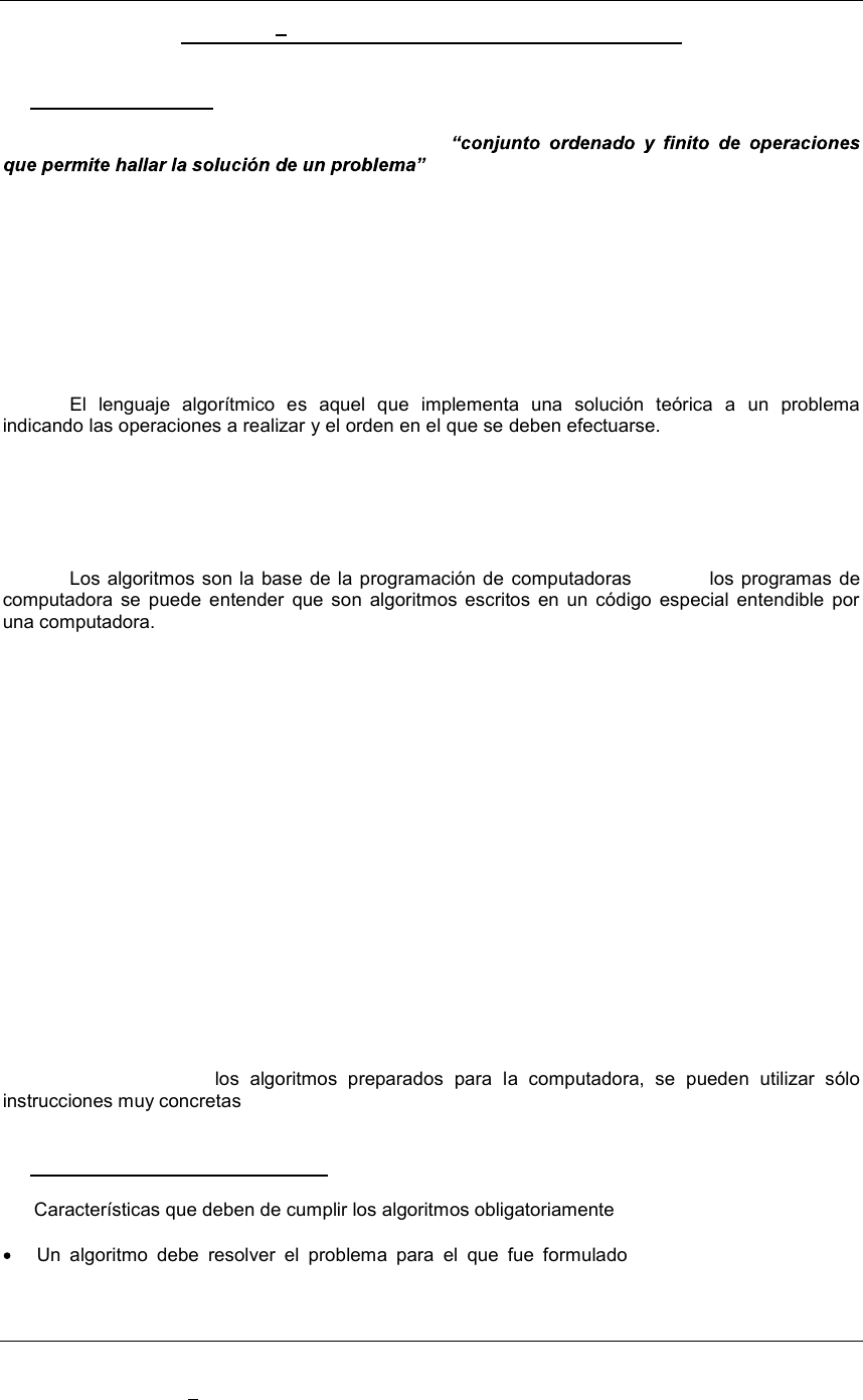 DESARROLLO SISTEMÁTICO DE PROGRAMAS Apuntes de cátedra Página 1 Facultad de Ingeniería U.N.Ju. Ing. Carlos Alberto Afranllie UNIDAD 1 ALGORITMOS: INTRODUCCIÓN Y REPASO 1 - Noción de algoritmo Según la RAE (Real Academia Española): Otra definicióin: "Un algoritmo es un conjunto de pasos claramente definidos que a partir de una cierta entrada (input) produce una determinada salida (output)". Los algoritmos, como indica su definición oficial, son una serie de pasos que permiten obtener la solución a un problema. La palabra algoritmo procede del matemático Árabe Mohamed Ibn Al Juarismi, el cual escribió sobre los años 800 y 825 su obra Quitad Al Mugabala, donde se recogía el sistema de numeración hindú y el concepto del cero.Fibonacci, tradujo la obra al latín y la llamó: Algoritmi Dicit. El lenguaje algorítmico es aquel que implementa una solución teórica a un problema indicando las operaciones a realizar y el orden en el que se deben efectuarse. Por ejemplo en el caso de que nos encontremos en casa con un foco quemado en una lámpara, un posible algoritmo sería: (1) Comprobar si hay focos de repuesto (2) En el caso de que las haya, sustituir el foco quemado anterior por el nuevo (3) Si no hay focos de repuesto, comprar en un negocio y sustituir el foco quemado por el nuevo. Los algoritmos son la base de la programación de computadoras, ya que los programas de computadora se puede entender que son algoritmos escritos en un código especial entendible por una computadora. Lo malo del diseño de algoritmos está en que no podemos escribir lo que deseemos, el lenguaje a utilizar no debe dejar posibilidad de duda, debe recoger todas las posibilidades. Por lo que los tres pasos anteriores pueden ser mucho más largos: [1] Comprobar si hay focos de repuesto (1.1) Abrir el cajón de los focos (1.2) Observar si hay focos [2] Si hay focos: (2.1) Tomar el foco (2.2) Agarrar una silla (2.3) Subirse a la silla (2.4) Sacar el foco quemado (2.5) Poner el foco nuevo en la lámpara [3] Si no hay focos (3.1) Abrir la puerta (3.2) Ir al negocio.... Cómo se observa en un algoritmo las instrucciones pueden ser más largas de lo que parecen, por lo que hay que determinar qué instrucciones se pueden utilizar y qué instrucciones no se pueden utilizar. En el caso de los algoritmos preparados para la computadora, se pueden utilizar sólo instrucciones muy concretas. 2 - Características de los algoritmos 2.1 Características que deben de cumplir los algoritmos obligatoriamente Un algoritmo debe resolver el problema para el que fue formulado: Lógicamente no sirve un algoritmo que no resuelve ese problema. En el caso de los programadores, a veces crean algoritmos que resuelven problemas diferentes al planteado. Florencia Resaltado Florencia Resaltado Florencia Resaltado Florencia Resaltado Florencia Resaltado Florencia Resaltado DESARROLLO SISTEMÁTICO DE PROGRAMAS Apuntes de cátedra Página 2 Facultad de Ingeniería U.N.Ju. Ing. Carlos Alberto Afranllie Los algoritmos son independientes de la computadora: Los algoritmos se escriben para poder ser utilizados en cualquier máquina. Los algoritmos deben de ser precisos: Los resultados de los cálculos deben de ser exactos, de manera rigurosa. No es válido un algoritmo que sólo aproxime la solución. Los algoritmos deben de ser finitos: Deben de finalizar en algún momento. No es un algoritmo válido aquel que produce situaciones en las que el algoritmo no termina. Los algoritmos deben de poder repetirse: Deben de permitir su ejecución las veces que haga falta. No son válidos los que tras ejecutarse una vez, ya no pueden volver a hacerlo por la razón que sea. 2.2 Características aconsejables para los algoritmos Validez: Un algoritmo es válido si carece de errores. Un algoritmo puede resolver el problema para el que se planteó y sin embargo no ser válido debido a que posee errores Eficiencia: Un algoritmo es eficiente si obtiene la solución al problema en poco tiempo. No lo es si es lento en obtener el resultado. Óptimo: Un algoritmo es óptimo si es el más eficiente posible y no contiene errores. La búsqueda de este algoritmo es el objetivo prioritario del programador. No siempre podemos garantizar que el algoritmo hallado es el óptimo, a veces sí. 3 Elementos que conforman un algoritmo Entrada: Los datos iniciales que posee el algoritmo antes de ejecutarse. Proceso: Acciones que lleva a cabo el algoritmo. Salida: Datos que obtiene finalmente el algoritmo. 4 Fases en la creación de algoritmos Hay tres fases en la elaboración de un algoritmo: 1. Análisis: En esta se determina cuál es exactamente el problema a resolver. Qué datos forman la entrada del algoritmo y cuáles deberán obtenerse como salida. 2. Diseño: Elaboración del algoritmo 3. Prueba: Comprobación del resultado. Se observa si el algoritmo obtiene la salida esperada para todas las entradas. 5 Validación de un algoritmo Un algoritmo es correcto si el resultado que produce siempre resuelve un determinado problema a partir de una entrada válida. Demostrar ya sea en forma rigurosa o intuitiva que un algoritmo es correcto es el primer paso indispensable en el análisis de un algoritmo. A esta fase del análisis de algoritmos se la conoce como validación del algoritmo. Los algoritmos que no son correctos a veces pueden ser útiles si, por ejemplo, producen una respuesta aproximada a un Florencia Resaltado Florencia Resaltado Florencia Resaltado Florencia Resaltado Florencia Resaltado Florencia Resaltado Florencia Resaltado Florencia Resaltado Florencia Resaltado Florencia Resaltado Florencia Resaltado Florencia Resaltado Florencia Resaltado Florencia Resaltado Florencia Resaltado Florencia Resaltado Florencia Resaltado Florencia Resaltado Florencia Resaltado Florencia Resaltado Florencia Resaltado Florencia Resaltado Florencia Resaltado Florencia Resaltado Florencia Resaltado Florencia Resaltado Florencia Resaltado Florencia Resaltado Florencia Resaltado Flor