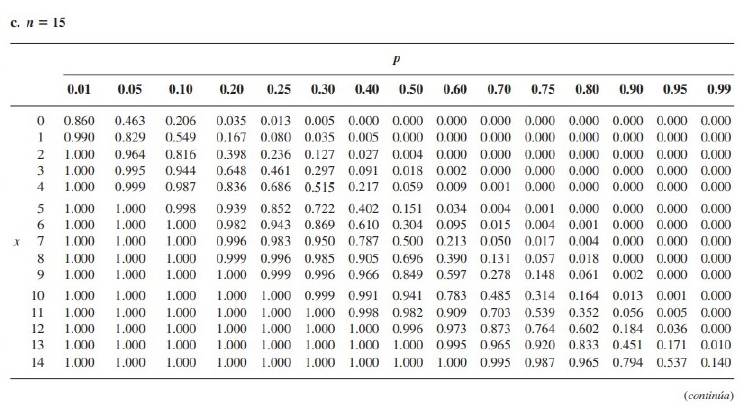 Sección 3.4. 47. Use la tabla A.1 del apéndice para obtener las siguientes probabilidades: a) B(4; 15, 0,3) b) b(4; 15, 0,3) c) b(6; 15, 0,7) d) P (2 ≤ X ≤ 4) cuando X Bin(15, 0,3) e) P (2 ≤ X) cuando X Bin(15, 0.3) f) P (X ≤ 1) cuando X Bin(15, 0.7) g) P (3 ≤ X ≤ 5) cuando X Bin(15, 0.3) Solución a) B(4; 15, 0,3) Vemos en la tabla para n=15 de las distribuciones binomiales acumulativas en la columna de probabilidad de 0,30 y fila de x = 4 que el valor es de 0.515. b) b(4; 15, 0,3) b(4; 15, 0.3) = B(4; 15, 0.3)−B(3; 15, 0.3) = 0.515− 0.297 = 0.218 c) b(6; 15, 0,7) b(6; 15, 0.7) = B(6; 15, 0.7)−B(5; 15, 0.7) = 0.015− 0.004 = 0.011 d) P (2 ≤ X ≤ 4) cuando X Bin(15, 0.3) B(4; 15, 0.3)−B(1; 15, 0.3) = 0.480 e) P (2 ≤ X) cuando X Bin(15, 0.3) 1−B(1; 15, 0.3) = 0.965 f) P (X ≤ 1) cuando X Bin(15, 0.7) B(1; 15, 0.7) = 0 g) P (3 ≤ X ≤ 5) cuando X Bin(15, 0.3) B(5; 15, 0.3)−B(2; 15, 0.3) = 0.722− 0.127 = 0.595