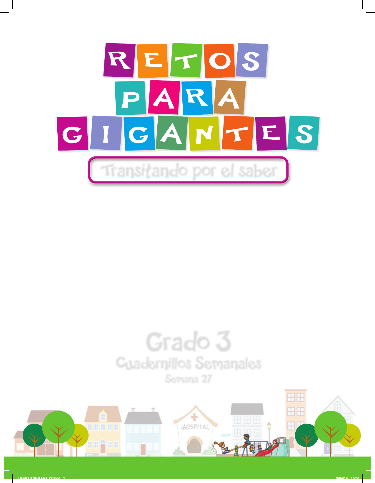 Grado 3 Cuadernillos Semanales Semana 27 Transitando por el saber LIBRO 3 SEMANA 27.indd 1 2/04/14 15:01 María Fernanda Campo Saavedra Ministra de Educación Nacional Julio Salvador Alandete Arroyo Viceministro de Educación Básica y Media Mónica Patricia Figueroa Dorado Directora de Calidad para la Educación Preescolar, Básica y Media Ana Isabel Pino Sánchez Subdirectora de Referentes y Evaluación de la Calidad Educativa Clara Helena Agudelo Quintero Coordinadora del Proyecto Deyanira Alfonso Sanabria Clara Helena Agudelo Quintero María Fernanda Dueñas Álvarez María del Sol Effio Jaimes Omar Alejandro Hernández Salgado Maritza Mosquera Escudero Rodrigo Nieto Galvis Cielo Erika Ospina C. Carlos Eduardo Panqueva Urrego Diego Fernando Pulecio Herrera Hernando Alfonso Rengifo Moreno Manuel Alejandro Solano Díaz Marta Cecilia Torrado Pacheco Equipo técnico © 2014 Ministerio de Educación Nacional Todos los derechos reservados Prohibida la reproducción total o parcial, el registro o la transmisión por cualquier medio de recuperación de información, sin permiso previo del Ministerio de Educación Nacional. © Ministerio de Educación Nacional ISBN libro: 978-958-691-593-9 ISBN obra: 978-958-691-569-4 Dirección de Calidad para la Educación Preescolar, Básica y Media Subdirección de Estándares y Evaluación Ministerio de Educación Nacional Bogotá, Colombia, 2014 www.mineducación.gov.co ALBERTO MERANI Fundación Internacional de edagogíaP Conceptual Libertad y Orden Juan Sebastián De Zubiría Ragó Director General Olga Patricia Parra Sarmiento Directora de Unidad Alejandro Baquero Susa Director de Proyectos Sandra Patricia Algarra Re Directora del Proyecto Leonardo Neisa Vanegas Matemáticas Claudia García Parra Ciencias Sociales Luis Ayala Villamil Ciencias Naturales Sonia Ríos Ángel Educación Artística Javier Hernández Segura Tecnología Johnatan Gómez Castro Educación Religiosa Mauricio Gómez Pedraza Mis emociones Autores María Soledad Ferro Casas Carlos Penagos Aley Nubia Arias Benavides Editores Karoline Roa Ruiz Asesora Especialista * Psicóloga Sonia Lidia Rubio Mendoza Diseño Adriana P. Páez Naranjo - Denise Rodríguez Ríos Diagramación Juan Carlos Ricardo Páez - Germán Uriel Gutiérrez Castrillón Nelson Darío Martínez Ilustración Fernando Chaparro Bermúdez Digitalización de imágenes y fotografía LIBRO 3 SEMANA 27.indd 2 2/04/14 15:01 Palabras de la ministra PRESENTACIÓN Garantizar a los niños, niñas y jóvenes de Colombia una educación de calidad es la bandera que nos mueve día a día en el Ministerio de Educación Nacional, para que todos y todas tengan oportunidades de acceso y permanencia, con equidad, en el sistema escolar. En esta oportunidad nos complace entregar al país un nuevo Modelo Educativo Flexible llamado Retos para gigantes: Transitando por el saber, el cual atenderá a los niños y niñas de básica primaria de toda nuestra geografía colombiana que se encuentren en condición de enfermedad, recibiendo tratamientos médicos u hospitalizados, razón por la cual deben interrumpir su proceso educativo. Para el Estado es de vital importancia no solo garantizar el acceso a la educación, sino también favorecer la permanencia en el sistema educativo. Casos tan especiales, como los de los estudiantes que se encuentran en situación de vulnerabilidad, deben tener las condiciones necesarias y las estrategias pedagógicas pertinentes para que puedan continuar y concluir sus estudios de manera adecuada. Y eso es lo que el sistema les ofrece el día de hoy a través de este Modelo Educativo Flexible. Retos para gigantes: Transitando por el saber es un Modelo Educativo Flexible que busca garantizar la consecución de los procesos de enseñanza y aprendizaje que se desarrollan en la Escuela, y favorece la construcción de bases sólidas en el desarrollo integral de los estudiantes y en el fomento de su autoestima, tan necesarias para alcanzar sus sueños y para afrontar los diversos retos de la vida. Por eso, el modelo enfatiza principalmente en la construcción personal e involucra a la familia como base fundamental del acompañamiento. Sean bienvenidos a esta experiencia educativa, que plantea nuevos escenarios de formación, donde las brechas se cierran y af loran los procesos de equidad y de calidad educativa que tanto requiere Colombia. María Fernanda Campo Saavedra Ministra de Educación Nacional LIBRO 3 SEMANA 1.indd 3 2/04/14 18:45 LIBRO 3 SEMANA 27.indd 4 2/04/14 15:01 Evaluación ...................................................................................................................................................................................................................................32 Informe semanal .................................................................................................................................................................................................................38 EMOCIONES MIS LENGUAJE EDUCACIÓN RELIGIOSA MATEMÁTICAS EDUCACIÓN ARTÍSTICA CIENCIAS SOCIALES Contenido CIENCIAS NATURALES TECNOLOGÍA ● Tema 1. Palabras tan parecidas, pero tan diferentes ........................................................ 6 ● Tema 2. ¿De dónde salen las historias de las películas y de las obras de teatro ............................................................................................................. 8 ● Tema 3. Gran espectáculo de música y teatro ..................................................................... 10 ● Tema 1. Cilindros y conos ............................................................................................................................. 12 ● Tema 2. Prismas y pirámides ..................................................................................................................... 14 ● Tema 3. Secuencias multiplicativas ..............................................................................