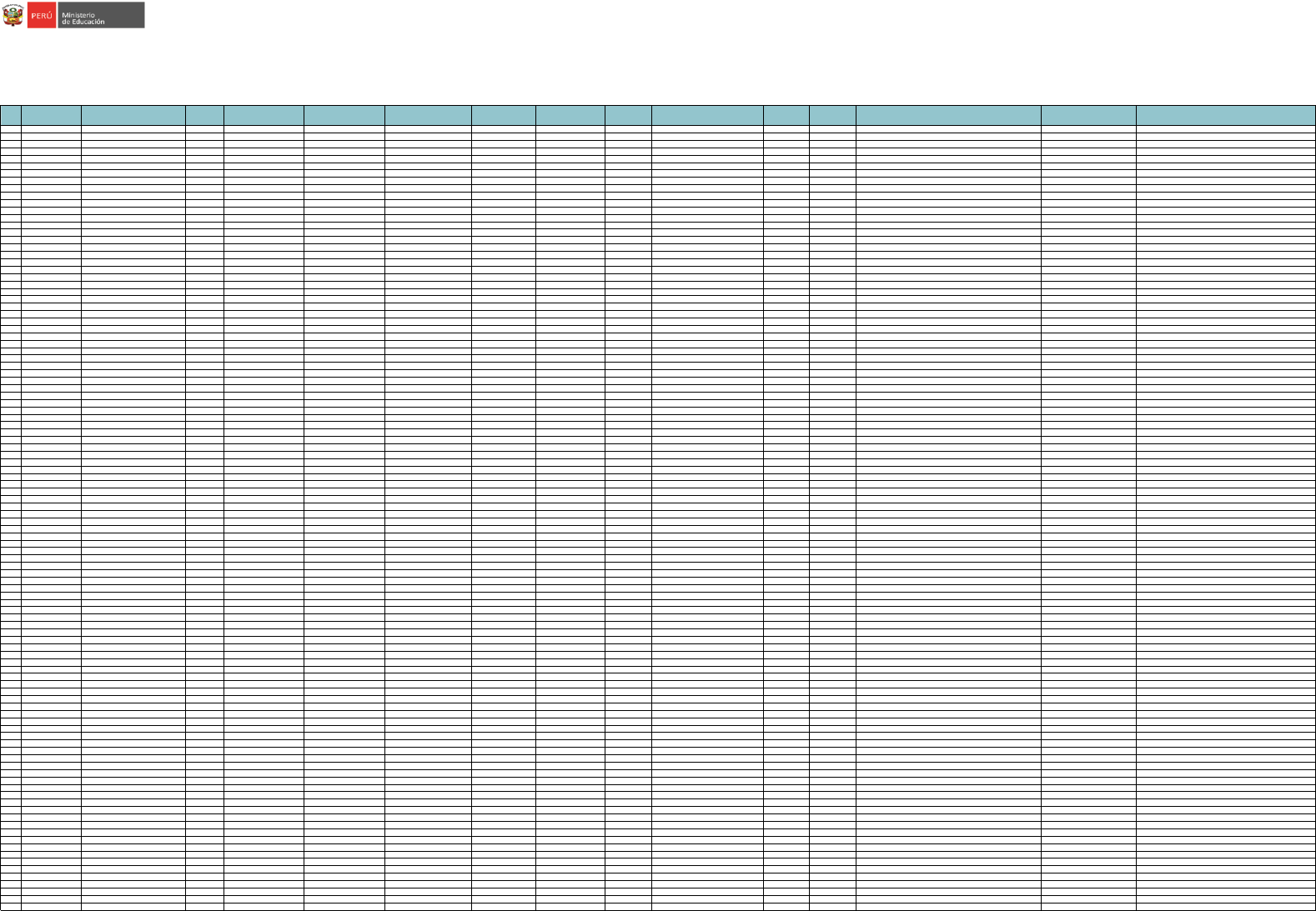 N° REGIÓN DRE/UGEL DNI APELLIDO PATERNO APELLIDO MATERNO NOMBRES CARGO CÓDIGO DE PLAZA MODALIDAD NIVEL EDUCATIVO/CICLO CÓDIGO LOCAL CÓDIGO MODULAR NOMBRE DE LA I.E. CARACTERÍSTICA DE LA I.E. OBSERVACIÓN 1 APURÍMAC UGEL ABANCAY 09459485 VERA YPENZA MARIA ARMIDA DIRECTOR I.E. 03EV01631163 EBR Secundaria 300206 1316579 QUISAPATA POLIDOCENTE COMPLETA 2 APURÍMAC UGEL ABANCAY 10146409 ACOSTA VERA MIRIAN MARGOT DIRECTOR I.E. 03EV01635068 EBR Inicial 653873 1580810 1090 SEÑOR DE HUANCA POLIDOCENTE COMPLETA 3 APURÍMAC UGEL ABANCAY 23854950 MORVELY MEDINA NATALIA DIRECTOR I.E. 03EV01635054 EBR Inicial 042284 0753939 213 POLIDOCENTE COMPLETA 4 APURÍMAC UGEL ABANCAY 23871622 CARDENAS CATALAN ELSA SUB-DIRECTOR I.E. 820261218916 EBR Secundaria 042383 0233064 MIGUEL GRAU POLIDOCENTE COMPLETA 5 APURÍMAC UGEL ABANCAY 23997032 GUERRERO PEREZ JAVIER DIRECTOR I.E. 03EV01631164 EBR Secundaria 833469 1379734 54027 DANIEL DEL PINO MUÑOZ POLIDOCENTE COMPLETA 6 APURÍMAC UGEL ABANCAY 25326525 VELARDE CHACON CARLOS DIRECTOR I.E. 822281216910 EBR Secundaria 537906 1376680 CCOLLPA POLIDOCENTE COMPLETA 7 APURÍMAC UGEL ABANCAY 25751808 SALAS TRUJILLO GABRIELA DIRECTOR I.E. 03EV01631171 EBR Secundaria 745458 1379767 CAYPE POLIDOCENTE COMPLETA 8 APURÍMAC UGEL ABANCAY 25786320 FUENTES VALDIVIA KIKO ELVIN DIRECTOR I.E. 03EV01631165 EBR Secundaria 043071 0930388 OCOBAMBA POLIDOCENTE COMPLETA 9 APURÍMAC UGEL ABANCAY 31001905 MATTOS AYQUIPA NELLY DIRECTOR I.E. 820251211917 EBR Primaria 042415 0285569 54008 DIVINO MAESTRO POLIDOCENTE COMPLETA 10 APURÍMAC UGEL ABANCAY 31006647 MIRANDA TAMAYO YEDA MARILYN DIRECTOR I.E. 820241216911 EBR Inicial 042076 0908517 CUNA - 01 POLIDOCENTE COMPLETA 11 APURÍMAC UGEL ABANCAY 31007575 GAMBOA FLORES MIRIAM DIRECTOR I.E. 03EV01635059 EBR Inicial 042316 0908335 220 HUELLITAS DE SANTA ROSA POLIDOCENTE COMPLETA 12 APURÍMAC UGEL ABANCAY 31008454 CHUMPISUCA PEREZ EULOGIO DIRECTOR I.E. 822271219914 EBR Secundaria 054385 0576082 AGUSTIN GAMARRA POLIDOCENTE COMPLETA 13 APURÍMAC UGEL ABANCAY 31009174 CHIPANA YUPANQUI ALIPIO ENCARNACION DIRECTOR I.E. 822281213911 EBR Secundaria 044080 0535815 GUILLERMO VILADEGUT FERRUFINO POLIDOCENTE COMPLETA 14 APURÍMAC UGEL ABANCAY 31009641 CABALLERO SANCHEZ VICTOR GILBERTO DIRECTOR I.E. 822271218910 EBR Secundaria 054390 0645507 TUPAC AMARU II POLIDOCENTE COMPLETA 15 APURÍMAC UGEL ABANCAY 31011923 BRAVO RAYA NILO JOSE DIRECTOR I.E. 820281212916 EBR Secundaria 042420 0671438 VILLA GLORIA POLIDOCENTE COMPLETA 16 APURÍMAC UGEL ABANCAY 31019527 LIGARDA MEDINA PORFIRIO DIRECTOR I.E. 820261216917 EBR Primaria 043491 0724989 54682 JOSE MARIA ARGUEDAS POLIDOCENTE COMPLETA 17 APURÍMAC UGEL ABANCAY 31024508 ESPINOZA SANCHEZ MARY LUZ DIRECTOR I.E. 03EV01635058 EBR Inicial 042302 0767012 218 MICAELA B ASTIDAS POLIDOCENTE COMPLETA 18 APURÍMAC UGEL ABANCAY 31032978 RIVEROS DAVALOS FLORA FHEDRA DIRECTOR I.E. 03EV01635070 EBR Inicial 654066 1581008 1109 POLIDOCENTE COMPLETA 19 APURÍMAC UGEL ABANCAY 31033102 MONTALVO GUEVARA EDITH SUB-DIRECTOR I.E. 03EV01631161 EBR Secundaria 042646 0667394 AURORA INES TEJADA POLIDOCENTE COMPLETA 20 APURÍMAC UGEL ABANCAY 31033223 MERMA SERRANO LIVIA AMALIA DIRECTOR I.E. 03EV01631172 EBR Secundaria 044198 1379742 COTARMA POLIDOCENTE COMPLETA 21 APURÍMAC UGEL ABANCAY 31033787 VALDEIGLESIAS CISNEROS DORIS DIRECTOR I.E. 820241215915 EBR Inicial 042118 0504654 04 NUESTRA SEÑORA DE GUADALUPE POLIDOCENTE COMPLETA 22 APURÍMAC UGEL ABANCAY 31033800 ROBLES OLIVERA DELIA SUB-DIRECTOR I.E. 822281215913 EBR Primaria 042632 0861005 55001 MANUEL JESUS SIERRA A. POLIDOCENTE COMPLETA 23 APURÍMAC UGEL ABANCAY 31036855 CASTILLO ECCOÑA CARLOS OSWALDO DIRECTOR I.E. 03EV01631168 EBR Secundaria 613981 1523257 LUIS DE LA PUENTE UCEDA POLIDOCENTE COMPLETA 24 APURÍMAC UGEL ABANCAY 31037675 SEQUEIROS SALCEDO YOLANDA MARLENI SUB-DIRECTOR I.E. 820221212918 EBR Primaria 042383 0285536 54005 MIGUEL GRAU POLIDOCENTE COMPLETA 25 APURÍMAC UGEL ABANCAY 31037829 SIERRA MEJIA BENA DIRECTOR I.E. 822271215915 EBR Primaria 042528 0237719 54076 POLIDOCENTE COMPLETA 26 APURÍMAC UGEL ABANCAY 31038289 FLORES JAUREGUI EVA ROXANA SUB-DIRECTOR I.E. 03EV01631167 EBR Secundaria 043207 1433283 RAMON CASTILLA POLIDOCENTE COMPLETA 27 APURÍMAC UGEL ABANCAY 31039864 TEVES CCANRE ALEX DIRECTOR I.E. 03EV01631173 EBR Secundaria 044184 1379759 ALCIDES ACUÑA ARIAS POLIDOCENTE COMPLETA 28 APURÍMAC UGEL ABANCAY 31039881 ALEGRIA MERMA YONI DIRECTOR I.E. 820201215919 EBR Primaria 779014 0285510 54003 NUESTRA SEÑORA DEL ROSARIO POLIDOCENTE COMPLETA 29 APURÍMAC UGEL ABANCAY 31041006 ROJAS HUANCA HILDA DIRECTOR I.E. 03EV01635063 EBR Inicial 042340 0930297 225 POLIDOCENTE COMPLETA 30 APURÍMAC UGEL ABANCAY 31043838 OROSCO LOPEZ FRANCY JULIETA DIRECTOR I.E. 03EV01635053 EBR Inicial 044462 0753921 208 MICAELA BASTIDAS PUYUCAHUA POLIDOCENTE COMPLETA 31 APURÍMAC UGEL ABANCAY 31045067 LATORRE LOVON ALDO DIRECTOR I.E. 820201216914 EBR Primaria 043207 0237131 54018 RAMON CASTILLA POLIDOCENTE COMPLETA 32 APURÍMAC UGEL ABANCAY 31359205 CONDE QUINTERO MISAEL DIRECTOR I.E. 820211217910 EBR Primaria 044358 0285650 54013 VIRGEN DEL CARMEN POLIDOCENTE COMPLETA 33 APURÍMAC UGEL ABANCAY 40822016 SERRANO BUSTINZA ALEXANDER DIRECTOR I.E. 820291214919 EBR Primaria 042552 0201020 54489 NUESTRA SEÑORA DE LAS MERCEDES POLIDOCENTE COMPLETA 34 APURÍMAC UGEL ABANCAY 43971641 CCERARE PANIURA GILBERT RUBEN DIRECTOR I.E. 822201217915 EBR Primaria 042420 0285593 54009 POLIDOCENTE COMPLETA 35 APURÍMAC UGEL ABANCAY 43993504 MAMANI HUANCA EXALTACION DIRECTOR I.E. 822281215915 EBR Primaria 042868 0237545 54059 POLIDOCENTE COMPLETA 36 APURÍMAC UGEL ANDAHUAYLAS 06658928 CHAVEZ REYNAGA EDILBERTO DIRECTOR I.E. 827271216615 EBR Primaria 047818 0238022 54107 POLIDOCENTE MULTIGRADO 37 APURÍMAC UGEL ANDAHUAYLAS 07143465 LAURA LARA BERNABE JOSE DIRECTOR I.E. 828221213619 EBR Secundaria 538982 1326032 LOS CHANKAS DE QUILLABAMBA POLIDOCENTE COMPLETA 38 APURÍMAC UGEL ANDAHUAYLAS 09826954 HUAMANI GOMEZ JOHN WA