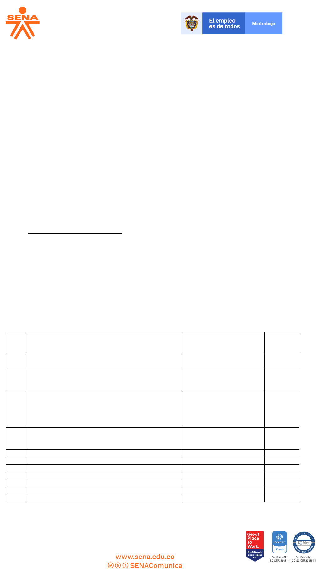 SERVICIO NACIONAL DE APRENDIZAJE Regional Nariño/Centro Internacional de producción limpia- Lope Calle 22 11E-05 Vía Oriente, San Juan de Pasto - PBX 7303324 – 7304656 GD-F-011 V.05 REGIONAL NARIÑO SOLICITUD DE PRECOTIZACIONES PARA ESTUDIO DE MERCADO Centro Internacional de Producción Limpia Lope El Centro Internacional de Producción Limpia Lope – SENA Regional Nariño, de conformidad con los principios de transparencia para la contratación, convoca públicamente a todos los interesados a participar con sus precotizaciones, como parte del estudio de mercado a registrar, del proceso que tiene por OBJETO: Adquisición de elementos y materiales de ferretería necesarios para la ejecución y manejo de los diferentes proyectos productivos agropecuarios a cargo de la Finca ubicada en el Centro Internacional de Producción Limpia Lope del SENA Regional Nariño. La solicitud de precotización o la precotización presentada, no constituye negocio jurídico alguno u obliga al Sena o al comerciante cotizante de alguna manera. Para la realización de la precotización se debe tener en cuenta todos los gastos directos e indirectos en que se pueda incurrir en la entrega de los bienes o la prestación del servicio. Es así como se debe contemplar el transporte de los bienes, impuestos y retenciones, garantías de cumplimiento y responsabilidad civil y en general cualquier otro costo en que se incurra en una eventual contratación con la Entidad Pública. Se solicita registrar sus precotizaciones al siguiente contacto: Correo: compraspasto@sena.edu.co Si usted considera, puede enviar su Precotización digitalizada por correo electrónico mediante un formato PDF, Archivo en Excel o Word, en Ningún caso se acepta archivos comprimidos. FECHA LÍMITE DE RECEPCION DE PRECOTIZACIONES: 08 de julio del 2022. Se presenta la siguiente información como referencia de consulta: 1. CONDICIONES TECNICAS REQUERIDAS: El interesado en presentar precotizaciones deberá tener presente las siguientes condiciones técnicas: ITEM DESCRIPCION CANTIDAD UNIDAD DE MEDIDA 1 Anjeo plástico color blanco por rollo, medidas 1,20 metros de ancho x 30 metros de largo. 4 Rollo 2 Malla plástica color blanca por rollo, medidas 1 metro de anho x 30 metros de largo, dimensiones de orificios 3 mm x 3mm 4 Rollo 3 Malla extruida anti pajaros color negro, material polipropileno, 4 metros de ancho x 150 metros de largo, area 600 metros cuadrados, cuadricula 16*19 mm. 2 años de garantía, debe llegar con su hoja técnica y datos de la casa fabricante 5 Rollo 4 Guadúa común uniforme, de 12 cm a 14 cm de diámetro, con espesor de pared aprox. de 2,3 cm y 6 metros de longitud. Totalmente madura y seca. 90 Unidad 5 Varilla roscada de 3/8 de pulgada x 1m 50 Unidad 6 Tuerca hexagonal para varilla 3/8" 5 Ciento 7 Arandela plana zincada 3/8" 5 Ciento 8 Discos de corte para metal 4 1/2" 70 Unidad 9 Cemento gris 5 Bulto 10 Arena gris 2 m3 11 Triturado 2 m3 mailto:compraspasto@sena.edu.co SERVICIO NACIONAL DE APRENDIZAJE Regional Nariño/Centro Internacional de producción limpia- Lope Calle 22 11E-05 Vía Oriente, San Juan de Pasto - PBX 7303324 – 7304656 GD-F-011 V.05 12 Barniz o laca para madera 3 Galón 13 Thiner fino 3 Galón 14 Teja termoacustica por 6 metros de largo, color verde o naranja 6 Unidad 15 Aspersor plastico de 3/4 10 Unidad 16 Aspersores de 1/2 plasticos de dos salidas 8 Unidad 17 Cinta teflon por caja por 20 unidades 1 Caja 18 Juego de 6 destornilladores industriales distribuídos así: 4 Planos: 3/16x 4 pulg. (5 x 100 mm), 3/16 x 6 pulg. (5 x 150 mm), 1/4 x 4 pulg. (6 x 100 mm), 1/4 x 6 pulg. (6 x 150 mm) y 2 estrella: 1 x 4 pulg. (1 x 100 mm), 2 x 4 pulg. (2 x 100 mm). Caracteristicas: Mango hexalobular (6 lados), ergonómico, mangos coordinados por color: rojo (estándar), azul (estrella), medida y tipo de punta claramente indicada en el mango, barras en acero Cromo Vanadio tratadas térmicamente, barra cromada resistente a la corrosion, punta anti-resbalante fosfatada y magnetica para mejor agarre, herramienta manual para uso profesional, garantia de por vida util 4 Juego por 6 unidades 19 Discos circulares para guadaña recto, negro, sin perforaciones, de diametro exterior 255MM (10 pulg.), diametro del agujero 25,4MM (1 pulg.), espesor 1,6MM y de 80 dientes 30 Unidad 20 Alicate industrial de 8 pulgadas en material cromo vanadio 3 Unidad 21 Grapas por kilogramo para posteadura 3 Caja 22 Guante protector de carnaza fabricado en cuero natural, pieza dorsal 3/4 en lona color azul, refuerzo en palma tipo gatillo, puño de seguridad de amplia apertura de 6 pulgadas, costuras en poliester de alta resistencia, grosor 1,2 mm y peso aproximado 199 gramos 3 Par 23 Martillo tipo uña profesional de alta calidad, con mango de fácil agarre y antideslizante, cabeza de acero y mango de fibra de vidrio. Características: Peso 8 onzas 1 Unidad 24 Martillo tipo uña profesional de alta calidad, con mango de fácil agarre y antideslizante, cabeza de acero y mango de fibra de vidrio. Características: Peso 24 onzas 6 Unidad 25 Lamina de aluminio calibre 40, de 1 metro de ancho por 3 metros de largo para elaboracion de aretes cuyes. 1 Rollo 26 Limpiador PVC 12 onzas 1 Unidad 27 Segueta tipo industrial de 12 pulgadas, Ancho de la hoja 0.2 cm, Ancho 3.7 cm, Largo 33.5 cm. Tipo de sierra en Serrucho, mango cerrado ergonómico para mayor comodidad, mejor control y agarre, arco fijo resistente de acero, empuñadura cerrara para tensión máxima 104 lbs (47 kg). 7 Unidad 28 Hoja de segueta tipo industrial bimetalica de 12 pulgadas 11 Unidad 29 Tijera pequeña de 8 pulgadas para cortar lamina, de 205 mm de largo, diseño de alta palanca para cortar metal, aluminio, mango bi-metal para mayor comodidad 4 Unidad 30 Carretilla super buggy de tolva plástica grande (profunda) de 120 litros y de dimensiones largo 99 cm, ancho 74 cm y alto 45 cm, rin metálico, doble llanta antipinchazo de 16 pulgadas 3 Unidad 31 Guantes de caucho de uso industria