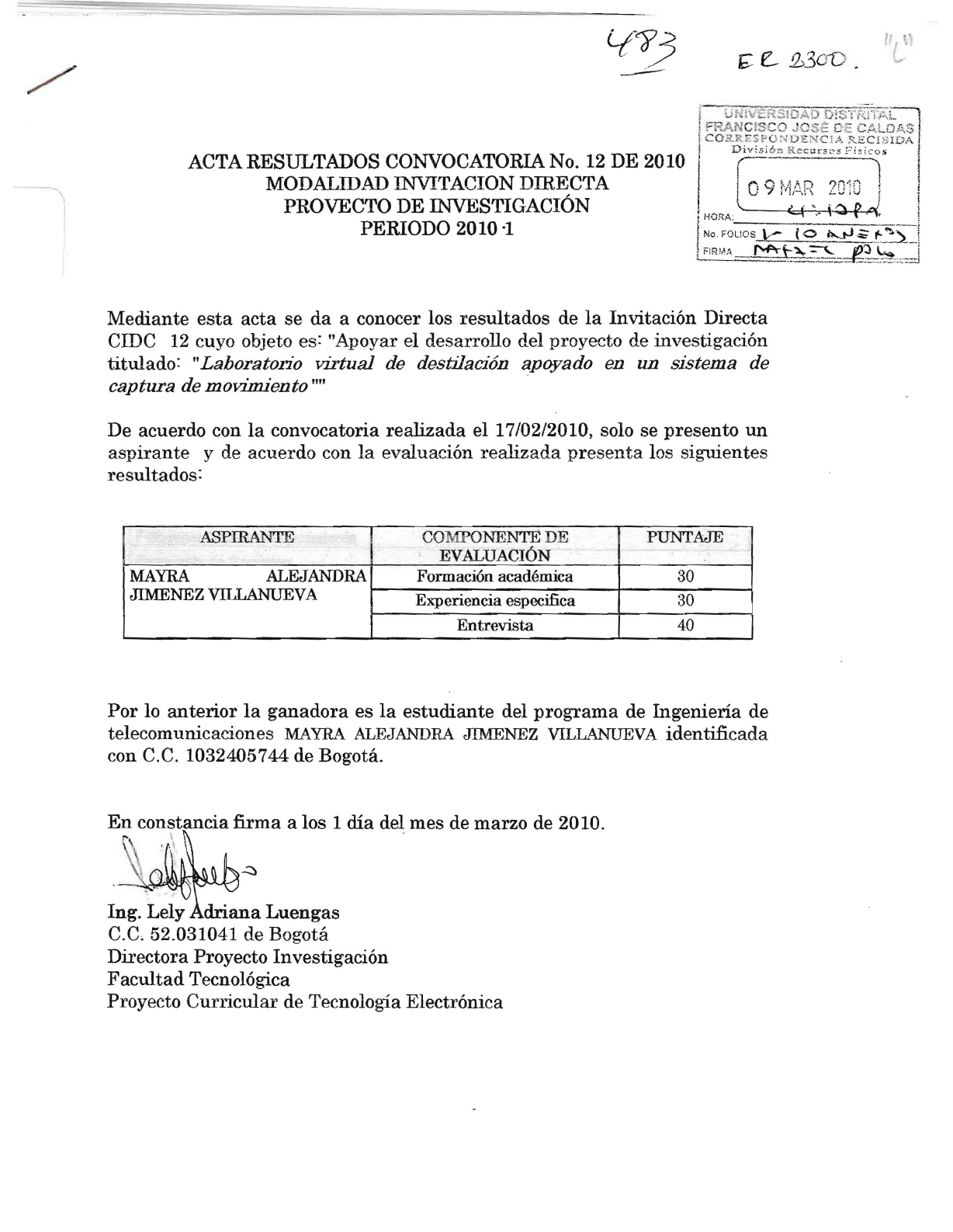 ACTA RESULTADOS CONVOCATORIA No. 12 DE 2010 MODALIDAD INVITACrON DIRECTA PROVECTO DE INVESTlGACrON PERlODO 2010 ·1 Mediante esta acta se da a conocer los resultados de la Invitacion Directa ClnC 12 cuyo objeto es: "Apoyar el desarrollo del proyecto de investigacion titulado: "Lahoratorio virtual de destilecioa apoyado en un sistema de capture de movimiento III' . De acuerdo con la convocatoria realizada el 17/02/2010, solo se presento un aspirante y de acuerdo con la evaluacion realizada presenta los siguientes resultados: ASPIRA.NTE COMPONE NTE DE EVALUACI6N PUNTAJE MAYRA ALEJANDRA Formaci6n academica 30 JIMENEZ VILLANUEVA Experiencia especifica 30 Entrevista 40 Por 10 anterior la ganadora es la estudiante del programa de Ingenieria de telecomunicaciones MAYRA ALEJANDRA JIMENEZ VILLANUEVA identificada con C.C. 1032405744 de Bogota. Ing. Lely driana Luengas C.C, 52.031041 de Bogota Directora Proyecto Investigacion Facultad Tecnologica Proyecto Curricular de Tecnologia Electronica En constancia firma a los 1 ilia del mes de marzo de 2010. \ . , . \