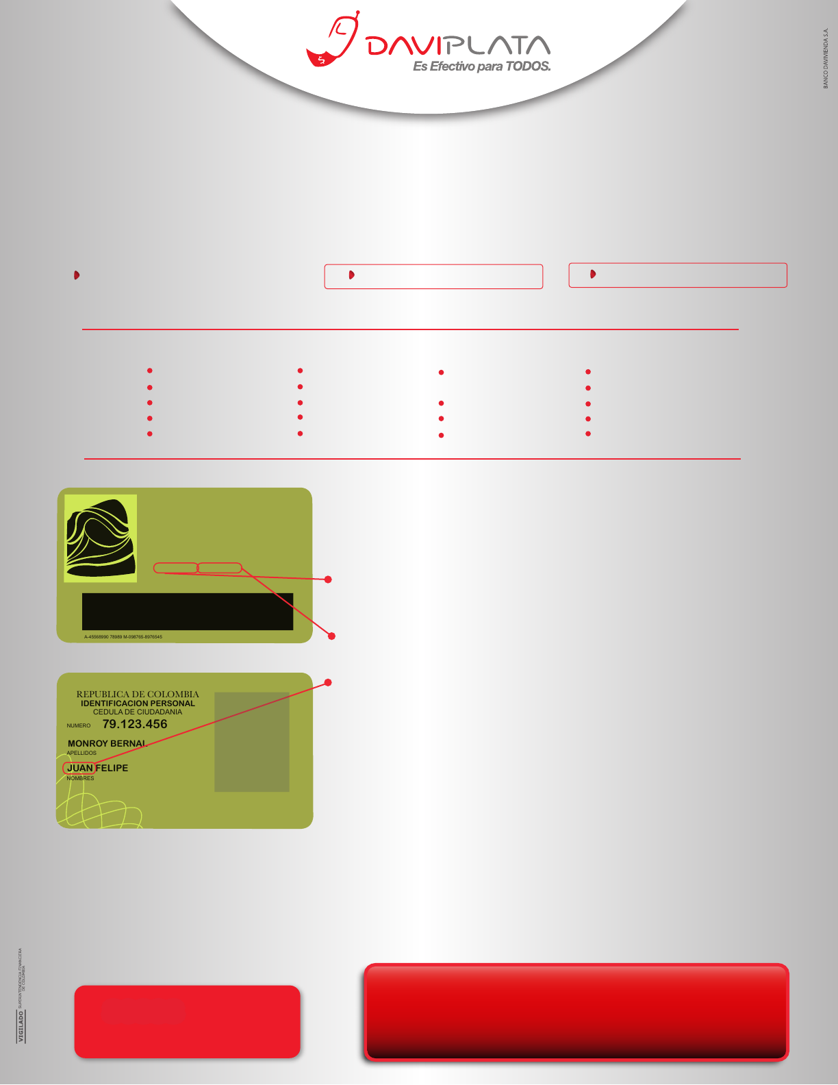 Si le sale en la pantalla de su celular durante la activación: ¿Cómo activar DaviPlata? Permitir tarjeta SIM. Déle OK o sí. Recibiendo 01/07. Espere. Enviando mensaje. Espere. Tenga a la mano su celular Claro, Tigo, Uff y Movistar, su documento de identidad y siga los pasos: Antes de empezar tenga en cuenta las siguientes recomendaciones: 1. Si su celular es: Escriba el número de su documento. Ejemplo: 79123456 (sin puntos). 3. Escriba el Tipo de documento de identidad: Cédula de Ciudadanía, Tarjeta de Identidad y cédula de extranjería. 2. 4. Escriba la fecha de expedición de su documento de identidad. En la cédula aparece así : 23-ago-1980. Escríbalo en números y sin espacios así: 23081980 6. Escriba su primer nombre. Ejemplo: Juan 7. Escriba una clave de 4 números (es importante que usted la recuerde fácilmente y por seguridad no permita que nadie conozca la clave). 8. Escriba otra vez la misma clave (esto es para confirmar). 9. Le preguntará si leyó y acepta el contrato. Dele ok o sí. 10. Le llegará un mensaje dándole la Bienvenida a DaviPlata. 5. Escriba la ciudad de expedición de su documento de identidad. Ejemplo: Bogota (sin tildes). A-45568990 78989 M-098765-8976545 FECHA DE NACIMIENTO 23-AGO-1980 LUGAR DE NACIMIENTO BOGOTÁ D.C. (CUNDINAMARCA) ESTATURA 1.62 G.S. RH B+ SEXO M FECHA Y LUGAR DE EXPEDICION 23-AGO-1980 BOGOTÁ D.C. CEDULA DE CIUDADANIA REPUBLICA DE COLOMBIA IDENTIFICACION PERSONAL 79.123.456NUMERO APELLIDOS NOMBRES JUAN FELIPE MONROY BERNAL Recomendaciones de seguridad: 1.Recuerde que todos los mensajes de texto le llegarán del 80888, es el único medio autorizado por DaviPlata para enviar mensajes de texto 2.La clave es personal, nunca se la diga a nadie, si alguien conoce su clave cámbiela. Así de fácil su DaviPlata ya está listo para usarlo. Recuerde que con DaviPlata usted puede pasar plata, recargar celulares prepago, pagar facturas, sacar plata del cajero automático, recibir giros nacionales e internacionales. D av iP la ta e s un d ep ós ito d e di ne ro e le ct ró ni co , a pl ic an v al or es m áx im os y m ín im os p er m iti do s pa ra la a dm in is tr ac ió n, d es de y h ac ia D av iP la ta . A pl ic a pa ra u su ar io s: C la ro , M ov is ta r, Ti go y U ff. P ar a m ás in fo rm ac ió n co ns ul te w w w .d av ip la ta .c om Para mayor información de DaviPlata : Llame gratis desde su celular al #688 80888 85888 Envíe gratis un mensaje de texto con su pregunta al www.daviplata.com o ingrese a Claro Vive tu SIM Mis Bancos Reg. Banco Bancos DaviPlata Mundo Tigo Herramientas Banca Móvil Reg. Bancos DaviPlata Tigo Mis servicios U� Banca Móvil Reg. Bancos DaviPlata U� Movistar Utilidades Mis Bancos Reg. Bancos DaviPlata Movistar 1PASO 2PASO Escoja la opción Sacar Plata. Escriba cuánta plata quiere sacar en el cajero (Monto de $10.000 hasta $720.000 en múltiplos de $10.000). Escriba la clave de su DaviPlata. (Ésta clave es la que escribió cuando se activó). Confirme cuánta plata quiere sacar. (Éste es el valor que quiere sacar). 2 3 4 1 Ahora debe ir a cualquier cajero automático de Davivienda para sacar la plata: *Luego saldrá una pantalla de consultar el costo y el saldo, si desea consúltelo, si no es así oprima continuar. El cajero automático le entregará la plata que pidió sacar. ¿Cómo sacar la plata desde DaviPlata? SIGA ESTOS DOS PASOS: 1. ENTRE AL MENÚ DE SU CELULAR Para celulares TigoPara celulares Tigo Para celulares ClaroPara celulares Claro Vive tu SIM Mis bancos Banca Móvil DaviPlata Mundo Tigo Herramientas Banca Móvil Banca Móvil DaviPlata 2. ENTRE A DAVIPLATA Le saldrá una pantalla con un código de retiro de 6 números, memorícelos. A partir de ese momento tiene 1 hora para retirar su plata en el cajero automático o Punto DaviPlata. Si después de una hora no ha ido a sacar su plata, ésta se devuelve al celular del DaviPlata y debe hacer de nuevo todos los pasos anteriores Para celulares MovistarPara celulares Movistar Movistar Utilidades Mis Bancos Mis Bancos DaviPlata Busque el botón Retiros DaviPlata y oprímalo. Escriba el número de 6 dígitos que le salió en la pantalla del celular. Escriba la cantidad de plata que pidió sacar en el celular. Debe escribir el número del DaviPlata que es el mismo número del celular. 85888 Para mayor información envíe un mensaje de texto gratis con su pregunta al Tod� l� martes recibirá minut� adicionales con sus recargas... Sólo con Para que no pare de hablar DaviPlata y Para celulares UffPara celulares Uff Mis servicios Uff Banca Móvil Banca Móvil DaviPlata