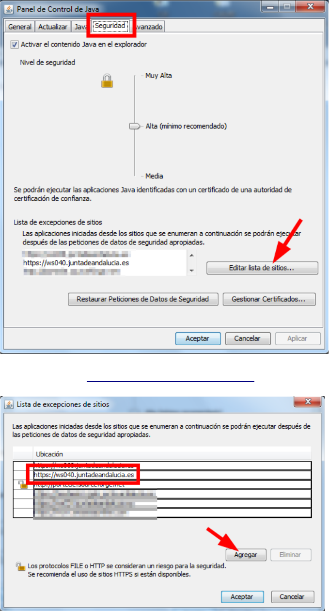 Para permitir la firma electrónica con la última actualización de Java (1.7.0_51) en Centro de Firmas es necesario realizar las siguientes operaciones: 1. Acceder al Panel de Control y seleccionar Java. 2. En la pestaña Seguridad pulsar sobre la opción "Editar lista de sitios" 3. Agregar el sitio https://ws040.juntadeandalucia.es https://ws040.juntadeandalucia.es/ Tras realizar esta configuración se puede acceder de nuevo a Centro de Firmas y realizar la operación. Cuando en navegador nos advierta de que se ejecutará la aplicación de firma pulsaremos siempre en "Ejecutar" (Se puede marcar la casilla "No volver a mostrar..." para que no vuelva a pedirnos confirmación).
