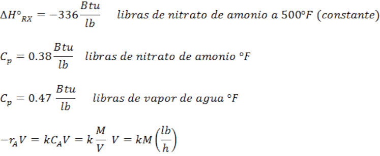 Nombre: Vera Cantos Raiza Mishelle Materia: Ingeniería de las Reacciones II Ejercicios del Capítulo 8 de Fogler PROBLEMA 4 P8-4 El siguiente es un extracto de The Morning News, de Wilmington, Delaware (3 de agosto de 1977): “Los investigadores están examinando los desechos de la explosión con objeto de determinar la causa (que provocó la destrucción de la nueva planta de óxido nitroso). Un vocero de la compañía dijo que parece probable que la explosión (mortal) haya sido causada por otro gas (nitrato de amonio), el cual se emplea para producir óxido nitroso”. Se alimenta una solución acuosa de 83% (en peso) de nitrato de amonio y 17% de agua a 200°F al CSTR operado a una temperatura de aproximadamente 510 °F. El nitrato de amonio fundido se descompone directamente para producir óxido nitroso gaseoso y vapor de agua. Se cree que se observaron fluctuaciones de presión en el sistema; como resultado, el nitrato de amonio fundido que se alimentó al reactor quizás haya dejado de fluir aproximadamente 4 minutos antes de la explosión. (a) ¿Puede usted explicar la causa de la explosión? (b) Si la velocidad de alimentación al reactor justo antes del cierre de la válvula fue de 310 libras de solución por hora, ¿cuál era la temperatura exacta en el reactor justo antes del cierre? (c) ¿Cómo arrancaría o detendría una reacción de este tipo para controlarla? (d) ¿Qué aprendería al aplicar los criterios para reacciones descontroladas? Asuma que en el momento en que se detuvo la alimentación al CSTR había 500 libras de nitrato de amonio dentro del reactor. Se cree que la conversión en el reactor es prácticamente completa, cerca del 99.99%. Información adicional (aproximada, pero cercana al caso real): Donde M es la masa de nitrato de amonio en el CSTR (libras) y k está dada por la siguiente relación. T (°F) 510 560 k ( ) 0.307 2.912 Las entalpías de agua y de vapor de agua son Explore este problema y describa lo que encuentre. (Por ejemplo, ¿puede graficar una forma de R (T) contra G(T)) (f) Discuta cuál cree que es el objetivo del problema. La idea para este problema se derivó de un artículo escrito por Ben Horowitz. SOLUCION Encuentre la temperatura del reactor en estado estacionario (antes de apagar). Deje M= masa del NH4NO3 en el reactor. Balance de Masa: ; Balance de Energía: Donde es la entalpia de i a la temperatura de la reacción, es el calor de vaporización de A, y es el calor de reacción a la temperatura de salida. El último término cuenta para lo que no ha reaccionado de NH4NO3 donde existe como en lugar del vapor el liquido. Ahora nosotros podemos hacer algunas sustituciones. Capacidad del calor para A es dada, y el cambio de entalpia para el agua 200°F (l) 500°F (g) is también dada. Entonces, dividiendo después para , nosotros obtenemos La ecuación previa asume que las capacidades de calor son constantes sobre un rango razonable de temperatura. El cambio de fase NH4NO(aq) NH4NO(l) es isoentálpico. En adición, nosotros debemos tener en cuenta la dependencia de la temperatura para el efecto de Si nosotros tenemos ó, Sustitución numérica con K(560)=5.03 y k(510)=0.53 (P= 1 atm sobre 450-500°F Himmelblau) Sustituyendo todo esto en los balances de masa y energía: Balance de masa: Balance de Energía: Asumiendo X=0.96 y M=500. Tenemos, del balance de masa: PROBLEMA 6 P8-6. La reacción en fase liquida elemental orgánica e irreversible Se lleva a cabo adiabáticamente en un reactor de flujo. Entra una alimentación equimolar de A y B a 27°C, en tanto el flujo volumétrico es de 2dm3/s y CA0= 0.1 Kmol /m3. a) Calcule los volúmenes de PFR y CSTR necesarios para lograr una conversión del 85% ¿Cuál es el motivo de las diferencias? b) ¿Cuál es la temperatura máxima de entrada que se puede utilizar para que no se exceda el punto de ebullición del líquido (550 K) aun en el caso de conversión total. c) Grafique la conversión y la temperatura en función del volumen del PFR (es decir, la distancia a lo largo del reactor). d) Calcule la conversión que puede lograse en un reactor CSTR de 500 dm3 y en dos CSTR de 250 dm3 en serie Información adicional , , Resolución Desde la alimentación es equimolar, CAO = CBO = 0.1 mol/dm3 Adiabático: a) Para el PFR, FAO = C AO v o=0.1 *2 =0.2 mol s/dm3 Utilizando el ambiente polimath EDO Vemos que para la conversión de 0.85 el valor máximo para el volumen es de 308.2917 dm3 Para el CSTR Si X=0.85 entonces La razón por esta diferencia de la temperatura y por lo tanto la velocidad de reacción permanece constante a lo largo del todo el CSTR (igual a las condiciones de salida), mientras que para un PRF, la velocidad se incrementa gradualmente con la temperatura de la entrada y de la salida, entonces la velocidad incrementa con la longitud. b) Para una temperatura de ebullición de 550 K c) Grafica T= f(V) Grafica X=f(V) d) Para V=500 dm3, FAO =0.2 Utilizando el ambiente polimath NON-LINEAR EQUATIONS Por lo tanto, para un PFR de 500 dm3 se logra una X=0.92 y una T=484.4K Para la conversión en 2 CSTR’s de 250 dm3 cada uno, Para el primero CSTR, usando una programación análoga y V=250 dm3 T = 476.48 y X=0.8824 Por lo tanto, en el segundo reactor Por lo tanto la conversión final X=0.9693 PROBLEMA 8 P8-8. La reacción elemental irreversible en fase gaseosa A→B+C Se efectúa adiabáticamente en un PFR reactor tubular empacado con catalizador. Entra A puro al reactor con un flujo volumétrico de 20k dm3/s y presión de 10 atm y temperatura de 450 k. a. Grafique la conversión y la temperatura a lo largo del PFR hasta que se logre una conversión del 80% (de ser posible). (El peso máximo del catalizador que puede empacarse en el PFR es de 50 Kg). Asuma que ∆P=0,0 b. ¿Qué peso de catalizador es necesario para lograr una conversión del 80% en un CSTR? c. Escriba una pregunta que requiera de pensamiento crítico y después explique por qué lo necesita. d. Ahora tome en cuenta la caíd