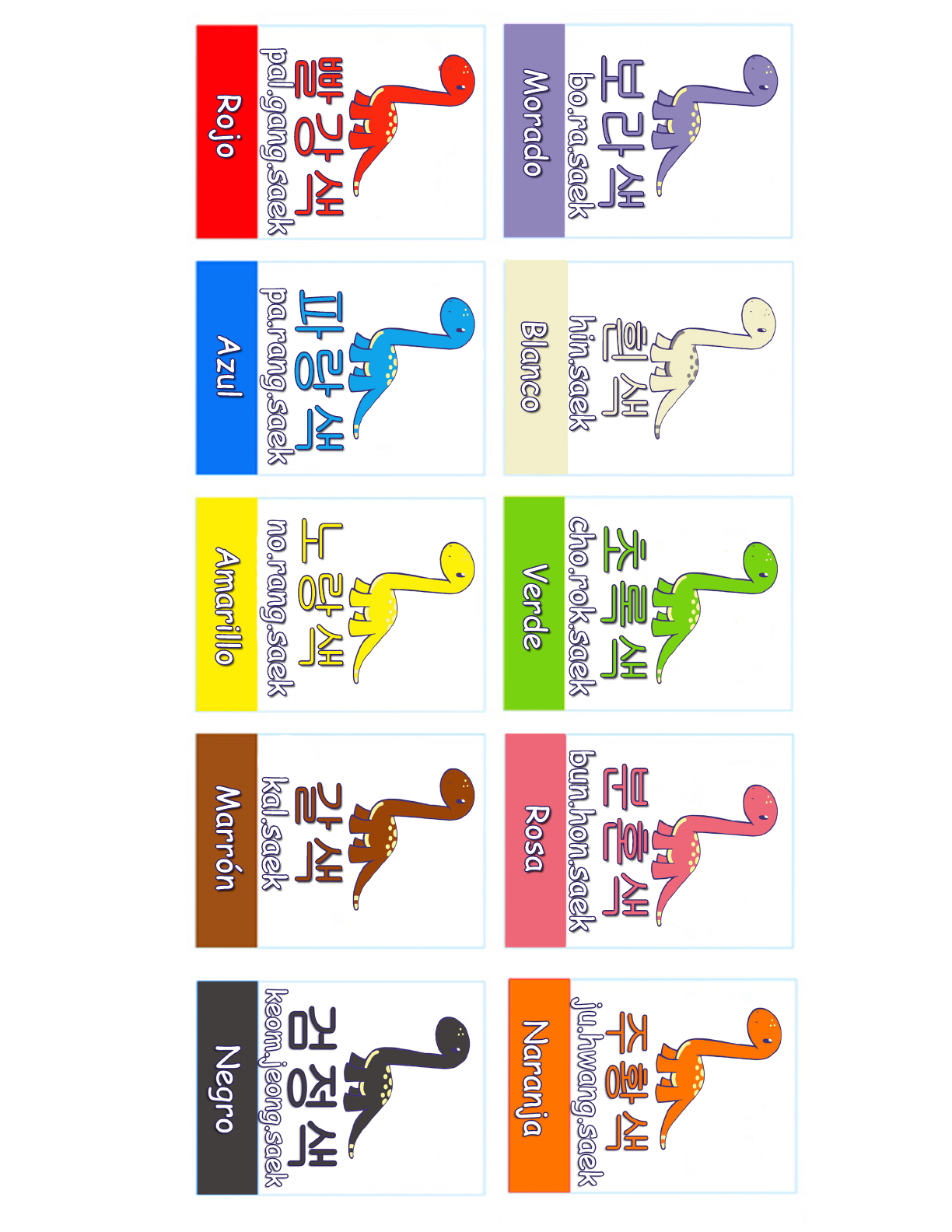 bo.ra.saek M orado hin.saek Blanco cho.rok.saek Verde bun.hon.saek Rosa kal.saek M arrón no.rang.saek A m arillo pa.rang.saek A zul pal.gang.saek Rojo 빨 강 색 파 랑 색 노 랑 색 갈 색 보 라 색 흰 색 초 록 색 분 혼 색
