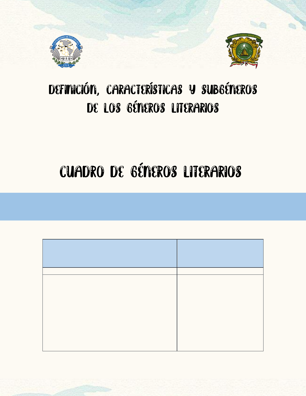 UNIVERSIDAD DE IXTLAHUACA CUI ESCUELA PREPARATORIA “QUÍMICO JOSÉ DONACIANO MORALES” GENEROS LITERARIOS: Es la clasificación de escritos literarios en grupos según sus características en común. Aristóteles fue el creador de los géneros literarios. GÉNERO: NARRATIVO. DEFINICIÓN: Aquí se clasifican los escritos que relatan historias mezcla de ficción con realidad. CARACTERÍSTICAS O ELEMENTOS SUBGÉNEROS 1. Autor: Persona que escribe el texto y a través de él, transmite su sentir y vivencias o acción. 2. Argumento: Asunto del que se trata la obra. a) Presentación: Parte del relato que nos presenta a los personajes, como se relacionan y que hechos los entrelazan. b) Desarrollo: Acciones que van realizando los personajes, que los van llevando a lo largo de la historia, hasta conducirlos al punto central del clímax. A. Novela: Narración extensa escrita en prosa, que narra acontecimientos reales o ficticios, implicando un conflicto y desarrollo, sabiendo que pueden resolverse de manera positiva o negativa. B. Cuento: Narración breve de carácter ficticio o real, GÉNERO NARRATIVO c) Clímax: Momento de mayor tensión, se presenta una situación decisiva para el desarrollo de la historia. 3. Narrador: Es una creación del autor, su función es darnos a conocer la historia. a) Protagonista: El narrador es también el personaje principal de la historia (autobiografía real o ficticia). Narra en primera persona (yo). b) Omnisciente: (Que todo lo sabe). Sabe lo que piensan y sienten los personajes. c) Testigo: Solo cuenta lo que puede observar. El narrador muestra lo que ve, de modo parecido a como lo hace una cámara de cine. Narra en tercera persona (el, ella, ellos, ellas). 4. Personajes: Agentes que realizan las acciones, conducen la historia a lo largo del desarrollo de las acciones. a) Principales: Aparecen desde que inicia hasta que termina la historia. b) Secundarios: Son los que ayudan a que se realicen los principales. c) Incidentales: Aquellos que aparecen o se mencionan una vez. 5. Tiempo: Es el momento en el que transcurre la historia de manera progresiva. a) Cronológico: El que se mide en minutos, días, horas, meses, años. b) Historia: La época en que se escribió. c) Analepsis: Consiste en la interrupción de la secuencia cronológica de eventos para insertar eventos o escenas de ocurrencia anterior. d) Prolepsis: Se narra un acontecimiento que ocurrirá después del tiempo del relato. 6. Espacio: Lugar o lugares en los que los personajes interactúan, se presentan, se mueven. a) Interior: Cuando las acciones se desarrollan en espacios cerrados. b) Exterior: Cuando lo contado sucede en espacios abiertos. 7. Ambiente: Conjunto de condiciones o circunstancias físicas, sociales, económicas, con un argumento fácil de entender. psicológicas de un lugar, colectividad o época. a) Físico: Sitio donde se desenvuelve la historia y confluyen los personajes. b) Social: Condición social en que se desenvuelve la acción tomando en cuenta nivel cultural, económico, religioso y clase social a la que pertenecen los personajes. c) Psicológico: Ambiente emocional e íntimo que experimentan los personajes. 8. Opinión personal: Se trata de aportar argumentos que tengan relación con el texto, se valoraran tanto los argumentos aportados, como como la originalidad de los mismos. GÉNERO: ÉPICO. DEFINICIÓN: Relata sucesos que le han ocurrido al protagonista. La épica es la expresión de un pueblo como ciencia colectiva, el tema central es la libertad humana. El autor presenta de forma objetiva hechos legendarios o ficticios desarrollados en un tiempo y espacio determinados. CARACTERÍSTICAS O ELEMENTOS SUBGÉNEROS 1. Tratan sobre hechos, acontecimientos o peripecias más o menos verdaderas o falsas. 2. La mayoría de los verbos están en pasado. 3. Se divide en capítulos. 4. Lucha entre hombres y dioses. A. Epopeya: Narra una acción memorable y de gran importancia para la humanidad o para un pueblo. B. Poema épico: Relata hazañas heroicas de un héroe nacional con el propósito de exaltar los valores de la nación. GÉNERO ÉPICO C. Romance: Narración en versos octosílabos con rima asonante en los pares, que describe acciones guerreras, caballerescas, amorosas. D. Fábula: Relato en prosa o en verso de una anécdota de la cual puede extraerse una consecuencia moral o moraleja; sus personajes suelen ser animales. E. Epístola: Tambien escrita en verso o en prosa, expone algún problema de carácter general. GÉNERO: LÍRICO. DEFINICIÓN: Es el que expresa sentimientos y emociones del autor, escrito en verso y en primera persona el “YO” surge en la antigua Grecia como poemas recitados acompañados de un instrumento musical de cuerdas llamado “Lira”. CARACTERÍSTICAS O RECURSOS ESTILÍSTICOS LITERARIOS SUBGÉNEROS 1. Existe la métrica que estudia a la estrofa, verso y poema: a) Verso: es cada uno de los renglones del poema. b) Estrofa: es el conjunto de versos de un poema (generalmente se agrupan en estrofas de 4 versos cada una). 1. Canción: expresa diversos sentimientos acompañados con música. 2. Oda: composición poética que expresa su admiración a algo o alguien. Género lírico c) Poema: es la composición completa escrita en verso que contiene: metro, sinalefa, rima, ritmo y recursos estilísticos o también llamados figuras literarias. 3. Soneto: composición poética de 14 versos endecasílabos (11 sílabas) divididos en dos tercetos y dos cuartetos con rima consonante. 4. Elegía: composición que expresa tristeza o dolor por la pérdida de un ser. CARACTERÍSTICAS O RECURSOS ESTILÍSTICOS DEFINICIÓN EJEMPLO 2. METRO Es la medida silábica que se hace de cada verso. Cuando un verso tiene 8 o menos sílabas se llama, verso de arte menor. Cuando un verso tiene 9 o más sílabas se llama verso de arte mayor. “qui sie ra co bi jar la ba jo” tiene 9 sílabas. 3. SINALEFA Cuando una palabra termina en vocal y la siguiente inicia en vocal, se un