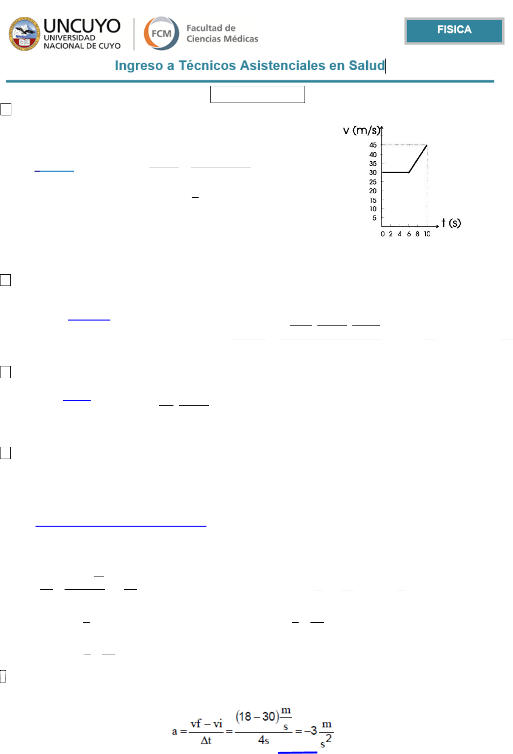 RESPUESTAS 1 Teniendo en cuenta el gráfico que representa la velocidad de un cuerpo en función del tiempo, ¿cuál es la distancia recorrida durante los primeros 10 s?: a) 90 m b) 150 m c) 180 m d) 330 m e) 420 m Otra forma es encontrar el área debajo de la curva: Sup Rectang + Sup Triang = (30m/s.10s+(4s.15m/s)/2)=330m 2 Un móvil marcha con M.R.U.V. A los 6,2 s de iniciada su marcha adquiere una velocidad de 15 km/h. Teniendo en cuenta que partió del reposo, indicar su aceleración: a) 0,067 m/s2 b) 0,672 m/s2 c) 2,421 m/s2 d) 3,751 m/s2 e) 40,341 m/s2 3 Un móvil se desplaza con movimiento rectilíneo uniforme a 24 cm/s. Indicar la distancia recorrida en 5s: a) 0,12 m b) 1,20 m c) 2,40 m d) 120 m e) 240 m 4 Un móvil parte del reposo, con M.R.U.V., al cabo del primer segundo, alcanzó una velocidad de 5 m/s. Indicar el valor de su velocidad a los 10 s (VI0), la distancia recorrida en ese tiempo (d10) y la distancia recorrida entre el noveno y el décimo (d9-10): a) V10 = 50 m/s ; d10 = 125 m ; d9-10 = 95 m b) V10 = 25 m/s ; d10 = 125 m ; d9-10 = 42,5 m c) V10 = 50 m/s ; dlO = 250 m ; d9-10 = 47,5 m d) V10 = 50 m/s ; d10 = 125 m ; d9-10 = 30 m e) V10 = 10 m/s ; dlO = 125 m ; d9-10 = = 95m 2 5 01 05 s m s s m t v a s m s s m s m tavv i 5010.50 210 2. 2 1 . tatvx i ms s m tx 25010.5. 2 1 .0 2 210 ms s m sx 5,2029.5. 2 1 9.0 2 29 mmmxxx 5,475.202250910109 5 Un automóvil que viaja a una velocidad de 30 m/s comienza a frenar y al cabo de 4 segundos su velocidad es de 18 m/s. ¿Cuál es la aceleración en ese intervalo de tiempo?: mmmx mtatvix sm s sm t vivf a mssmtvx Total 330150180 150.. 2 1 . /75,3 4 /)3045( 1806./30. 2 2 2 1 2 s m 0,6720a 2 6720,0 2,6 3600 1 . 1 1000 .15 s m s s h km m h kmm tt vv a if if sm cm m s cm /24,0. 100 1 .24 mssmtvx 2,15./24,0. 6 Una motocicleta, que sale de la posición de reposo, alcanza una velocidad de 80 km/h al cabo de 15 segundos, desplazándose con aceleración constante. ¿Qué espacio recorrió en ese tiempo?: 7 Un automóvil que viaja a una velocidad de 28 m/s, comienza a frenar con una aceleración negativa de 4 m/s2: a) ¿Qué tiempo tarda en detenerse?: b) ¿Qué espacio recorre en 3 s?: 8 Una bicicleta que se mueve con M.R.U., a una velocidad de 5 m/s, entra en una pendiente que le imprime un M.R.U.A. con aceleración de 0,2 m/s2. Sabiendo que tarda 30 segundos para recorrer toda la pendiente, ¿cuál es la longitud de esa pendiente?: 9 Calcular la velocidad inicial de un móvil que con una aceleración de 0,5 m/seg2 alcanza una velocidad de 100 m/seg al cabo de 30 seg. 10 Un móvil posee una velocidad de 15 m/seg. Si en ese instante aplica los frenos y se detiene después de 20 seg, . ¿cuál es su aceleración negativa? 11 ¿Cuál es la velocidad de un móvil a los 2 min, si parte del reposo con una aceleración de 0,7 m/seg2? 12 Un móvil, que posee una velocidad de 15 m/seg, adquiere un movimiento uniformemente acelerado. Si su aceleración es de 0,5 m/seg2, ¿cuál será la velocidad al cabo de 40 seg y cuál el espacio recorrido? 13 Un móvil posee una velocidad inicial de 80 km/h y recorre 500 m en 12 seg. ¿Qué aceleración adquiere y qué velocidad poseerá en este momento? 14 Un móvil parte del reposo con movimiento uniformemente acelerado. ¿Qué velocidad tendrá a los 3 min si su aceleración es de 0,5 m/ seg2? 15 Un tren marcha con aceleración constante de 4 m/seg2. Alcanza su velocidad máxima a los 6 min. En ese momento aplica los frenos y se detiene al minuto y medio. Se desea saber: a) ¿cuál es la velocidad alcanzada?; b) ¿cuál es la aceleración durante el tiempo de frenado?; c) ¿cuál es la distancia total recorrida por el tren? 16 En el siguiente gráfico de x (posición) en función de t (tiempo), se representa el movimiento de una partícula durante 9 segundos. ¿Cuál es el desplazamiento total Δx del móvil? a) Δx = 5 m b) Δx = 4 m c) Δx = 1 m d) Δx = 9 m e) Δx = 2 m 17 Una persona conduce su auto con M.R.U. a razón de 60 km/h, se le baja una llanta y emplea 20 minutos en cambiarla, si le faltan 120 km para llegar a su destino, entonces la rapidez constante (en km/h) que debe emplear para llegar a su destino en el tiempo predeterminado es: a) 65 km/h b) 72 km/h c) 80 km/h d) 96 km/h e) 100 km/h 18 Si se deja caer un cuerpo libremente solo por la propia acción de su peso. ¿Cuál es la velocidad con que inicia el movimiento? a) 9,8 m/s b) 0 m/s c) – 9,8 m/s d) no hay forma de saberlo 19 Cuando un cuerpo que es arrojado hacia arriba alcanza su altura máxima, su velocidad es.... a) nula b) – 9.8 m/s c) 9,8 m/s d) cualquier otro valor 20 Si un cuerpo se deja caer desde 100 m de altura, al llegar al suelo su velocidad es: a) igual que al comenzar el movimiento b) distinta de cero c) igual a cero d) positiva 21 Desde una torre se deja caer una piedra que pesa 2 kgf y tarda 4 segundos en llegar al suelo. Para saber la altura de la torre ¿Cuál es el dato que no tiene importancia en esta situación? a) el tiempo b) la aceleración de la gravedad c) el peso d) la velocidad inicial 22 Desde un edificio se deja caer un objeto que tarda 7 segundos en llegar al suelo. ¿Cuál es la altura del edificio? a) 480,2 m b) 487,2 m c) 240,1 m d) 247,1 m 23 Se dispara una bala verticalmente hacia arriba con una velocidad inicial de 500 m/s. ¿Cuanto tiempo tarda en alcanzar la altura máxima? a) 51 segundos b) 99,8 segundos c) 500 segundos d) 9,8 segundos 24 Analizando el movimiento de caída libre, determine cual de las siguientes afirmaciones es verdadera: a) la velocidad es constante. b) la aceleración es constante. c) la aceleración aumenta paulatinamente. d) la velocidad final es de 9,8 m/s. e) la distancia recorrida es proporcional al tiempo. 25 En los lanzamientos verticales, si la velocidad con que un cuerpo es lanzado hacia arriba se duplica, debe esperarse que la altura que alcance dicho cuerpo se: a) duplique. b) triplique. c) cuadruplique. d) septuplique. e) conserve. 26 En relación con el tiempo que e
