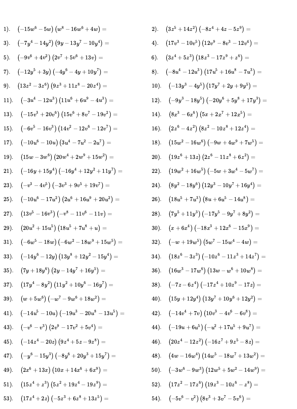 Multiplicación entre Binomio y Trinomio Resolver las siguientes operaciones: 1). (−15 − 5w)( − 16 + 4w) =w6 w8 w6 2). (3 + 14 )(−8 + 4z − 5 ) =z5 z2 z4 z9 3). (−7 − 14 )(9y − 13 − 10 ) =y4 y2 y7 y4 4). (17 − 10 )(12 − 8 − 12 ) =v3 v5 v9 v3 v4 5). (−9 + 4 )(2 + 5 + 13v) =v6 v2 v7 v6 6). (3 + 5 )(18 − 17 + ) =z4 z3 z3 z9 z6 7). (−12 + 3y)(−4 − 4y + 10 ) =y5 y6 y7 8). (−8 − 12 )(17 + 16 − 7 ) =u4 u3 u5 u8 u3 9). (13 − 3 )(9 + 11 − 20 ) =z2 z6 z3 z8 z4 10). (−13 − 4 )(17 + 2y + 9 ) =y3 y5 y7 y5 11). (−3 − 12 )(11 + 6 − 4 ) =u4 u3 u6 u9 u3 12). (−9 − 18 )(−20 + 5 + 17 ) =y3 y5 y6 y8 y3 13). (−15 + 20 )(15 + 8 − 19 ) =v3 v6 v6 v7 v2 14). (8 − 6 )(5x + 2 + 12 ) =x3 x6 x7 x5 15). (−6 − 16 )(14 − 12 − 12 ) =v5 v3 v2 v6 v7 16). (2 − 4 )(8 − 10 + 12 ) =z6 z2 z2 z8 z4 17). (−10 − 10u)(3 − 7 − 2 ) =u6 u4 u2 u7 18). (15 − 16 )(−9w + 4 + 7 ) =w2 w6 w9 w5 19). (15w − 3 )(20 + 2 + 15 ) =w6 w4 w9 w2 20). (19 + 13z)(2 − 11 + 6 ) =z6 z6 z8 z2 21). (−16y + 15 )(−16 + 12 + 11 ) =y4 y4 y2 y7 22). (19 + 16 )(−5w + 3 − 5 ) =w2 w5 w4 w7 23). (− − 4 )(−3 + 9 + 19 ) =v3 v5 v3 v5 v7 24). (8 − 18 )(12 − 10 + 16 ) =y2 y6 y3 y7 y4 25). (−10 − 17 )(2 + 16 + 20 ) =u6 u2 u6 u9 u2 26). (18 + 7 )(8u + 6 − 14 ) =u5 u3 u5 u8 27). (13 − 16 )(− − 11 − 11v) =v5 v3 v8 v6 28). (7 + 11 )(−17 − 9 + 8 ) =y5 y3 y5 y7 y2 29). (20 + 15 )(18 + 7 + u) =u2 u5 u5 u8 30). (x + 6 )(−18 + 12 − 15 ) =x4 x3 x6 x9 31). (−6 − 18w)(−6 − 18 + 15 ) =w5 w2 w9 w5 32). (−w + 19 )(5 − 15 − 4w) =w5 w7 w4 33). (−14 − 12y)(13 + 12 − 15 ) =y6 y8 y2 y4 34). (18 − 3 )(−10 − 11 + 14 ) =z6 z3 z6 z3 z7 35). (7y + 18 )(2y − 14 + 16 ) =y6 y7 y5 36). (16 − 17 )(13w − + 10 ) =w3 w6 w6 w8 37). (17 − 8 )(11 + 10 − 16 ) =y4 y2 y2 y6 y7 38). (−7z − 6 )(−17 + 10 − 17z) =z4 z4 z9 39). (w + 5 )(− − 9 + 18 ) =w6 w7 w6 w2 40). (15y + 12 )(13 + 10 + 12 ) =y4 y7 y6 y2 41). (−14 − 10u)(−19 − 20 − 13 ) =u5 u3 u8 u5 42). (−14 + 7v)(10 − 4 − 6 ) =v4 v3 v6 v8 43). (− − )(2 − 17 + 5 ) =v6 v3 v9 v2 v4 44). (−19u + 6 )(− + 17 + 9 ) =u5 u2 u5 u7 45). (−14 − 20z)(9 + 5z − 9 ) =z4 z4 z8 46). (20 − 12 )(−16 + 9 − 8z) =z4 z2 z7 z5 47). (− − 15 )(−8 + 20 + 15 ) =y6 y3 y6 y3 y7 48). (4w − 16 )(14 − 18 + 13 ) =w4 w5 w7 w2 49). (2 + 13x)(10x + 14 + 6 ) =x6 x6 x9 50). (−3 − 9 )(12 + 5 − 14 ) =w6 w3 w5 w2 w9 51). (15 + )(5 + 19 − 19 ) =z4 z3 z2 z4 z9 52). (17 − 17 )(19 − 10 − ) =z2 z6 z3 z6 z8 53). (17 + 2z)(−5 + 6 + 13 ) =z4 z3 z8 z5 54). (−5 − )(8 + 3 − 5 ) =v6 v2 v3 v7 v6 55). ( + 14 )(13 − 9 + 14 ) =u6 u3 u4 u9 u3 56). (10 + 19 )(−19 + 19 + 6 ) =w4 w2 w6 w3 w9 57). (−17y + 10 )(−9 − 3 + 18 ) =y5 y9 y3 y4 58). (8 + 19 )(−10 + 6 + 10 ) =y6 y2 y4 y8 y3 59). (−3 + 7 )(2 + 15 + 12 ) =y6 y2 y3 y6 y7 60). (2 − 3 )(−14 + 10 + 11 ) =y5 y3 y5 y7 y3 61). (18 − 13w)(−3 + 9 − 18 ) =w5 w5 w3 w7 62). (16 + 15 )(−10 − 4x + 3 ) =x6 x2 x8 x6 63). (y + 10 )(17 − 19 + 8 ) =y6 y9 y6 y3 64). (20 − 19 )(6 − 15 − 9 ) =v3 v4 v6 v9 v3 65). (14 − 3 )(11 + 9 − 18 ) =u3 u5 u3 u7 u5 66). (−5 − 19 )(−8 − 2 − 6 ) =u3 u5 u3 u5 u9 67). (−19 + 17v)(2 + 13 + 8 ) =v5 v5 v9 v2 68). (14 − 13 )(−9 − 15x − 15 ) =x2 x5 x8 x5 69). (3u + 3 )(9u + + 12 ) =u5 u8 u4 70). (−3 − 8 )(−17 + 2 − 15 ) =x3 x4 x3 x7 x6 71). (−3 + 13 )(−9 + 2v + 3 ) =v2 v6 v9 v6 72). (18 − 8 )(v + 15 − 4 ) =v3 v5 v4 v7 73). (18 + 7 )(6 − 20 + 16 ) =x4 x2 x4 x9 x3 74). (17 − 3 )(−10 + 11 − 8 ) =v3 v4 v2 v6 v8 75). (2 − 6 )(15v − 14 − 13 ) =v3 v5 v4 v9 76). (−19 + 20 )(−15 + 10 + 15w) =w6 w2 w4 w7 77). (7 − 14 )(6 − − 13 ) =x6 x3 x5 x7 x2 78). (14 − 2 )(−19 + 15 − 14 ) =x5 x3 x8 x3 x4 79). (−2 + 11y)(−4 + − 7 ) =y5 y3 y7 y6 80). (−6 − 18 )(16 + 15 + 18 ) =w2 w4 w2 w6 w7 81). (10 + 18 )(−9 + 19 − 17 ) =x6 x2 x4 x2 x9 82). (−8 − 19 )(−2 + 3u − 2 ) =u4 u3 u7 u6 83). (9 − 7v)(−20 − 4 + 12 ) =v5 v3 v5 v9 84). (−5 − 2x)(−3 + 13 + 3 ) =x6 x4 x8 x3 85). (−12 + 17 )(20 − 10 + 7u) =u3 u5 u8 u5 86). (15 + 6 )(−17 + 17 + 4 ) =z4 z2 z5 z3 z9 87). (10 + )(−8 − 15 − 14 ) =u6 u3 u5 u8 u2 88). (− − 8 )(14u − 16 − 19 ) =u3 u4 u5 u9 89). (− + 5w)(−8 − 2 − 9 ) =w4 w7 w6 w2 90). (17 + )(− − 8z + ) =z4 z2 z6 z8 91). (5 − y)(16 − 8 + 18y) =y5 y5 y9 92). (−6 + 7 )(17 − 16 − 6 ) =x6 x3 x2 x9 x5 93). (−11 − )(−7 + 20 − 5 ) =u3 u6 u7 u2 u6 94). (2 + 16 )(8x − 14 − 8 ) =x3 x6 x7 x6 95). (18w + 9 )(13 − 12 + 16 ) =w5 w6 w2 w9 96). (2 − 20 )(y + 18 + 9 ) =y5 y2 y4 y8 97). (5 + 18z)(− − 18 − 20 ) =z5 z4 z9 z3 98). (−10 + 2x)(2 − 7 + 2 ) =x5 x2 x9 x4 99). (−13v − 7 )(−17 − 14 + 19 ) =v4 v5 v8 v2 100). (−8 − 11 )(−16 − 16 + 14 ) =z2 z4 z9 z6 z3 101). (19 + 2 )(−2 − − 4 ) =v2 v5 v3 v8 v6 102). (−15 + 6 )(−9 + 7 − 6 ) =w3 w4 w9 w3 w5 103). (5 − )(19 + 10v − 4 ) =v6 v2 v4 v9 104). (−3y − 9 )(− + 16 − 11 ) =y5 y3 y7 y5 105). (5u − 20 )( − 16 − 6 ) =u4 u5 u7 u3 106). (2 + 13 )(−14 + 17 + 18 ) =w3 w6 w5 w8 w3 107). (−10 − 3x)(8 + 5x − 11 ) =x5 x4 x9 108). (−12 − 18 )(8 + 12 − 8 ) =v3 v6 v6 v9 v3 109). (−10w + 13 )(−3 + 16 − 13 ) =w6 w2 w7 w5 110). (−13 + 15w)(−20 − 16 + 19 ) =w5 w4 w8 w3 111). (6 + )(−17 + 4 − 8 ) =u6 u2 u5 u3 u7 112). (12 + 4y)(−2 + 13 − 5 ) =y6 y4 y3 y7 113). (10w − 15 )(8 + 16 + 20 ) =w5 w4 w2 w9 114). (7 − 19 )(13 − 7 + 4 ) =y2 y6 y8 y6 y2 115). (2 − 20 )(12 + 13 − 2 ) =u6 u3 u2 u6 u7 116). (−14 − 12 )(−8 − 16v − 2 ) =v2 v4 v6 v8 117). (−11 − 13y)(8 − 18 + 18 ) =y4 y2 y4 y8 118). (5u − 5 )(−2 − 15u − 14 ) =u5 u9 u6 119). (−15 + 14 )(−11 − 10 − 9 ) =z6 z2 z7 z4 z2 120). (6 − 16 )(17 − 4z − 3 ) =z2 z5 z4 z7 121). (17 + 10 )(15 + 14 + 13 ) =z6 z2 z2 z6 z7 122). (−12 + 12 )(−16 + 8 − 13 ) =y3 y5 y7 y6 y3