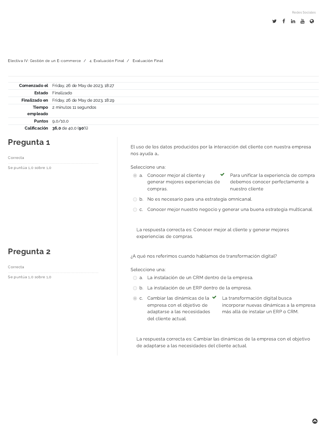 26/5/23, 18:29 Evaluación Final: Revisión del intento https://www.centro-virtual.com/campus/mod/quiz/review.php?attempt=3410116&cmid=24896#question-3424306-9 1/4 Redes Sociales Electiva IV: Gestión de un E-commerce / 4. Evaluación Final / Evaluación Final Comenzado el Friday, 26 de May de 2023, 18:27 Estado Finalizado Finalizado en Friday, 26 de May de 2023, 18:29 Tiempo empleado 2 minutos 11 segundos Puntos 9,0/10,0 Cali�cación 36,0 de 40,0 (90%) Pregunta 1 Correcta Se puntúa 1,0 sobre 1,0 Pregunta 2 Correcta Se puntúa 1,0 sobre 1,0 El uso de los datos producidos por la interacción del cliente con nuestra empresa nos ayuda a… Seleccione una: a. Conocer mejor al cliente y generar mejores experiencias de compras. Para unificar la experiencia de compra debemos conocer perfectamente a nuestro cliente b. No es necesario para una estrategia omnicanal. c. Conocer mejor nuestro negocio y generar una buena estrategia multicanal. La respuesta correcta es: Conocer mejor al cliente y generar mejores experiencias de compras. ¿A qué nos referimos cuando hablamos de transformación digital? Seleccione una: a. La instalación de un CRM dentro de la empresa. b. La instalación de un ERP dentro de la empresa. c. Cambiar las dinámicas de la empresa con el objetivo de adaptarse a las necesidades del cliente actual. La transformación digital busca incorporar nuevas dinámicas a la empresa más allá de instalar un ERP o CRM. La respuesta correcta es: Cambiar las dinámicas de la empresa con el objetivo de adaptarse a las necesidades del cliente actual. https://twitter.com/IEPosgrado https://www.facebook.com/SummaUniversity/?ref=br_tf https://www.linkedin.com/company/summa-university/ https://www.youtube.com/channel/UC2dSWTEhuH0dKOmlJAKjkVg/featured https://summauniversity.us/ https://www.centro-virtual.com/campus https://www.centro-virtual.com/campus/course/view.php?id=1000 https://www.centro-virtual.com/campus/course/view.php?id=1000§ion=4 https://www.centro-virtual.com/campus/mod/quiz/view.php?id=24896 26/5/23, 18:29 Evaluación Final: Revisión del intento https://www.centro-virtual.com/campus/mod/quiz/review.php?attempt=3410116&cmid=24896#question-3424306-9 2/4 Pregunta 3 Correcta Se puntúa 1,0 sobre 1,0 Pregunta 4 Correcta Se puntúa 1,0 sobre 1,0 Pregunta 5 Correcta Se puntúa 1,0 sobre 1,0 Pregunta 6 Correcta Se puntúa 1,0 sobre 1,0 ¿Por qué la logística juega un papel fundamental dentro de Amazon? Seleccione una: a. Mejora la experiencia de compra. Facilita el proceso y aporta soluciones al cliente. b. Lo más importante para Amazon son los precios bajos c. No es un componente esencial. La respuesta correcta es: Mejora la experiencia de compra. Cuando decidimos contratar una empresa logística para nuestro e-commerce, debemos fijarnos en… Seleccione una: a. La empresa logística valorando únicamente su coste. b. La empresa logística valorando únicamente los tiempos de entrega. c. La empresa logística valorando su coste, tiempos de entrega, seguros, condiciones... Debemos valorar varios factores como el coste, tiempos de entrega, seguros y condiciones antes de contratar a un proveedor logístico La respuesta correcta es: La empresa logística valorando su coste, tiempos de entrega, seguros, condiciones... ¿Cuál de las siguientes opciones es uno de los puntos fuertes de un CRM? Seleccione una: a. Gestionar los procesos internos de la empresa. b. Gestionar la relación con los proveedores. c. Conocer la situación del negocio y de las ventas de la empresa. Permite tener una visión global de la situación del negocio y las ventas realizadas. La respuesta correcta es: Conocer la situación del negocio y de las ventas de la empresa. La RGPD requiere un consentimiento… Seleccione una: a. No requiere un consentimiento por parte del usuario. b. Explícito por parte del usuario a la hora de tomar sus datos personales. El usuario acepta y da consentimiento a la toma de sus datos personales. c. Implícito por parte del usuario a la hora de tomar sus datos personales. La respuesta correcta es: Explícito por parte del usuario a la hora de tomar sus datos personales. 26/5/23, 18:29 Evaluación Final: Revisión del intento https://www.centro-virtual.com/campus/mod/quiz/review.php?attempt=3410116&cmid=24896#question-3424306-9 3/4 Pregunta 7 Correcta Se puntúa 1,0 sobre 1,0 Pregunta 8 Correcta Se puntúa 1,0 sobre 1,0 Pregunta 9 Incorrecta Se puntúa 0,0 sobre 1,0 ¿En qué consiste la omnicanalidad?: Seleccione una: a. Ponernos en contacto continuamente con nuestro cliente desde diferentes canales. b. Poner a disposición de nuestro cliente todos los canales de la empresa, aunque no estén integrados. c. Combinar todos los canales de nuestra empresa para conseguir una experiencia de cliente única. Hay que unificar la experiencia del cliente. La respuesta correcta es: Combinar todos los canales de nuestra empresa para conseguir una experiencia de cliente única. Un ERP tiene como objetivo… Seleccione una: a. Organizar los procesos internos que se producen en una empresa y mejorarlos. Este software nos ayudará a organizar los procesos internos de la empresa. b. Gestionar la relación con nuestros clientes. c. Vender más productos. La respuesta correcta es: Organizar los procesos internos que se producen en una empresa y mejorarlos. ¿Cuál de los siguientes objetivos no forma parte de la transformación digital? Seleccione una: a. Generar nuevas fuentes de ingresos. Generar nuevas fuentes de ingresos es uno de los retos de la transformación digital. b. Generar nuevas experiencias al cliente. c. Insertar las ventajas competitivas de otras empresas en la nuestra. La respuesta correcta es: Insertar las ventajas competitivas de otras empresas en la nuestra. 26/5/23, 18:29 Evaluación Final: Revisión del intento https://www.centro-virtual.com/campus/mod/quiz/review.php?attempt=3410116&cmid=24896#question-3424306-9 4/4 Pregunta 10 Correcta Se puntúa 1,0 sobre 1,0 Según la RGPD, c