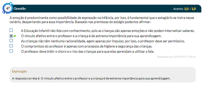 Educação Infantil não lida com pois as crianças são apenas emoções e não podem internalizar saberes. vínculo afetivo entre professor e a criança é de extrema importância para sua aprendizagem. As crianças não têm nenhuma agem apenas por impulso, por isso, professor deve ser permissivo. compromisso do professor é apenas com processos de higiene e segurança das crianças. professor deve inibir choro e riso das crianças para que elas aprendam a utilizar a fala. a) Apenas a afirmativa II está correta. b) Apenas as afirmativas I e III estão corretas. c) Apenas as afirmativas II e IV estão corretas. d) Apenas as afirmativas II e V estão corretas. e) Apenas a afirmativa II está incorreta.