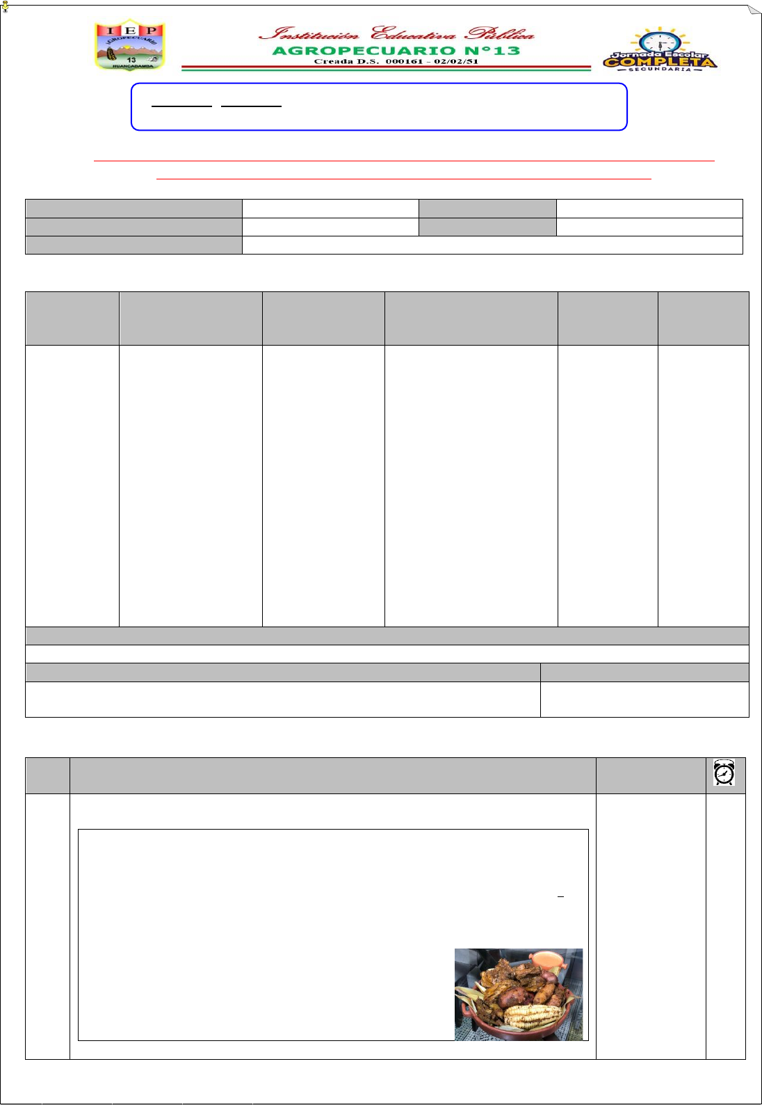 EDA N° 01: “EDA N° 03: “CELEBRAMOS A NUESTROS PADRES Y VALORAMOS SU ROL FUNDAMENTAL EN LA FORMACIÓN DE HIJOS(AS) CON VALORES” SESIÓN DE APRENDIZAJE N° 01: “RESOLVEMOS DIVERSAS SITUACIONES EMPLEANDO LA RELACIÓN DE ORDEN CON FRACCIONES” Área Matemática Grado y Sección 3° “A,B,C” Fecha 29 – 05 - 2023 Duración 90 min Docente LIZBETH CHASQUERO HUAMAN I. APRENDIZAJE ESPERADO: Competencia Capacidades Desempeños precisados Criterios de Evaluación Evidencia de aprendizaje Instrumento de Evaluación Resuelve problemas de cantidad - Traduce cantidades a expresiones numéricas. - Comunica su comprensión sobre los números y las operaciones. - Usa estrategias y procedimientos de estimación y cálculo. - Argumenta afirmaciones sobre las relaciones numéricas y las operaciones. - Establece relaciones entre datos y las transforma a expresiones fraccionarias o decimales. - Emplea diversas estrategias para resolver situaciones problemáticas utilizando relación de orden con fracciones o decimales. - Halla la fracción generatriz de un decimal exacto, al momento de resolver problemas. - Halla la fracción generatriz de un decimal periódico puro, al momento de resolver problemas. - Halla la fracción generatriz de un decimal periódico mixto, al momento de resolver problemas. - Justifica la validez de sus resultados utilizando operaciones con fracciones. El estudiante resuelve diversas situaciones del cuaderno de trabajo y/o ficha de actividades, utilizando la fracción generatriz de un numero decimal. Lista de cotejo Propósito Emplear diversas estrategias de cálculo para resolver diversas situaciones utilizando la fracción generatriz de un numero decimal. Competencias transversales Enfoque transversal - Gestiona su aprendizaje de manera autónoma - Se desenvuelve en los entornos virtuales generados por las tics - Enfoque de Derechos. II. SECUENCIA DIDÁCTICA: M Estrategias Didácticas Recursos y Materiales Inicio El docente saluda a todos los estudiantes y recuerda los “Acuerdos de Convivencia”. El docente presenta la siguiente situación significativa. Carmen García, es una gran cheff Huancabambina, reconocida a nivel provincial, ella además de ser una gran cocinera es una gran madre de familia, a ella le gusta pasar tiempo con sus hijos. Por ello el último fin de semana cocino junto a sus tres hijos (Alberto, Bruno y Cesar) una deliciosa Pachamanca, si para la preparación Alberto compró 2 1 2 kg de carne de res, Bruno 2, 6̂ kg de pollo y Cesar 2, 56̂ kg de cerdo. Frente a esta situación, responde: a) ¿Cuál de los hijos ha comprado más carne? b) ¿Cuánta carne en total se ha comprado entre los tres hijos? c) ¿Qué opinión te merece la actitud de Carmen García? El docente plantea las siguientes interrogantes: ▪ Plumones ▪ Cartulinas. ▪ Lista de cotejo. 20 min EDA N° 01: “EDA N° 03: “CELEBRAMOS A NUESTROS PADRES Y VALORAMOS SU ROL FUNDAMENTAL EN LA FORMACIÓN DE HIJOS(AS) CON VALORES” a) ¿Qué conocimientos matemáticos nos ayudarán a resolver la situación significativa? El docente plantea el propósito de la sesión de aprendizaje: “Hoy emplearemos diversas estrategias de cálculo para resolver diversas situaciones utilizando la fracción generatriz de un numero decimal.” D es ar ro llo El docente formaliza el conocimiento sobre Fracción generatriz de decimales (Anexo 01 – Marco Teorico) GENERATRIZ DE UN NÚMERO DECIMAL: Para expresar una fracción como número decimal, se divide el numerador entre el denominador. Para expresar un número decimal como fracción, se procede como se detalla a continuación: Generatriz de un decimal periódico puro: Para hallar la fracción generatriz de un número decimal periódico puro, se escribe como numerador todo el número sin considerar la coma decimal, menos la parte entera, y como denominador, tantos nueves como cifras tiene el periodo. Ejemplo: El docente organiza a los estudiantes en equipos de trabajo, llama a un estudiante de cada equipo con amabilidad y les entrega una Ficha de actividades “Situación Significativa N° 01: RESOLVEMOS DIVERSAS SITUACIONES EMPLEANDO LA RELACIÓN DE ORDEN CON FRACCIONES”. Seguidamente el docente pide a los equipos que respondan las interrogantes de Ficha de actividades. El docente acompaña a cada uno de los equipos de trabajo y plantea la siguiente interrogante: ¿Qué estrategias están utilizando para resolver la situación significativa? El docente recoje los fichas de trabajo de cada equipo. ▪ Plumones ▪ Ficha de actividades. ▪ Reglas. ▪ Hoja bond A4. ▪ Lista de cotejo. 50 min C ie rr e Docente y estudiantes analizan las respuestas consignadas en la ficha de actividades. El docente anota en su lista de cotejo la participación de los estudiantes. El docente plantea las siguientes interrogantes: ¿Qué dificultades tuvimos para resolver la situación significativa? ¿Se podrá resolver de otra manera la situación significativa? ¿Para qué nos servirá lo que hemos aprendido? Finalmente, el docente pide a los estudiantes que desarrollen en sus cuadernos la tarea que se encuentra en la Ficha de actividades. - Resolver en cada caso: a) Hallar: “a + b”. Si 𝑎 𝑏 es irrecductible, además a b = 0,25 b) Hallar: “b – a”. Si 𝑎 𝑏 es irrecductible, además a b = 0,12̂ - Resolver: H = 0,1̂+0,2̂+⋯+0,5̂ 0,01̂+0,02̂+⋯+0,05̂ - Tres amigas se juntaron para cocinar una deliciosa causa, para ello María compro 𝟑, �̂� kilos de papas, Julia 𝟏, 𝟏�̂� kilos y Natalia 2,6 kilos. ¿Cuántos kilos de papa se reunió en total? ▪ Papelote. ▪ Ficha de actividades. ▪ Lista de cotejo. 20 min --------------------------------------- ---------------------------------- ---------------------------------- Mg. Jose Gabriel García Agurto Prof. Lizbeth Chasquero Huaman Prof. Edgar M. Neira Adrianzen DIRECTOR(A) DOCENTE COORDINADOR EDA N° 01: “EDA N° 03: “CELEBRAMOS A NUESTROS PADRES Y VALORAMOS SU ROL FUNDAMEN