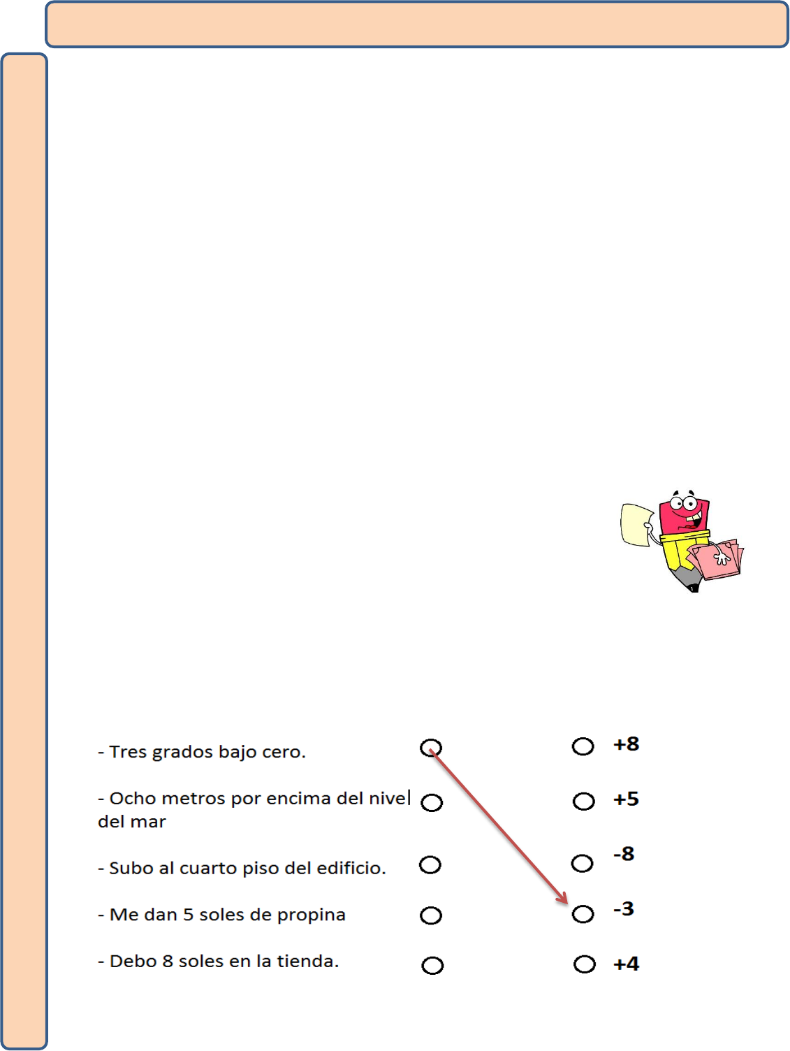 FICHA DE TRABAJO REFORZAMIENTO DE LA EXPERIENCIA 3 1.- Escriba (>) o (<), según corresponda entre cada par de números enteros: a) 14 ……… 6 b) 25 ……… 160 c) 9 ……… 17 d) 1 ……… 0 e) 199 ……… 198 f) 198 ……… 200 g) 1003 ……… 1002 h) −2 ……… 3 i) 8 ……… −54 1j) −17 ……… 16 2.- Escriba los siguientes números enteros en orden, de menor a mayor: 3, −3, 116, −6, 267, −8, −3162, 7, −17, 43, 32, −33, 2116, −668, −558, 85, 15 3.- Resolver: a) ( -25) + (-45) = f) ( -25) x (+45) = b) ( +60) + (-15) = g) ( +5) x (+50) = c) ( +25) + (+45) = h) ( -250) ÷ (-10) = d) ( -32) - (+80) = i) ( +1890) ÷ (-45) = e) ( +25) - (-100) = j) ( -312) ÷ (-26) = 3.- Une con una flecha en cada caso: ALUMNO(A):……………………………………………………………………………………………….. GRADO: ……………….. SECCIÓN:………………… 4.- Situaciones problemáticas: a) Un avión vuela a 11000 m y un submarino está a -850 m. ¿Cuál es la diferencia de altura entre ambos? b) He viajado desde Lima donde la temperatura era de 18 grados hacia Puno que la temperatura es de - 3 grados. ¿Cuál ha sido la diferencia de temperatura? ALUMNO(A):……………………………………………………………………………………………….. GRADO: ……………….. SECCIÓN:…………………