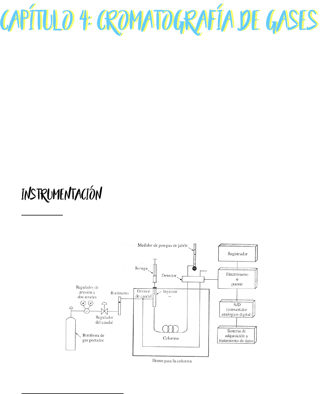 Permite el análisis rápido y exacto de gases, vapores líquidos e identificar los componentes individuales de las mezclas gaseosas. Inició a finales de 1952 y se ha desarrollado notablemente en separación, identificación y determinación de compuestos volátiles (gases y líquidos) de puntos de ebullición de hasta 350-400°C. El método tiene las ventajas de ser sensible, rápido y sencillo, y si se maneja con suficiente cuidado, suministra información cuantitativa exacta con cantidades muy pequeñas de muestra. En cromatografía de gases (GC) la muestra se volatiliza y se inyecta en la cabeza de una columna cromatográfica. La elución se produce por el flujo de un fase móvil de un gas inerte a diferencia de los otros tipo de cromatografía, la fase móvil no interacciona con la moléculas del analito; su única función es la de transportar el analito a través de la columna. Existen dos tipos de cromatografía de gases: la cromatografía Gas-Sólido (GCS) y la cromatografía gas líquido (GLC). Gas portador. Entre los gases portadores deben ser químicamente inertes, se encuentran el helio, nitrógeno y el hidrógeno, con el suministro de gas se encuentran asociados los reguladores de presión, manómetros y medidores de caudal. Además el sistema de gas portador contiene a menudo un tamiz molecular para eliminar el agua u otras impurezas. Figura 1. Regulador de presión de dos niveles. Sistema de inyección de muestra. La eficacia de la columna requiere que la muestra sea de un tamaño adecuado y que sea introducida como un tapón de vapor, la inyección lenta de las muestras demasiado grandes provoca un ensanchamiento de las bandas y una pobre resolución. El método más común de inyección de muestra implica el uso de una micro jeringa para inyectar una muestra líquida o gaseosa a través de un diafragma o de goma de silicona en una cámara de vaporización instantánea situada en la cabeza de la columna (la cámara demuestra normalmente está unos 50°C por encima del punto de ebullición del componente menos volátil de la muestra. Configuración de la columna y del horno para la columna. En cromatografía de gases se usan dos tipos generales de columnas, las rellenas, y las abiertas o capilares. La temperatura de la columna es una variable importante para que un trabajo preciso ha de regularse a las décimas de grado, por ello la columna normalmente se introduce dentro de un horno de temperatura controlada , la temperatura óptima de la columna depende del punto de ebullición de la muestra y del grado de separación requerida. Sistemas de detección. El detector ideal para cromatografía de gases tiene las siguientes características: 1. Sensibilidad adecuada 2. Buena estabilidad y reproducibilidad 3. Respuesta lineal para los solutos que se extienda a varios órdenes de magnitud 4. Intervalo de temperaturas de trabajo comprendido desde la temperatura ambiente hasta al menos 400°C 5. Tiempos de respuesta cortos que sean independientes del caudal 6. Alta fiabilidad y manejo sencillo 7. Respuesta semejante para todos los solutos o por el contrario una respuesta selectiva y altamente predecible para uno o más tipos de soluto 8. No destructivo de la muestra. Tipos de Columnas. Existen dos tipos de columnas, principalmente, de relleno y capilares o semi capilares. Contiene la fase estacionaria y en ella tiene lugar la separación cromatográfica. Las columnas de relleno suelen ser de cobre, acero inoxidable, aluminio, vidrio y teflón; con un diámetro interior entre 2 y 4 mm y una longitud entre 2 y 3 m. La eficacia está en torno a 1.000-2.000 (platos teóricos/m). Suelen emplearse para muestras poco complejas, máximo 10 componentes. La columna está rellena de un material sólido (soporte), finamente dividido y homogéneo; recubierto, por una capa de 0,05-1 μm de espesor, de fase estacionaria líquida. Está configurada en forma helicoidal, con un diámetro de unos 15 cm, para poder ser instalada en el horno termostatizado. Fase estacionaria. La elección de la fase estacionaria de una columna cromatográfica ha de reunir una serie de requisitos como: ● Baja volatilidad, su punto de ebullición debe de ser por lo menos 100°C superior a la temperatura máxima de operación de la columna. ● Estabilidad térmica. ● Cromatografía de gases. ● Inercia química. ● Los valores del factor de capacidad (k´) y del factor de selectividad (α) de los analitos deben estar dentro de los intervalos aconsejados. Columnas capilares. Las columnas capilares son de dos tipos básicos: WCOT, de pared recubierta y SCOT, de soporte recubierto. Las WCOT son simplemente tubos capilares donde la pared interna se ha recubierto con una finísima capa de fase estacionaria. Las columnas SCOT tienen en su parte interna una fina capa de material adsorbente como el empleado en las columnas de relleno donde se ha adherido la fase estacionaria. Las ventajas de las SCOT frente a las WCOT es la mayor capacidad de carga de esta última, ya que en su fabricación se emplean mayores cantidades de fase estacionaria, al ser la superficie de intercambio mayor. Por orden de eficacia, en primer lugar están las WCOT, luego las SCOT y por último las columnas de relleno. Se produce la retención de los analitos en una fase estacionaria sólida como consecuencia de la absorción física. Esta técnica no ha encontrado una gran aplicación excepto para la separación de ciertas especies gaseosas de bajo peso molecular debido a la retención semipermanente de las moléculas activas o polares y a la obtención de picos de elución con colas muy significativas (como consecuencia del carácter no lineal del proceso de adsorción). La cromatografía gas-sólido se basa en la adsorción de sustancias gaseosas sobre superficies sólidas. Los coeficientes de distribución son generalmente mucho mayores que en el caso de la cromatografía gas-líquido. En consecuencia la cromatografía gas- sólido es útil p