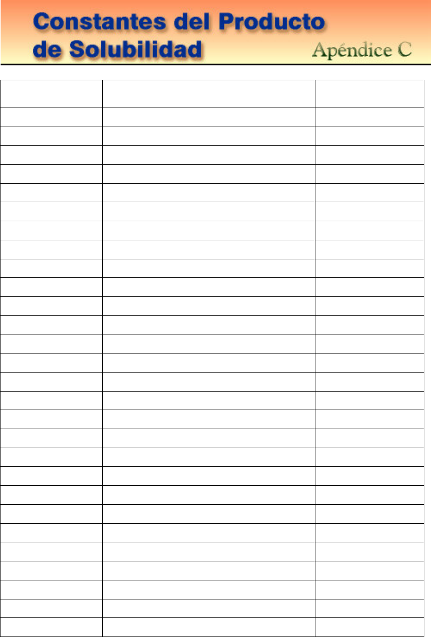 Compuesto Nombre Kps AgBr Bromuro de plata 5 × 10-13 AgCl cloruro de plata 1,8 × 10-10 AgI yoduro de plata 8,3 × 10-17 AgBrO3 bromato de plata 4 × 10-5 AgIO3 yodato de plata 3,0 × 10-8 Ag2S sulfuro de plata 2,1 × 10-49 Ag3PO4 fosfato de plata 1,3 × 10-20 Ag2CO3 carbonato de plata 6,2 × 10-12 Ag2Cr2O7 dicromato de plata 2,7 × 10-11 Ag2SO4 sulfato de plata 1,6 × 10-5 Ag3AsO4 arseniato de plata 1,0 × 10-22 AgCN cianuro de plata 1,2 × 10-16 Ag2CrO4 cromato de plata 1,9 × 10-12 Al(OH)3 hidróxido de aluminio 5 × 10-33 AuCl cloruro de oro(I) 2,0 × 10-13 AuCl3 cloruro de oro(III) 3,2 × 10-25 BaCO3 carbonato de bario 8,1 × 10-9 BaC2O4 oxalato de bario 1,7 × 10-7 BaCrO4 cromato de bario 1,2 × 10-10 BaF2 fluoruro de bario 2,4 × 10-5 Ba(IO3)2 yodato de bario 6,0 × 10-10 Ba(OH)2 hidróxido de bario 5 × 10-3 BaSO4 sulfato de bario 1,1 × 10-10 Be(OH)2 hidróxido de berilio 2,0 × 10-18 Bi2S3 sulfuro de bismuto(III) 3,0 × 10-96 CaCO3 carbonato de calcio 4,8 × 10-9 CaC2O4 oxalato de calcio 2,6 × 10-9 CaCrO4 cromato de calcio 7,1 × 10-4 Apéndice C 352 CaF2 fluoruro de calcio 4,0 × 10-11 Ca(OH)2 hidróxido de calcio 5,5 × 10-6 Ca3(PO4)2 fosfato de calcio 2,0 × 10-29 CaSO4 sulfato de calcio 2,0 × 10-4 CdCO3 carbonato de cadmio 5,2 × 10-12 Cd(OH)2 hidróxido de cadmio 2,5 × 10-14 CdS sulfuro de cadmio 1,6 × 10-28 CeF3 fluoruro de cerio(III) 8 × 10-16 Ce(IO3)3 yodato de cerio(III) 3,5 × 10-10 Ce(OH)3 hidróxido de cerio(III) 1,5 × 10-20 CoCO3 carbonato de cobalto(II) 1,4 × 10-13 Co(OH)2 hidróxido de cobalto(II) 1,6 × 10-15 CoS sulfuro de cobalto(II) 5 × 10-22 CrF3 fluoruro de cromo(III) 6,6 × 10-11 Cr(OH)3 hidróxido de cromo(III) 7 × 10-31 CuBr bromuro de cobre(I) 6 × 10-9 CuCO3 carbonato de cobre(II) 1,4 × 10-10 CuCl cloruro de cobre(I) 1,2× 10-6 CuI yoduro de cobre(I) 1 × 10-12 Cu(OH)2 hidróxido de cobre(II) 2,2 × 10-20 Cu3(PO4)2 fosfato de cobre(II) 1,3 × 10-37 CuS sulfuro de cobre(II) 4 × 10-36 FeCO3 carbonato de hierro(II) 3,2 × 10-11 Fe(OH)3 hidróxido de hierro(III) 4,0 × 10-38 Fe(OH)2 hidróxido de hierro(II) 8,0 × 10-16 FeS sulfuro de hierro(II) 4 × 10-17 Gd(OH)3 hidróxido de gadolinio(III) 1,8 × 10-23 Hg2Br2 bromuro de mercurio(I) 1,3 × 10-22 Hg2C2O4 oxalato de mercurio(I) 2 × 10-13 Hg2Cl2 cloruro de mercurio(I) 1,3 × 10-18 Hg2I2 yoduro de mercurio(I) 3,2 × 10-28 Hg(OH)2 hidróxido de mercuurio(II) 3,0 × 10-26 HgS sulfuro de mercurio(II) 1,6 × 10-54 LaF3 fluoruro de lantano(III) 4 × 10-17 MgCO3 carbonato de magnesio 1 × 10-5 Constantes del Producto de Solubilidad 353 MgC2O4 oxalato de magnesio 8,6 × 10-5 MgF2 fluoruro de magnesio 7,1 × 10-9 Mg(OH)2 hidróxido de magnesio 1,8 × 10-11 MnCO3 carbonato de manganeso(II) 1,8 × 10-11 Mn(OH)2 hidróxido de manganeso(II) 1,9 × 10-13 MnS sulfuro de manganeso(II) 1 × 10-5 NiCO3 carbonato de níquel(II) 6,6 × 10-9 Ni(OH)2 hidróxido de níquel(II) 1,6 × 10-14 NiS sulfuro de níquel(II) 3,2 × 10-19 PbCl2 cloruro de plomo(II) 1,6 × 10-5 PbBr2 bromuro de plomo(II) 9 × 10-6 PbCO3 carbonato de plomo(II) 3,3 × 10-14 PbF2 fluoruro de plomo(II) 2,7 × 10-8 PbI2 yoduro de plomo(II) 7,1 × 10-9 Pb(IO3)2 yodato de plomo(II) 1,2 × 10-13 Pb(OH)2 hidróxido de plomo(II) 1,2 × 10-15 PbS sulfuro de plomo(II) 8 × 10-28 PbSO4 sulfato de plomo(II) 1,6 × 10-8 Sb2S3 sulfuro de antimonio(III) 1,7 × 10-93 Sn(OH)2 hidróxido de estaño(II) 1,4 × 10-28 SnS sulfuro de estaño(II) 1,0 × 10-25 SrCO3 carbonato de estroncio 1,6 × 10-9 SrSO4 sulfato de estroncio 2,8 × 10-7 TlBrO3 bromato de talio(I) 8,5 × 10-5 TlCl cloruro de talio(I) 1,7 × 10-4 TlI yoduro de talio(I) 4,0 × 10-9 TlIO3 yodato de talio(I) 4 × 10-7 Tl2S sulfuro de talio(I) 5,0 × 10-22 ZnCO3 carbonato de zinc 1,4 × 10-11 Zn(OH)2 hidróxido de zinc 1,2 × 10-17 ZnS sulfuro de zinc 1,2 × 10-23 ZrF4 fluoruro de zirconio(IV) 1 × 10-3