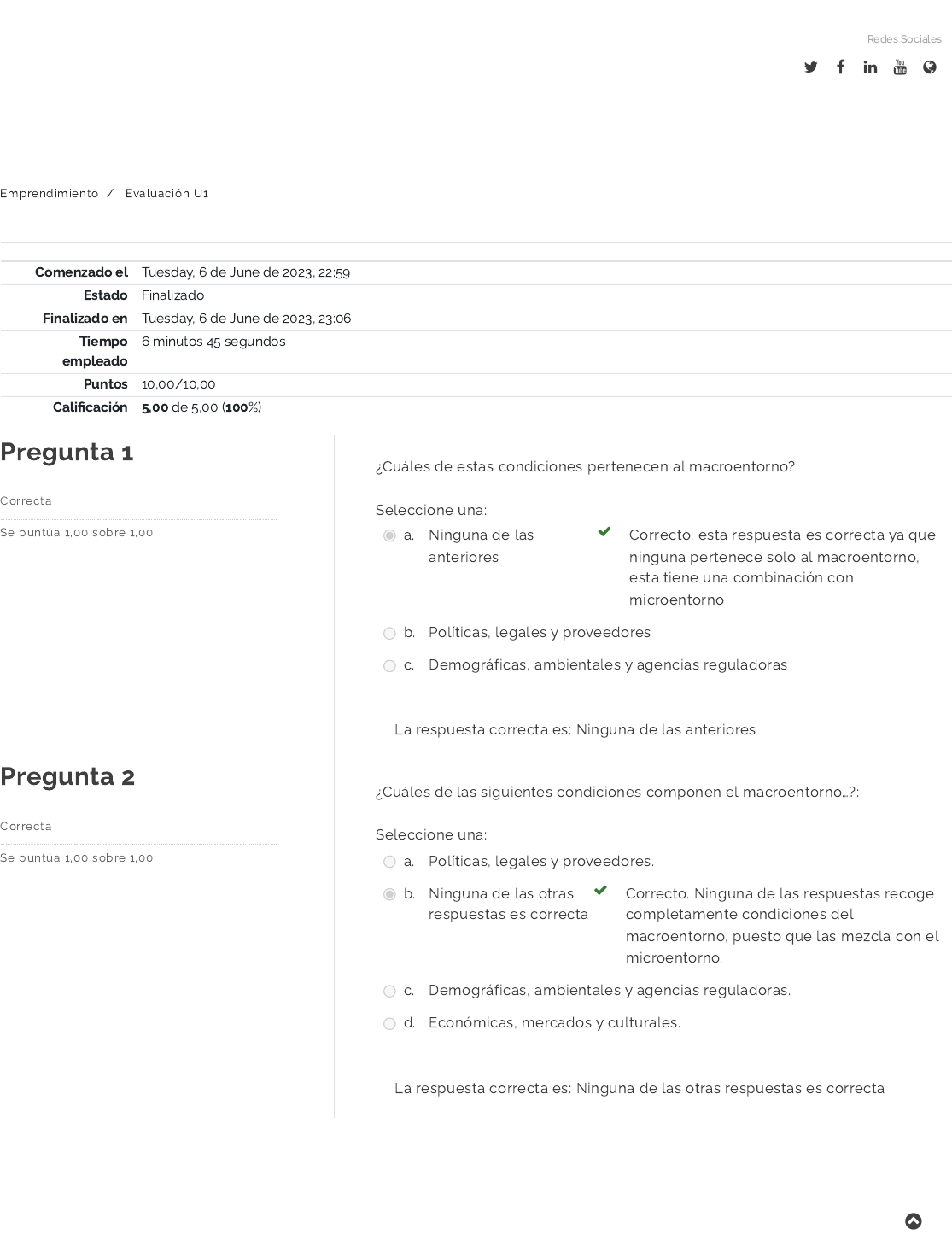 6/6/23, 23:06 Evaluación U1: Revisión del intento https://www.centro-virtual.com/campus/mod/scorm/player.php?a=1397¤torg=ORG-81B0313A-492F-10D3-0AD3-906C6E5A2B8C&scoid=2924 1/4 Redes Sociales Emprendimiento / Evaluación U1 Comenzado el Tuesday, 6 de June de 2023, 22:59 Estado Finalizado Finalizado en Tuesday, 6 de June de 2023, 23:06 Tiempo empleado 6 minutos 45 segundos Puntos 10,00/10,00 Cali�cación 5,00 de 5,00 (100%) Pregunta 1 Correcta Se puntúa 1,00 sobre 1,00 Pregunta 2 Correcta Se puntúa 1,00 sobre 1,00 ¿Cuáles de estas condiciones pertenecen al macroentorno? Seleccione una: a. Ninguna de las anteriores Correcto: esta respuesta es correcta ya que ninguna pertenece solo al macroentorno, esta tiene una combinación con microentorno b. Políticas, legales y proveedores c. Demográficas, ambientales y agencias reguladoras La respuesta correcta es: Ninguna de las anteriores ¿Cuáles de las siguientes condiciones componen el macroentorno…?: Seleccione una: a. Políticas, legales y proveedores. b. Ninguna de las otras respuestas es correcta Correcto. Ninguna de las respuestas recoge completamente condiciones del macroentorno, puesto que las mezcla con el microentorno. c. Demográficas, ambientales y agencias reguladoras. d. Económicas, mercados y culturales. La respuesta correcta es: Ninguna de las otras respuestas es correcta https://twitter.com/IEPosgrado https://www.facebook.com/SummaUniversity/?ref=br_tf https://www.linkedin.com/company/summa-university/ https://www.youtube.com/channel/UC2dSWTEhuH0dKOmlJAKjkVg/featured https://summauniversity.us/ https://www.centro-virtual.com/campus https://www.centro-virtual.com/campus/course/view.php?id=79 https://www.centro-virtual.com/campus/mod/quiz/view.php?id=4994 6/6/23, 23:06 Evaluación U1: Revisión del intento https://www.centro-virtual.com/campus/mod/scorm/player.php?a=1397¤torg=ORG-81B0313A-492F-10D3-0AD3-906C6E5A2B8C&scoid=2924 2/4 Pregunta 3 Correcta Se puntúa 1,00 sobre 1,00 Pregunta 4 Correcta Se puntúa 1,00 sobre 1,00 Pregunta 5 Correcta Se puntúa 1,00 sobre 1,00 ¿Cuáles son las variables/condiciones del Microentorno? Seleccione una: a. Proveedores, Clientes, Competidores. b. Económicas, tecnológicas, sociales, legales, culturales, políticas, demográficas y ecológicas. c. "Económicas, tecnológicas, sociales, legales, culturales, políticas, demográficas y ecológicas." y "Proveedores, Clientes, Competidores" d. Todas son correctas La respuesta correcta es: Proveedores, Clientes, Competidores. Según la secuencia del cambio propuesta en las lecturas ¿Que es el descongelamiento? Seleccione una: a. La descongelación es normalmente un proceso más lento que la congelación, puesto que la conductividad térmica de los tejidos congelados es mucho menor que la de los no congelados. b. Hacer que algo pierda el estado de congelación c. Es la etapa en la que se evidencia una insatisfacción total con la situación o estado actual del conjunto de fuerzas, Correcto: este es la definición exacta según la lectura a la La respuesta correcta es: Es la etapa en la que se evidencia una insatisfacción total con la situación o estado actual del conjunto de fuerzas, “Es la transformación de un estado anterior hasta su estado posterior que lo sucede” es una frase que se corresponde con la definición de cambio: Seleccione una: a. Verdadero Correcta. En cualquier diccionario se define el cambio de manera similar como “proceso mediante el que un determinado estado de las cosas se sucede a otro estado”. b. Falso La respuesta correcta es: Verdadero 6/6/23, 23:06 Evaluación U1: Revisión del intento https://www.centro-virtual.com/campus/mod/scorm/player.php?a=1397¤torg=ORG-81B0313A-492F-10D3-0AD3-906C6E5A2B8C&scoid=2924 3/4 Pregunta 6 Correcta Se puntúa 1,00 sobre 1,00 Pregunta 7 Correcta Se puntúa 1,00 sobre 1,00 Pregunta 8 Correcta Se puntúa 1,00 sobre 1,00 A nivel regional, los cambios se han enmarcado dentro de la conformación de grupos de países que unen sus economías, monedas y derriban fronteras: Seleccione una: a. Verdadero Correcta. Los cambios a nivel regional logran una mayor integración en los países que conforman una zona geográfica, al facilitar políticas igualitarias como unificación de monedas o economías, políticas de inmigración, derechos ciudadanos, educación, cultura y ayudas para el desarrollo. b. Falso La respuesta correcta es: Verdadero La secuencia del Cambio planeado ¿se realiza en cuántas etapas? Seleccione una: a. 6 b. 4 c. 3 La respuesta correcta es: 3 En la secuencia del cambio planeado, enunciada por Kurt Lewin, la fase de movimiento contiene alguna de estas fases: Seleccione una: a. Logro del cambio. b. Inicio del cambio. c. Todas las otras respuestas son ciertas. Correcta. La afirmación es correcta y completa, ya que las tres respuestas comprenden las tres fases solicitadas. d. Se llega a la situación más crítica. La respuesta correcta es: Todas las otras respuestas son ciertas. 6/6/23, 23:06 Evaluación U1: Revisión del intento https://www.centro-virtual.com/campus/mod/scorm/player.php?a=1397¤torg=ORG-81B0313A-492F-10D3-0AD3-906C6E5A2B8C&scoid=2924 4/4 Pregunta 9 Correcta Se puntúa 1,00 sobre 1,00 Pregunta 10 Correcta Se puntúa 1,00 sobre 1,00 Lee el siguiente artículo y responde luego a una pregunta sobre él: “Los países deben seguir manteniendo sus políticas proteccionistas con el fin de no distorsionar el mercado con una apertura total” Seleccione una: a. Falso Los países deberían desmantelar sus medidas proteccionistas, y comprometerse firmemente a no implementar políticas que distorsionen los mercados mundiales. Además, el artículo muestra que ningún país puede generar prosperidad a largo plazo para su población por sí solo. Mayor cooperación internacional e integración económica son el único camino posible. b. Verdadero La respuesta correcta es: Falso El siguiente vídeo, de Pilar Jericó, trata sobre la curva del cambio. Visu