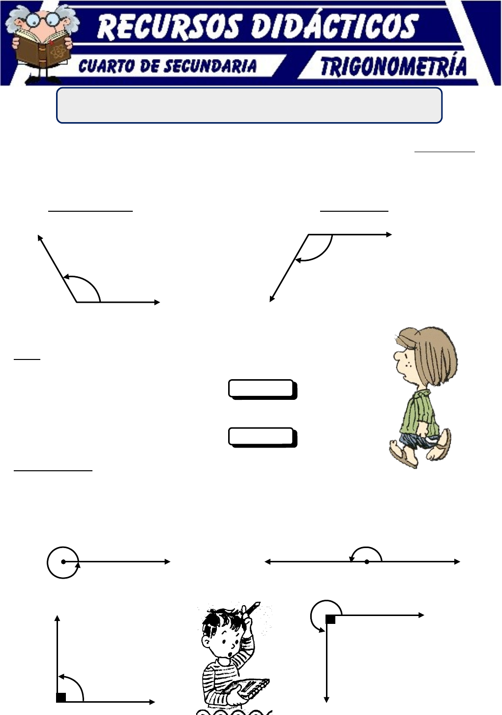 ÁNGULO TRIGONOMÉTRICO www.RecursosDidacticos.org Es aquel ángulo que se genera por la rotación de un rayo alrededor de un punto fijo llamado vértice u origen desde una posición inicial hasta otra posición final, debiendo considerar que esta rotación se efectúa en un mismo plano. Por lo tanto debemos considerar dos tipos de rotación: Sentido Antihorario Sentido Horario O Vértice Lado Final Lado Inicial Lado Final Lado Inicial Vértice O NOTA: · Si el ángulo tiene rotación antihoraria la medida del ángulo será positivo. es positivo · Si el ángulo tiene rotación horaria la medida del ángulo será negativo. es negativo OBSERVACIONES 1. Ángulo de una vuelta Es aquel ángulo generado, cuando la posición inicial y final coinciden por primera vez, luego de cierta rotación lo denotaremos como: 1v. 1v 2. Los ángulos trigonométricas son ilimitados a diferencia de la geometría. O Medida del ángulo trigonométrico < -; + > 3. Para sumar o restar ángulos trigonométricos que no se pueden realizar a simple vista debemos procurar tenerlos en un solo sentido de preferencia antihorario para ello se recomienda el cambio de sentido. G O A B O A - Cambio de Sentido Cambio de Signo EJERCICIOS DE APLICACIÓN 1. Señale la relación correcta entre y . a) + = 90º b) - = 90º c) + = -90º d) + = 0 e) - = 90º 2. Del gráfico determine x. a) 10º x + 50º b) 15º10º - x c) 25º d) 30º e) 35º 3. Calcular “x” (x + 40)º (20 – x)º a) -50 b) -100 c) -200 d) -180 e) -90 4. Hallar “x” a) x -x b) c) d) e) 5. Del gráfico hallar “x”30º- x x + 10º a) 15º b) 35º c) 55º d) 30º e) 60º 6. Del gráfico hallar “x” 10º + x 20º+x 50º - 2x a) 10º b) 30º c) 40º d) 50º e) 60º 7. Del gráfico hallar “x”; si es bisectriz. A B C O (5x-3)º (9-6x)º a) 2 b) 4 c) 6 d) 12 e) 18 8. Hallar la relación entre , y a) - - = 90º b) + - = 90º c) - + = 90º d) - - = 90º e) - - = 90º 9. Señale la relación correcta respecto a los ángulos trigonométricos mostrados. a) - = -90º b) + = 90º c) + = -90º d) - = 90º e) + = 180º 10. Señale lo correcto: a) - + = 90º b) - + = 270º c) - - = 270º d) - + = 270º e) + + = 270º 11. De acuerdo al gráfico señale lo correcto: a) + = 180º b) - = 180º c) - = 180º d) + = -180º e) + = 90º 12. Calcular el valor “x” del siguiente gráfico: x a) 2 + b) c) -2 - d) + e) - 13. A que es igual + + a partir del gráfico adjunto: a) -450º b) -360º c) -720º d) 360º e) 0º 14. De la figura expresar x en términos de y . x a) - - 360º b) + - 360º c) - + + 360º d) - - + 360º e) - - 720º 15. De acuerdo al gráfico indicar una relación entre y . a) - = 180º b) 2 + = 270º c) 2 - = 90º d) + 2 = 90º e) - 2 = 90º TAREA DOMICILIARIA Nº 1 1. Hallar “x”: a) -10º7x – 35º 25º + x b) -20º c) -30º d) -40º e) -50º 2. Del gráfico señale lo correcto: a) + = 90º b) + = 180º c) - = 90º d) - = 180º e) + = -90º 3. Del siguiente gráfico hallar “x” a) 31º(x + 3)º (9 – 2x)º b) 51º c) 62º d) 60º e) 61º 4. Hallar el valor de “x” a) 10º2x – 10º 50º - 4x b) 20º c) 30º d) 40º e) 50º 5. Del gráfico hallar la relación entre y . a) + = -120º 60º b) - = 120º c) - = 120º d) + = 120º e) + = 60º 6. Calcular el valor de x: 5x 3x -7x a) 25º b) 24º c) 22º d) 21º e) 20º 7. Hallar “x”3x+30º 30º-6x a) 10º b) 30º c) -30º d) 15º e) -10º 8. Hallar “x” x a) 90º - - b) 90º - + c) 180º + - d) 180º + + e) 180º - + 9. Del gráfico determine “x” -x 40º x a) 10º b) 15º c) 25º d) 35º e) 45º 10. Del gráfico hallar “x” 15º - x 20º + 3x 5º + x a) 18º b) 22º c) 26º d) 30º e) 34º 11. Del gráfico hallar “x” x a) + b) - c) - d) - - e) 12. Del gráfico hallar x en función de a, b y c x c a b a) 90º - a – b + c b) 90º + a + b - c c) 90º - a + b - c d) 90º + a – b + c e) 90º - a – b - c 13. Hallar “x”210º 300º x a) 155º b) 150º c) 160º d) 170º e) 175º 14. Del gráfico mostrado hallar x en función de y . a) - - 90º x b) - - 180º c) 180º - + d) - - 180º e) + - 180º 15. De acuerdo al gráfico señale lo correcto respecto a los ángulos trigonométricos mostrados. a) - = 360º b) + = 360º c) 2 + = 630º d) 2 - = 630º e) 2 - = 540º V 2 1 V 4 3 V 4 1 2 º 90 q - 2 º 90 q + 2 º 180 q - 2 º 180 q + 2 º 270 q - OC 2 q 2 b 2 b - a