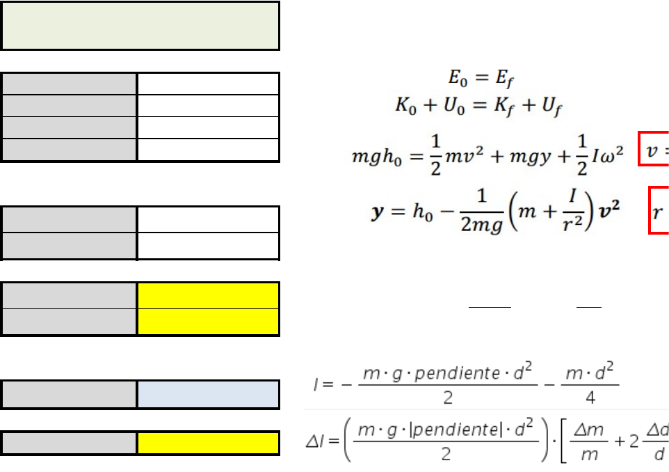 Analisis de datos Laboratorio 8: Conservación de la energía en un cuerpo rígido diámetro (m) Δdiámetro (m) masa (kg) Δmasa (kg) pendiente (s2/m) R2 I (kg·m2) 0 ΔI (kg·m2) ERROR:#DIV/0! IT (kg·m2) 2.66E-06 %E 100.0000000 ÷ ø ö ç è æ + - = 2 4 2 1 d I m mg pendiente x pendiente b y × + =